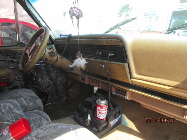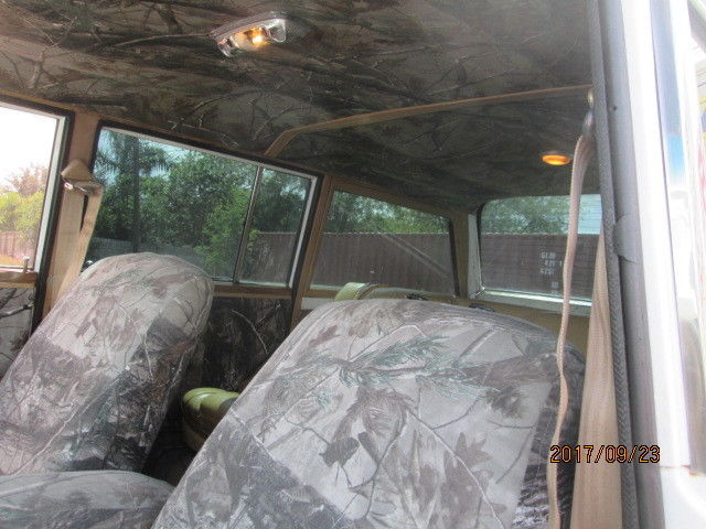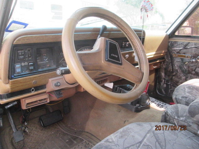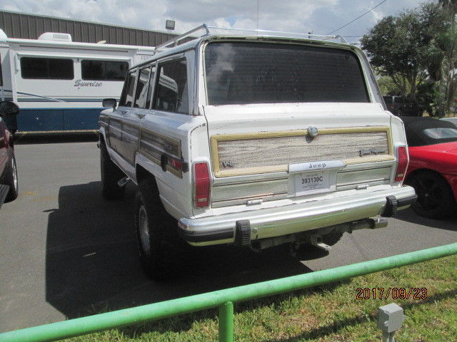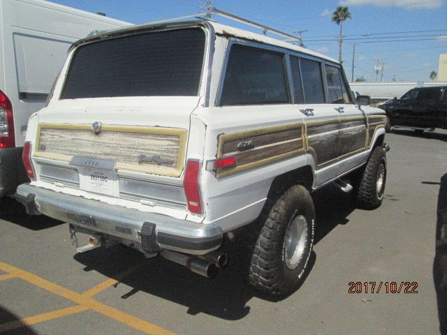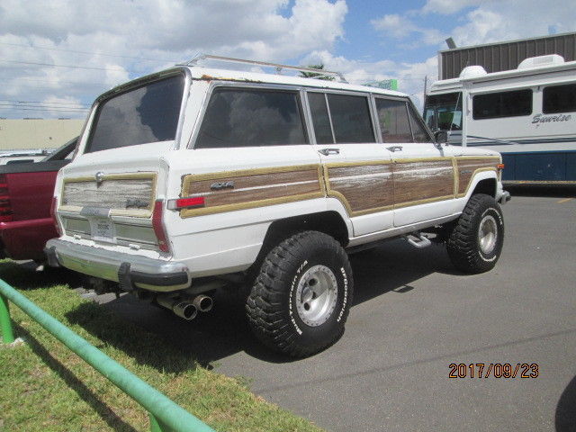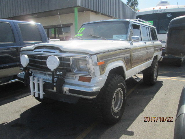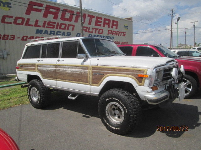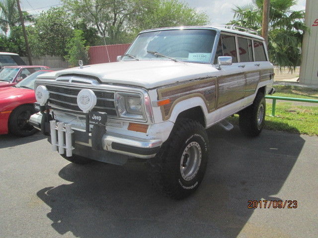 Hey there wagon master here is a cool jeep, for sale today is this 1987 jeep grand waggonee, it is from dry climate south texas and it is actually pretty clea, it does have rust on the rain drip rail see picture but that is about i, it looks like it has more because it was maroon and they painted it white so where ever the paint is chipping off you see maroo, the jeep does not show any evidence of wreck damag, it has very straight side, the wood paper sides are faded but all moldings are there and in good shape . the motor runs and sounds great, the 4 wheel drive is in tact no guarante, it has a 2 or 3 inch lift that looks good to m, it has good tires and wheels, dual exhaust that sounds good. it has the air conditioning but it does not blo, the jeep needs repainted or does it? depends on your desires. the interior was redone in camo clothe several years ago and it is dingy looking, the original leather seats are shabby under the clothe but all there , this is a cool jeep as is that is good for fun or investment . I am going to sell it LOW RESERVE any questions call jay at 956 624 266, I can help you ship i, runs and goes but no guarantee, AS-IS subject to prior sale locally
