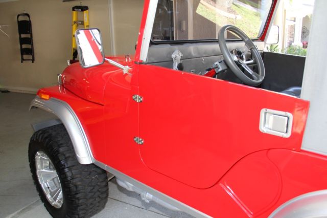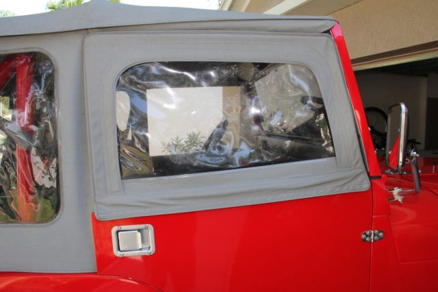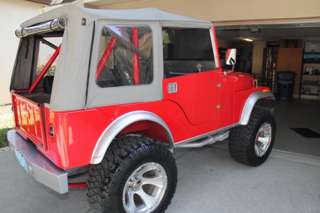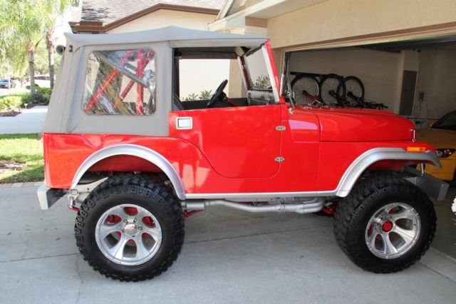 Have owned this for about two years... time to move on to another toy! I am firmly committed to moving this out of my garage so I have decided to offer this as a NO Reserve auction. Highest bidder owns it. Sold as-is where-is. Will assist with shipping. $500 PayPal deposit within 24hours, prefer cash for the balance, otherwise the Jeep and its Title will stay in my possession until funds clear my bank. Clear Florida Title in hand. The previous owner did most of the work about 10 years ago and it still shows very well. He used a high quality fiberglass body, as evident in the bodywork details. The tailgate and hood are steel. There is some surface rust on the shocks but they seem to be good, but I have never taken it offroad. Under carriage is in great shape, there is some surface rust on some items, but the frame (and everything else) is solid. The bumpers are custom and very nice, and it has nice rims and tires. Engine runs great, but I must say the engine compartment is very utilitarian (ie, not very pretty), it could use some chrome, wire management etc. It has the original AMC 304 V8. with hedman headers and flowmaster shorties and sounds sweet. It runs great but does have a few items on the to-do list that I haven't got around to. What I have done: Re-built carb (oem style 2-barrel), and replaced the distributor cap / rotor button / spark plugs at the same time and re-set the timing. I also replaced fuel pump and fuel line between pump and carb (it still has the mechanical pump on the block). I also replaced the battery once...before I realized it had an electrical issue (see below). What still needs to be done: Work out electrical issue... the radio or something is draining the battery. I have installed a battery disconnect to keep it from killing the battery. The radio doesn't work right (usually not at all) so I assume it the culprit. There is no back seat and there are no seat belts anywhere in the jeep. There is no windshield wiper motor or windshield wipers, it does have a pretty chrome motor cover. Steering is sloppy (and from what I recall...its been a long time since I drove an old cj prior to owning this one) it is sloppier than it should be. So the steering box needs to be rebuilt. |