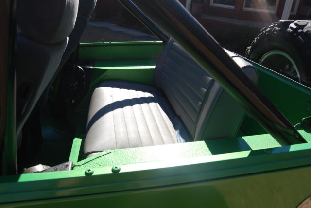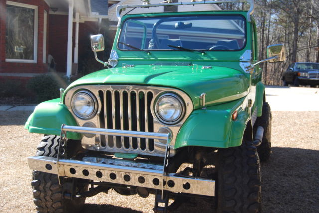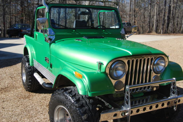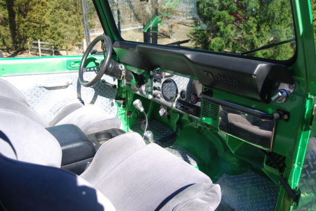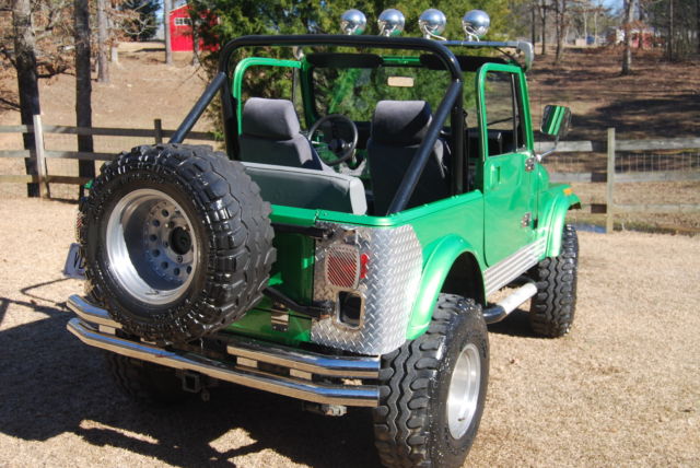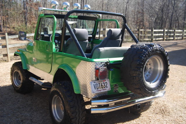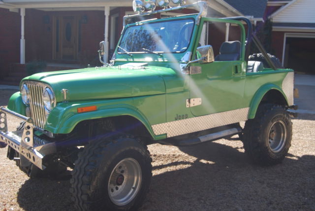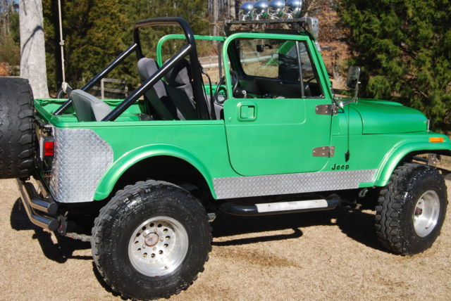 | 1986 JEEP CJ7 MANUAL 4 SPPED TRANSMISSION. 6 CYL. 258. 187. 35 MILES. 33 INCH TIRES. POWER STEERING. HEATER. NEW CLUTCH AND TRANSMISSION WAS REBUILT 6 MONTHS AGO. ENGINE RUNS GOOD. HAS MANY NEW ELECTRICAL SYSTEM COMPONETS. NEW CLUTCH LINKAGE. NO RUST. HAS 2 NEW FLOOR PLATES INSTALLED. BEFORE THE INSIDE TUB WAS SPRAYED WITH RHINO LINER. THEN THE OUTSIDE PAINT WAS SPRAYED WITH SNERGY GREEN PAINT. LOTS OF CHROME. NEW FRONT WINDSHEILD. NEW CD PLAYER WITH NEW SPEAKERS. NEW REAR BUMPER. NEW BIKINI TOP. I DO NOT HAVE A HARD OR SOFT TOP ALWAYS GARAGE KEPT. NICE CLOTH FRONT SEATS. PLENTY OF TREAD LEFT ON TIRES. NEW COIL. PLUGS AND WIRES. FRONT END HAS BEEN LINED UP. STEERING WHEEL HAS SOME PLAY IN IT. THE SMALL SIDE GLASS IS MISING ON L/H DOOR. PARKING BRAKE NOT WORKING. MAYBE THE CABLE. NO TIRE JACK. LIGHTS ABOVE WINDSHEILD NOT WORKING. THE CHROME ON THOSE LIGHTS HAS SOME RUST. NICE 86 JEEP. BRIGHT PAINT GETS ALOT OF ATTENTION. THIS IS MY PERSONEL JEEP. CAN EMAIL VIDEO OF THE ENGINE RUNNING IF NEEDED. CONTACT ME ANY QUESTIONS KEVINTRAXX@AOL. COM OR KEVIN CELL 205-388-5894 |