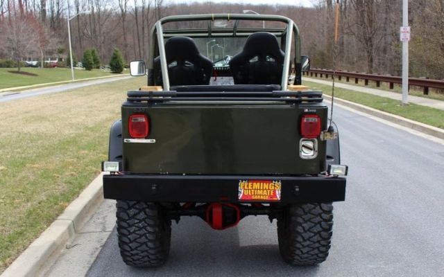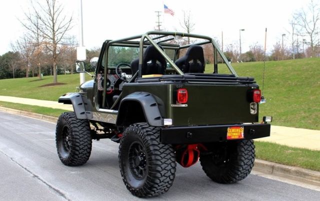 '78 JEEP CJ-7 4X4 V-8 • Pro-built, V-8 Conversion, Trail Blazin' CJ-7 • Rebuilt AMC 304cid 4-BBL conversion V-8 • 4-speed manual transmission w/ Hurst Shifter • HD Front Differential w/ Warn Locking Hubs • Heavy Duty Rear Differential w/ 4:10 Gears • Custom lift kit including new shocks, body bushings, steering linkage + front sway bar • New Fiberglas Body with mirror finished Loden Green paint + CJ-7 call outs, show waxed & detailed • Heavy Duty Steel Front... Bumper with Warn Winch • HD Steel Rear Bumper W/HD Reverse Lights • Upgraded KC Spotlights, HID Headlights • Bestop Tan Soft-Top and Removable Doors • Upgraded Turner FX Black Bucket Seats with Silver Stitching and Weapon R 4-Point Harness • Color-matched Full Roll Cage • Custom Locking Center Console with Cup-holders • Custom Diamond-Plated Aluminum Dash with Full array of Autometer White-faced gauges including 120MPH Speedo and Bosch 8K RPM Tach • Billet/Leather wrap 3-piece steering wheel • Auxiliary Cabin Heater Fan • Upgraded Kenwood AM/FM/CD/AUX/USB digital sound with Infinity Hi-Fi speakers • Show Ready Detailed Engine compartment • Optional Power Disc Brakes • Heavy Duty Power Steering • HD 18" Pro Comp Black Wheels with Massive "39 inch Mickey Thompson Baja MTZ Tires • Custom Header back dual exhaust system • Classic styling, 304 V8 Conversation, Pro Comp Suspension lift kit and the top comes off too!