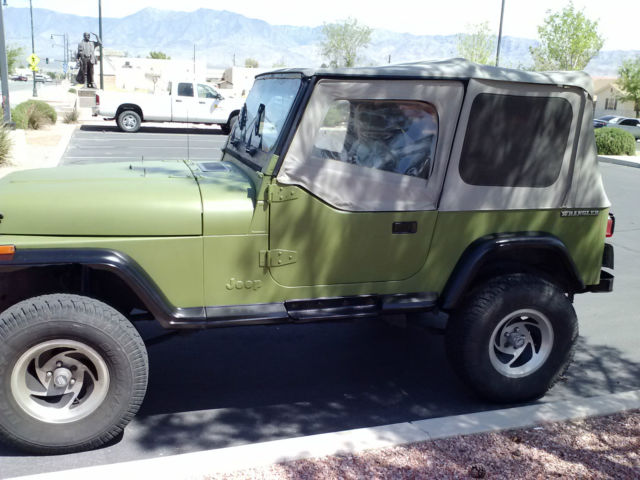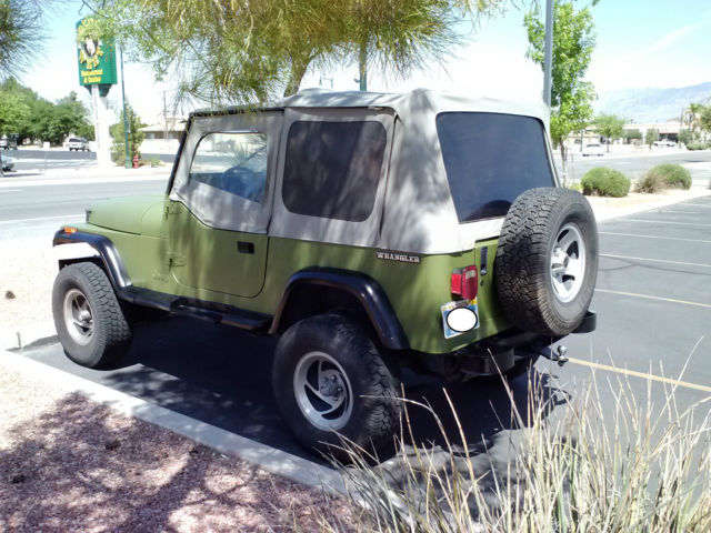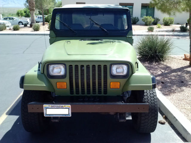 PLEASE READ ENTIRE LISTING!!!***** 1991 JEEP Wrangler "YJ" *****Current Original Mileage 135. 00 Runs Great!!! 6-cyl fuel-injected 180 hp (134 kW) 4. 0 L AMC 242 variant Auto trans. 4WD. nbsp; 2" Lift. . Air conditioning (cold)Rugged Ridge Jeep Wrangler Soft Top w/Hardware New Steel half-doors-New Battery-New Starter-Nice Rims & Good Tires. Powertrain. straight six engine. automatic transmission. transfer case & differentials all stock. Mechanically sound-Engine well maintained-Good Compression!Clean oil. No leaks & Transmission has new oil & filter and new clean Synthetic Oil in gear boxes!!! "Item is available for local pickup only" Located in Mesquite. Nevada 89027 "Jeep Wrangler 1991 Owner's Handbook Included"Wikipedia-general yj info belowThe Jeep YJ. sold as the Wrangler. replaced the much-loved but slower-selling Jeep CJ in 1986 and was built in Brampton. Ontario. Canada. until the plant closed on April 23. 1992. Production was then moved to Toledo. Ohio. using the same plant that produced the Willys Jeeps during World War II. American Motors Corporation (AMC) had designed the new Jeep to be more comfortable on-road in an attempt to attract more daily drivers. [6] It was a new design with a wider track. slightly less ground clearance. and more comfort. The YJ still had leaf spring suspension similar to that of the CJ - however the springs were wider. and the YJs sported trackbars and swaybars for improved handling. Despite the new grille. the body is very similar to that of the CJ7. and it is interchangeable with some minor modifications. The YJ also was given a larger windshield over the CJ. The YJs are easily identifiable due to the rectangular headlights. disliked by some Jeep aficionados. and the fact that the wiper blades rest on the windshield giving this version a distinctive look. The blades rested on the windshield due to the now wider arc of the blades to clean the larger windshield. These two changes were later removed when the TJ changes came about in 1996. 632. 31 YJs were built through model year 1995. although YJs were still produced into mid-1996. bringing the total production number to 685. 71 units. The YJ used a 2. 5 L AMC 150 I4 or optional 4. 2 L AMC 258 I6 until 1991. That year. a fuel-injected 180 hp (134 kW) 4. 0 L AMC 242 variant replaced the 112 hp (84 kW) 4. 2 L 258 CID straight-6. The NP207 transfer case was used only for 1987 and replaced by the NP231(selling as is)