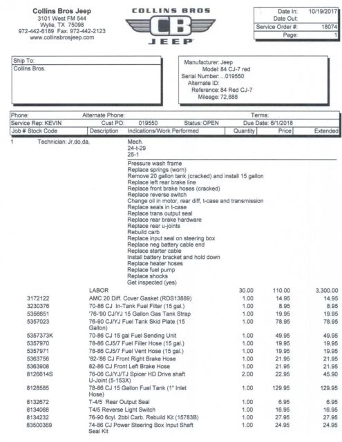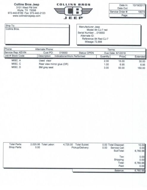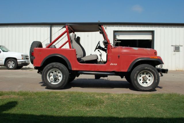 Cool Jeep CJ-7 Ranch Hunting FunJeep! 1984 Jeep CJ-7 Color code 3B Sebring Red, good solid frame and chassis from New Mexico, body is original paint with nothing to hide, something typical CJ rust spots but overall can be used as is with cool patina or a good basis for a restoration, appears to be mechanically sound, runs and drives good. We have many requests for CJ-7’s that people want to do their own build. We serviced this Jeep to the level to pass Texas State inspection. Service ticket listed here totaling $6,760.56, there was other recent work performed by prior owner. 4.2L 358 CI 6-cylinder, PS, PB, factory wheels, T-5 5 speed, seats are gray and are in good shape. Some rust in driver’s floor, minor in rocker panels and rear quarter. Miles showing 72,888 Carfax is clear but has an odometer rollover which we believe is incorrect as it would show 172,888 on odometer plus the tenths reading. Cool CJ-7 for the money First $9,800.00 gets it! Stock# 019550 At our dealership we work very hard to accurately describe our vehicles through text descriptions and elaborate photos. When you purchase a pre-owned vehicle it is not a new vehicle. Any used vehicle can have normal wear and blemishes. Before placing a bid please read the descriptions thoroughly and view all pictures. |
