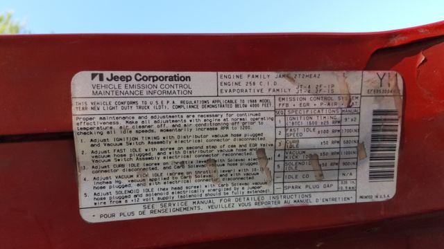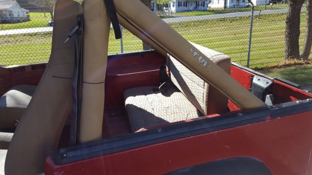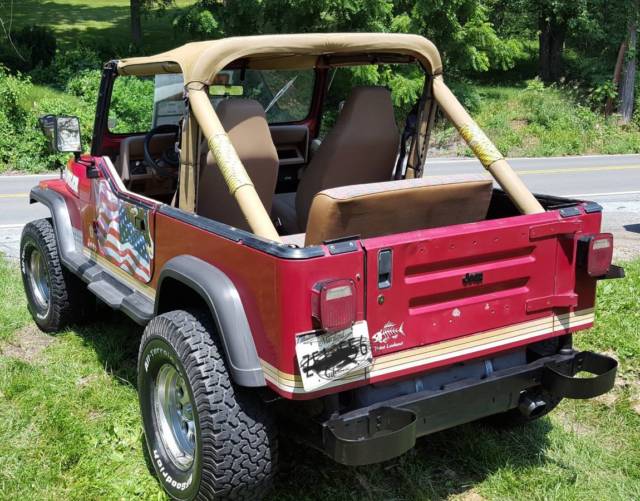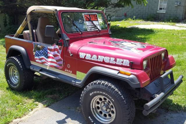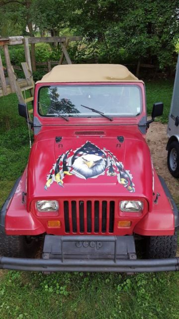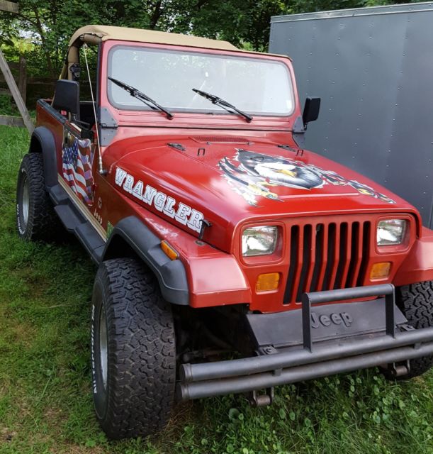 | JEEP WRANGLER '88 (YJ) - $5800 (frederick) 1988 jeep wrangler condition: goodVIN:2BCCV81K9JB509776Year of Production:1988Car Make:JeepModel of the vehicle:WranglerBody Style:SPORT UTILITY 2-DRMotor:4.2L L6 OHV 12VCountry of Production:CANADACar Trim:S Soft TopVIN number:509776Vehicle's Transmission Type:5-Speed ManualDriveline:4WDFuel Tank (gallon):15.00drive: 4wd fuel: gas paint color: red title status: clean transmission: manual This vehicle is in good running condition. There is no trouble shifting this transmission. Nice hood with eagle decal This vehicle has a clean exterior. The interior is clean and in good condition. The tires on this vehicle appear to have no wear at all. Use it with flag doors or without.As is! OBO |