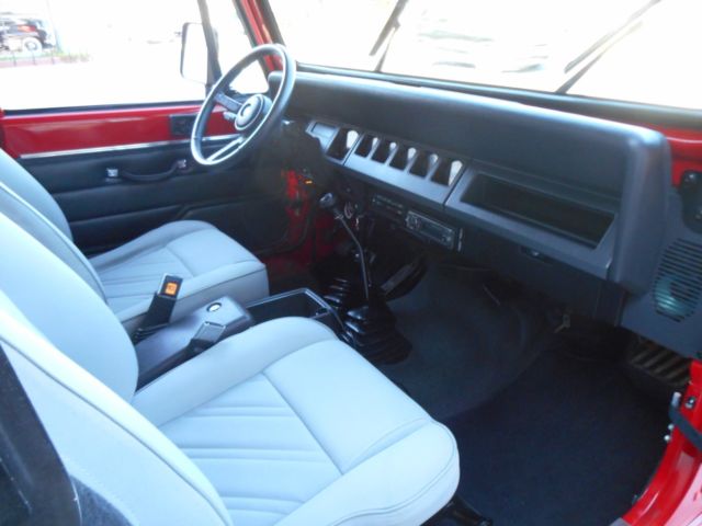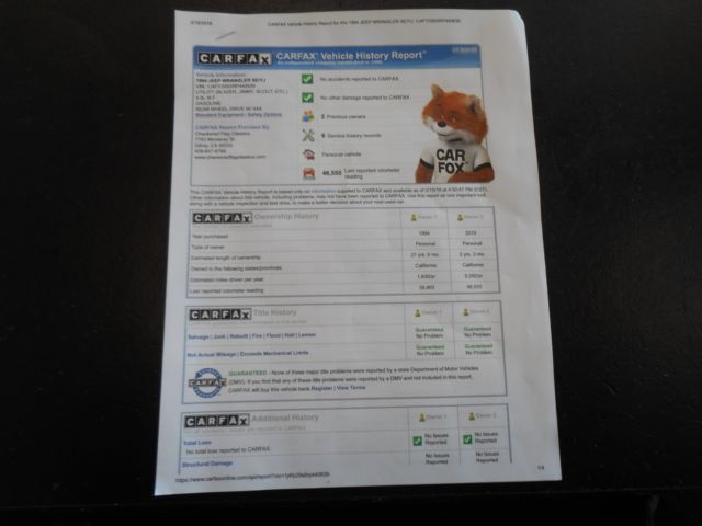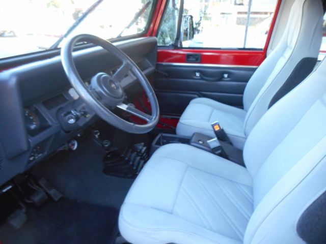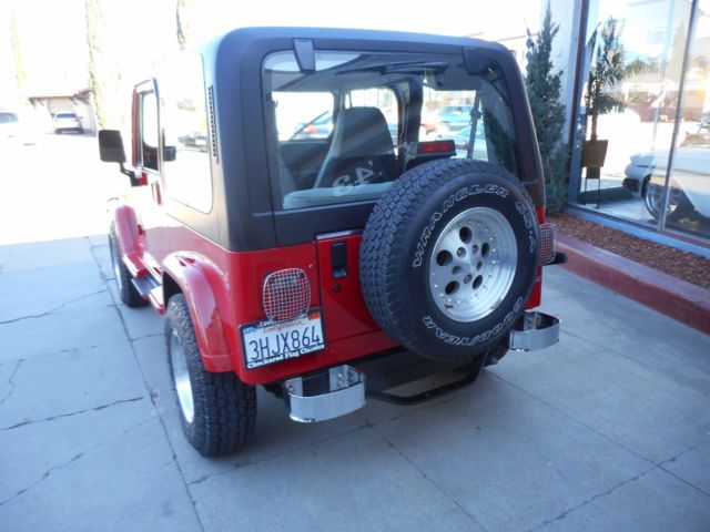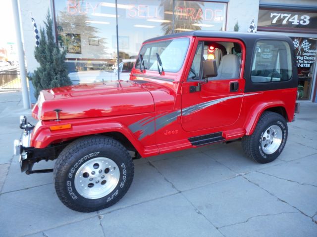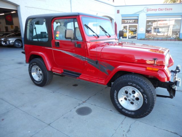 Jeep Wrangler YJ Sport 4X4 only two adult owners and only 52,870 original miles. It is equipped with all standard power options plus tilt wheel, hard top with deck cover, 1998 wheels, like new 30 inch Open Country Toyo tires, 3.73 gears, dual system after market alarm with special key, custom front grill and bumper, optional 21 gal gas tank, off road suspension (factory), high power radio with I Pod, wireless 6 disc changer, and much more. The power plant is the proven 4.0L 6 cylinder and driven by a 5 speed manual transmission. This little all around fun buggy has a clean car fax and clear California title and ready for many years of any type of driving. It is in stunning condition one of the nicest one we ever had, it runs and drives great, dependable, powerful, safe and hard to find with these miles. #440639 Now on display at the home of “over the top cars”CHECKERED FLAG CLASSICS 7743 MONTEREY ST GILROY, 408-847-8788 or 888-625-2774, sold as-is, California buyers are responsible for sales tax and license fees. Buy with confidence I am a licensed bonded California dealer.