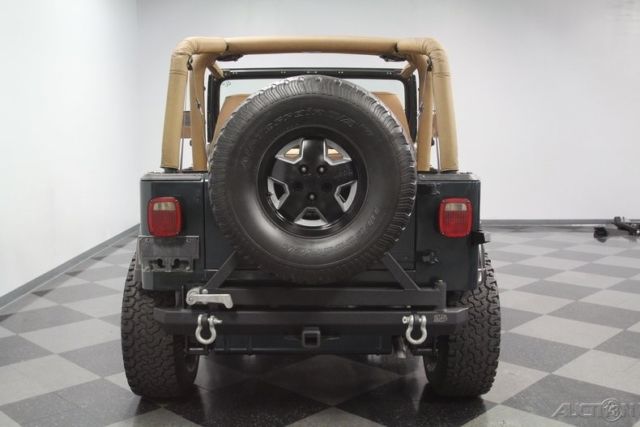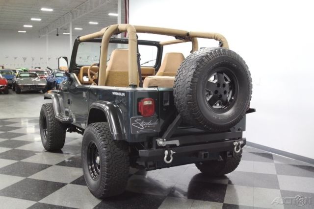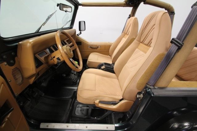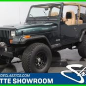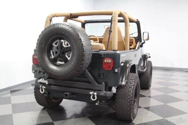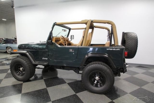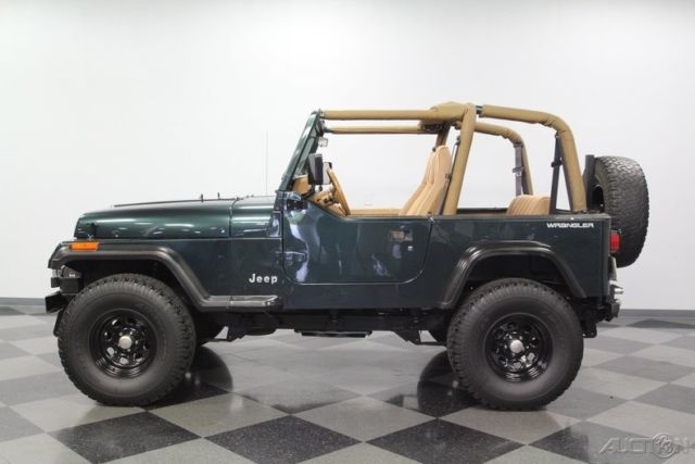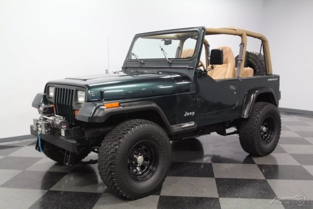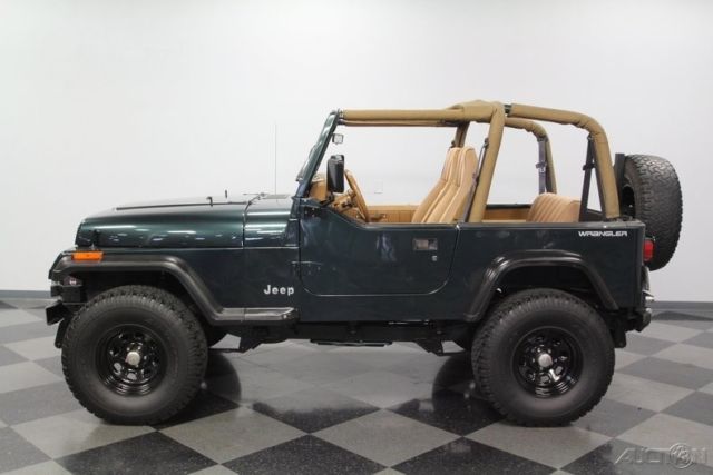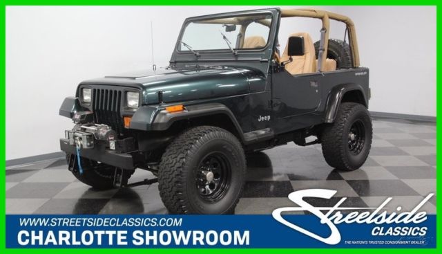 With a trail-ready look, and the right chassis upgrades to back it up, this 1994 Jeep Wrangler Sport is a 4x4 with style AND substance. You know this off-roader means business the moment you lay eyes on it. The dark green paint has a great luster in the sunshine. It also coordinates nicely with the black element of this 4x4, like the bumpers, fender flares, hood pins, full-size rear spare, and upgraded 15-inch Pacer wheels. Plus, a new top and side windows were fitted in the last couple of years, so they are crisp and dark like the rest of this presentation. This dark side also extends to this Wrangler's intimidating off-road attitude. You see it in places like the lifted stance, thick rear tow hooks, and Summit 8,000 lbs winch with bright LEDs attached. It's the kind of impressive total package that makes even a milk run look like an adventure. As good as this looks with the roof in place, a Jeep loves to be one with nature. So the tan interior against the dark green exterior has as much visual appeal as a forest full of pine trees. These Wranglers arguably had the best dash layout of any generation. The speedo and tach are are directly in front of the driver for proper ergonomics. Then the rest of the gauges spread wide across the center to remind everyone that this was a serious machine. More than just functional, this one gets the comfort factor correct with a cup holder center console, upgraded AM/FM/CD stereo, and even air conditioning to keep you cool on hot days out in the sunshine. Plus, while the interior has been upgraded with durable liner paint, there's also a carpeting kit that comes with the sale, too. Under the hood is a correct 4.0-liter motor. There was a nice investment here keeping things tidy. Plus, this inline-six was derived from the tough-as-nails AMC line of motors, and so you get durability and economy. Fuel injection only enhances this reputation. And with the added header, you can add some extra growl to this motor (it goes especially nice with the control of the five-speed manual transmission.) The 4x4 drivetrain with two-speed transfer case and BF Goodrich All-terrain T/A tires means this Jeep lives up to its go-anywhere reputation. But this also has power steering and front disc brakes to be great on the road, too (the consignor drove it two hours on the highway just to get it here.) Complete with build receipts, here's a terrific Jeep that has all the right features. When it's priced this nice, you know this is one hot deal. Call now!
