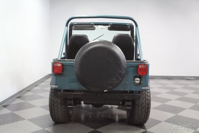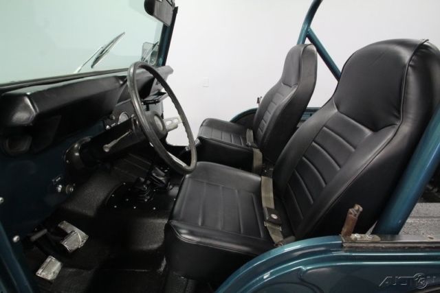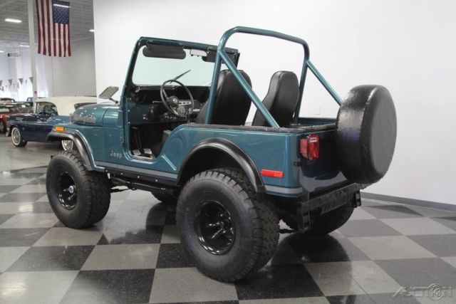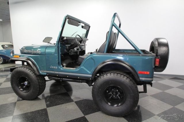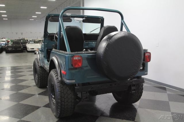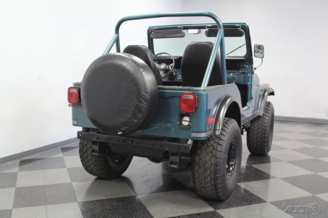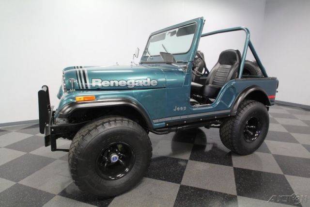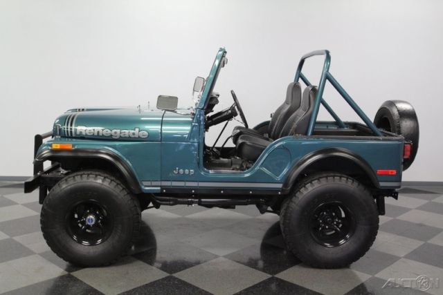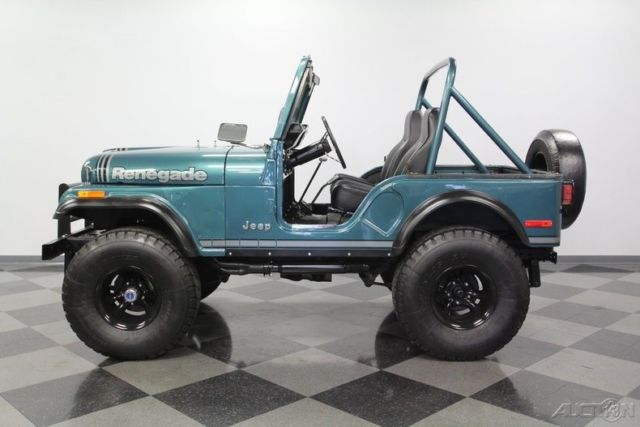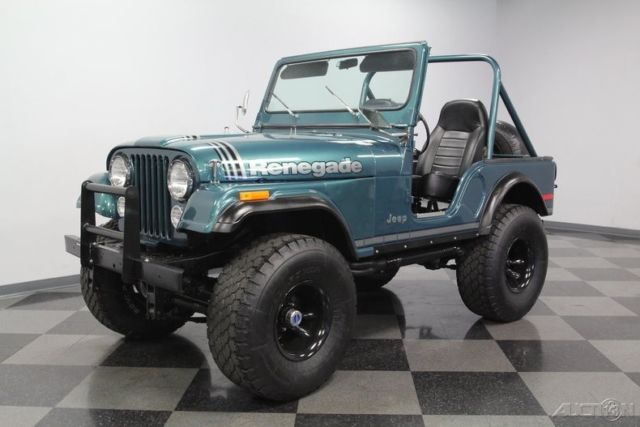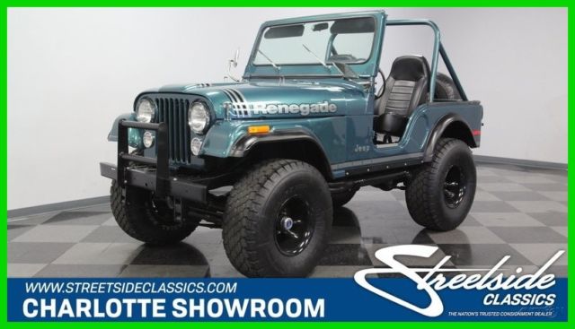With its V8 power, lifted suspension, and true 4x4 prowess, this 1979 Jeep CJ5 Renegade shouts to you, "Let's go play in the dirt!" But with the glossy paint and stylish execution it's also quite an attention-grabber in-town, too. That's why you know it's one awesome total package. This Jeep is distinctive from the first moment you lay eyes on it. The green paint has a nice deep tone that could almost blend with the pine trees. But then the sunlight hits it, and the metallic elements radiate the kind of luster that only comes from investing in a professional modern application. It's also the perfect complementing color to the full Renegade graphics package on the hood, running down the sides, and wrapping around the rear. The black stripes in this also complement the fender flares, brush guard, full-size spare, and blacked-out 15-inch wheels. Plus, the crisp Bestop doors and roof also add to this presentation when they're in place. So while we love all Jeeps for their outdoor toughness, this nicely coordinated package is a reminder that we use these to look good on grocery runs, too. The full coordination continues inside with the dash and roll bar matching the exterior green and everything else finished in a deep black. This nicely finished package is a reminder that a good Jeep spend most of its time open to the world. In fact, with the comfortable bucket seats covered in a durable vinyl, and the whole floor covered in tough liner paint, a day playing in nature can be cleaned with something as simple as a garden hose - exactly what you want in a go-anywhere Jeep. The final piece to a great Jeep is proper power. AMC's 360 V8 has the right horsepower and torque to get you into and out of trouble. As you look at the bright block paint, shining valve covers, matching air topper, new belts, and the overall fresh presentation - well then, you know they invested far more in this one than just great colors. Not only do you have V8 power, but it also does a terrific job of announcing its prowess thanks to headers that feed the growling side pipes. But don't just listen to them; follow the path in the undercarriage photos. There you'll spot a fresh presentation everywhere, including on the 4x4 transfer case. Plus, there are also nice upgrades like the coilover shocks. No matter if you're on the street or trail, you'll enjoy the full control of the V8 powerhouse with the four-speed manual transmission. Plus, there's great anytime driving features like the power steering and front disc brakes. This restored Jeep was made to go farther and look better doing it, so it's exactly what you want in a classic for so and go. Don't miss out, call today!