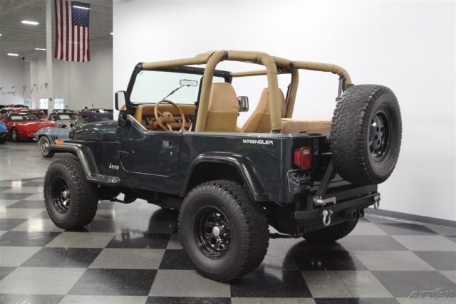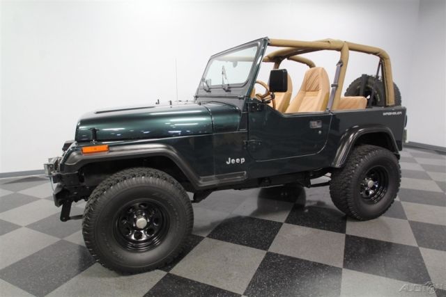 With a trail-ready look, and the right chassis upgrades to back it up, this 1994 Jeep Wrangler Sport is a 4x4 with style AND substance. You know this off-roader means business the moment you lay eyes on it. The dark green paint has a great luster in the sunshine. It also coordinates nicely with the black element of this 4x4, like the bumpers, fender flares, hood pins, full-size rear spare, and upgraded 15-inch Pacer wheels. Plus, a new top and side windows were fitted in the last couple of years, so they are crisp and dark like the rest of this presentation. This dark side also extends to this Wrangler's intimidating off-road attitude. You see it in places like the lifted stance, thick rear tow hooks, and Summit 8,000 lbs winch with bright LEDs attached. It's the kind of impressive total package that makes even a milk run look like an adventure. As good as this looks with the roof in place, a Jeep loves to be one with nature. So the tan interior against the dark green exterior has as much visual appeal as a forest full of pine trees. These Wranglers arguably had the best dash layout of any generation. The speedo and tach are are directly in front of the driver for proper ergonomics. Then the rest of the gauges spread wide across the center to remind everyone that this was a serious machine. More than just functional, this one gets the comfort factor correct with a cup holder center console, upgraded AM/FM/CD stereo, and even air conditioning to keep you cool on hot days out in the sunshine. Plus, while the interior has been upgraded with durable liner paint, there's also a carpeting kit that comes with the sale, too. Under the hood is a correct 4.0-liter motor. There was a nice investment here keeping things tidy. Plus, this inline-six was derived from the tough-as-nails AMC line of motors, and so you get durability and economy. Fuel injection only enhances this reputation. And with the added header, you can add some extra growl to this motor (it goes especially nice with the control of the five-speed manual transmission.) The 4x4 drivetrain with two-speed transfer case and BF Goodrich All-terrain T/A tires means this Jeep lives up to its go-anywhere reputation. But this also has power steering and front disc brakes to be great on the road, too (the consignor drove it two hours on the highway just to get it here.) Complete with build receipts, here's a terrific Jeep that has all the right features. When it's priced this nice, you know this is one hot deal. Call now!