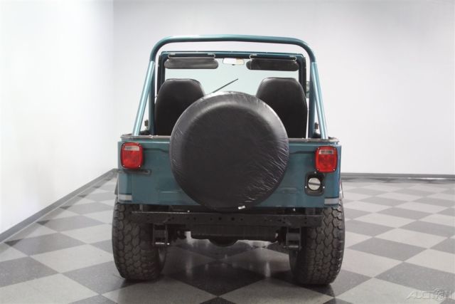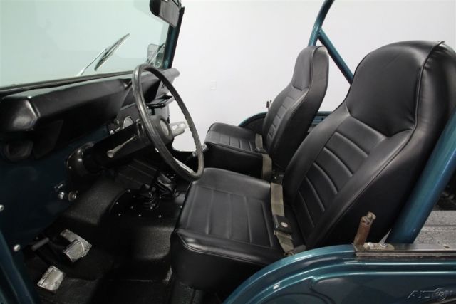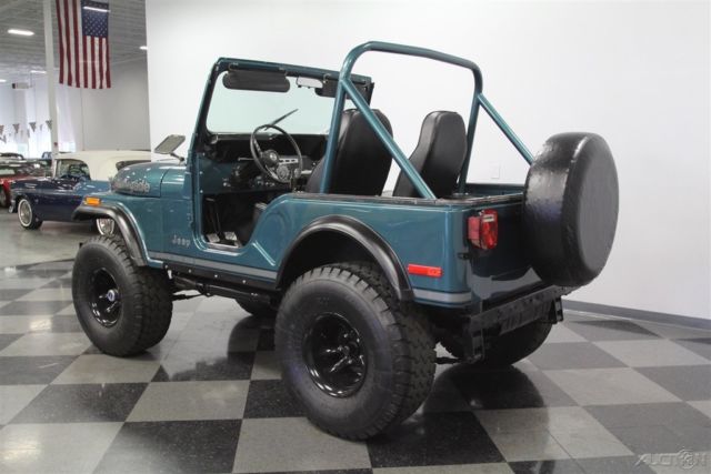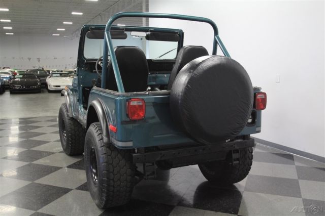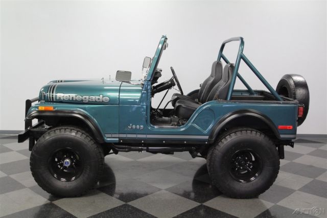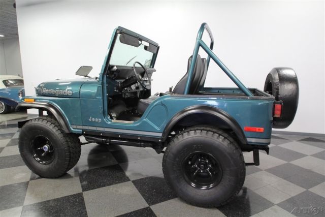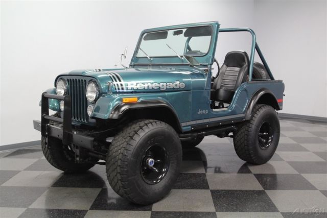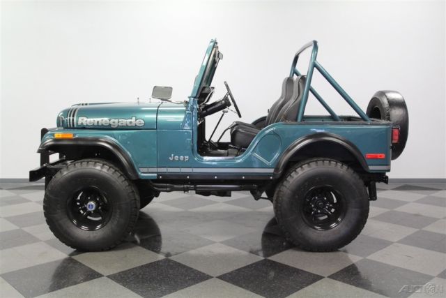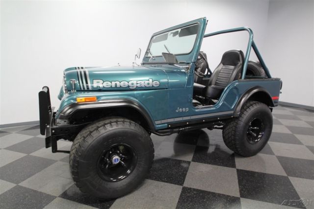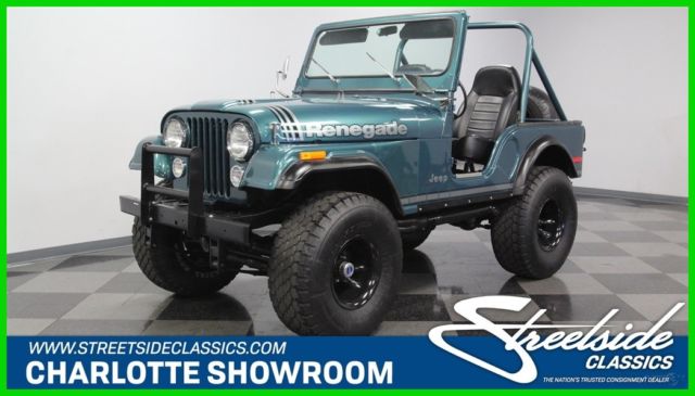With its V8 power, lifted suspension, and true 4x4 prowess, this 1979 Jeep CJ5 Renegade shouts to you, "Let's go play in the dirt!" But with the glossy paint and stylish execution it's also quite an attention-grabber in-town, too. That's why you know it's one awesome total package. This Jeep is distinctive from the first moment you lay eyes on it. The green paint has a nice deep tone that could almost blend with the pine trees. But then the sunlight hits it, and the metallic elements radiate the kind of luster that only comes from investing in a professional modern application. It's also the perfect complementing color to the full Renegade graphics package on the hood, running down the sides, and wrapping around the rear. The black stripes in this also complement the fender flares, brush guard, full-size spare, and blacked-out 15-inch wheels. Plus, the crisp Bestop doors and roof also add to this presentation when they're in place. So while we love all Jeeps for their outdoor toughness, this nicely coordinated package is a reminder that we use these to look good on grocery runs, too. The full coordination continues inside with the dash and roll bar matching the exterior green and everything else finished in a deep black. This nicely finished package is a reminder that a good Jeep spend most of its time open to the world. In fact, with the comfortable bucket seats covered in a durable vinyl, and the whole floor covered in tough liner paint, a day playing in nature can be cleaned with something as simple as a garden hose â€" exactly what you want in a go-anywhere Jeep. The final piece to a great Jeep is proper power. AMC's 360 V8 has the right horsepower and torque to get you into and out of trouble. As you look at the bright block paint, shining valve covers, matching air topper, new belts, and the overall fresh presentation â€" well then, you know they invested far more in this one than just great colors. Not only do you have V8 power, but it also does a terrific job of announcing its prowess thanks to headers that feed the growling side pipes. But don't just listen to them; follow the path in the undercarriage photos. There you'll spot a fresh presentation everywhere, including on the 4x4 transfer case. Plus, there are also nice upgrades like the coilover shocks. No matter if you're on the street or trail, you'll enjoy the full control of the V8 powerhouse with the four-speed manual transmission. Plus, there's great anytime driving features like the power steering and front disc brakes. This restored Jeep was made to go farther and look better doing it, so it's exactly what you want in a classic for so and go. Don't miss out, call today!