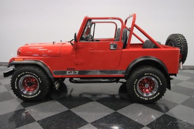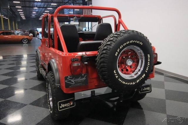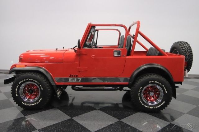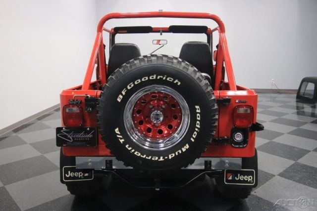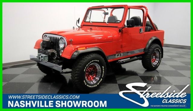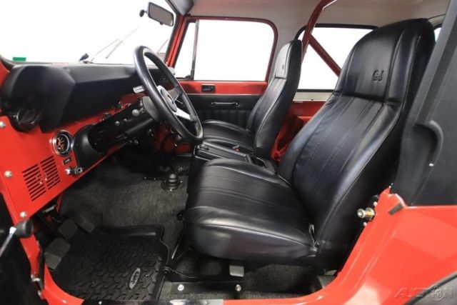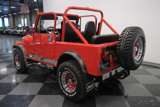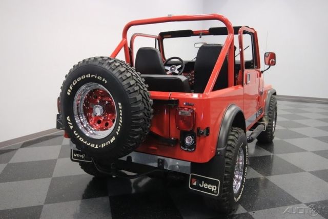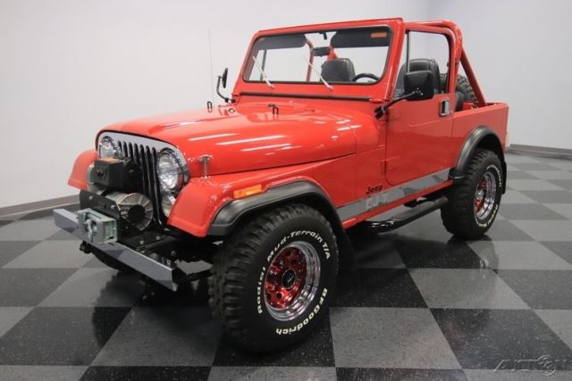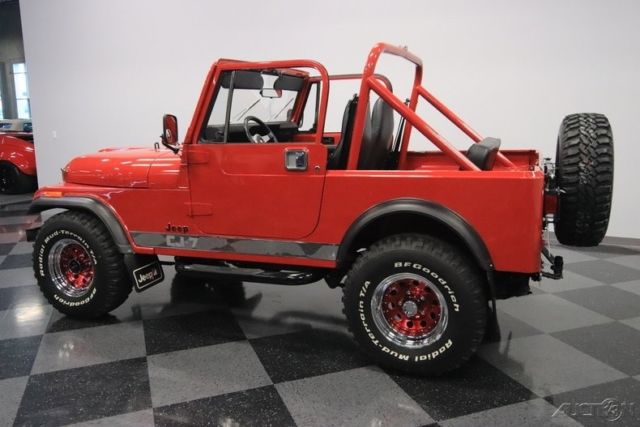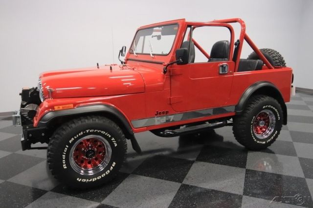 Here's a truly an amazing find. After all, this 1986 Jeep CJ7 was originally optioned to be a terrific off-road machine. But with only about 2,500 miles on the odometer (averaging less than 80 miles annually!) this is also one of the best-preserved examples you'll find anywhere. 1986 was the final year for the legendary CJ7, and so this 4x4 has been treated with the propped respect. The factory-correct Sebring Red has a terrific presentation and proper lineage. In fact, all the right pieces look great, including the fender flares and swing-away full-size spare holder. Even the rear mud flaps look like they are straight from the dealer's accessory catalog. That's what you get with an ultra-low mileage Jeep that was sold new only 20 miles from our dealership today (we even have the original window sticker to prove it!) But more than just history, you'll love this CJ for its upgrades in style and substance. The chrome grille, chrome bumpers, bright rocker trim, and metallic maroon wheels give this some terrific extra flair. Plus, there's a Warn 8,000-lb winch, tubular side steps, and trailer hitch. So while this pristine example looks like it never has left the pavement, it still has the equipment to get the job done right now. Step inside and there are more indications that this Jeep has led a good life. The interior is fairly original with some nice worthwhile upgrades. Factory bucket seats are quite comfortable, and the floor has nice carpeting for better luxury and insulation. There's a factory center console that offers the security of a locking compartment as well as the convenience of cup holders. And the dash has been optioned nicely so you get all the right gauges, including a tach. You'll also notice cool upgrades like the grippy Lecarra steering wheel, and a retro-style radio that features a digital tuner, satellite radio, and Bluetooth. The whole interior is in great condition, but of course that's the advantage of having a hardtop and steel doors that seal the cabin from bad weather. But on the days when everything is looking sunny, you can also choose this CJ's included full soft top. Under the hood is the original numbers-matching 258 cubic-inch inline-six motor. Not only is this an ultra-low mileage machine, but also the level of maintenance might have even included a rebuild. It's this respect and care over the CJ's lifetime that results in one of the freshest Jeep engine bays you'll ever see. And the original five-speed manual transmission is the perfect partner no matter if you want overdrive highway cruising or need to take full control out on the trail. In fact, speaking of off-road, this one might have an amazingly pristine undercarriage, but the stock two-speed transfer case and seriously beefy axles at both ends means it's ready for the mud. And no matter how you drive this classic Jeep, we know you're going to love showing this off. So features like power steering and front disc brakes means you can easily add miles to the ultra-low odometer. A Jeep this special needs the right paperwork to back it up. So not only do you get the window sticker, but also the factory buildsheet, original bill of sale, warranty card, owner's manual, title documentation, service manuals, and build receipts. This is an amazingly correct loaded Jeep, and so you know this is a special and fleeting opportunity. Don't miss out, call today!