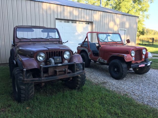 I am selling both of these jeeps together. I bought them both together and had big plans but other things demand my time and money so I just want to sell them. The first thing I will say is they are both projects! They sat for quite a while before I got them. They both have their share of rust though the red one is somewhat worse(see the pictures) The brakes don't work on either one. That being said I have had them both driving around, so they do run. I would say they both would need at least a tuneup. The lifted jeep has the inline six cylinder in it and the red one is the v8. The 6 cylinder block was cracked in the water jacket and patched with jb weld. It has held so far. I don't really know what else to say. Use the best parts from both to make one good Jeep or rebuild both of them. Let me know if you have any questions!I forgot to say I have clean titles for both of them. Also i can get more pictures if you need. I was going to post more of the red one(the undercarriage and such) but i was only allowed 24 pictures and couldnt figure out how to post more on the description;)
