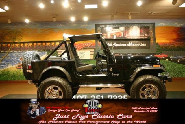 Just Toys Classic Cars is your headquarters for anything and everything Jeep. Before you here is a beautiful 1982 Jeep CJ7 that is ready to take you anywhere that you want to go. As you will see in the pics, this paint looks great from 20 feet or 2 feet. This is one that you should be proud to own. The Toyo Open Country tires have a ton of tread on them so they are great for on and off... road. Not to mention the full size spare and the chrome wheels really set this baby off. The great thing about jeeps is how many different ways you can customize them. This jeep comes the way you see it. There are no additional doors or tops, but that leaves a lot open for the next owner to customize it however they want and really put their personal touch on it. As you look in the interior you will see that the seats have been redone and look great. You will not find any rips or tears in them and they are very comfortable. A center console has been added to put all of your stuff in and you can lock it up tight as well. There has been a nice upgrade to the radio as well. Now there is a nice AM/FM/CD player to listen to all of your favorite tune going down the road or hitting the trail. Under the hood sits the torque monster 4.2 liter straight 6 engine. Everything has been gone through on it about 20,000 miles ago and this one just purrs like a kitten. This is mated to a 4 speed manual transmission and the 4x4 works just like it should. As you look at the undercarriage pics you will see that this jeep is very clean. There are disc brakes up front and drums in the rear, new shocks and struts as well really help smooth out the ride. This is just one awesome jeep that you need to own. We offer classic car financing for those that would like to take advantage of the offer. They offer great rates and terms with as little as 10% down. This way you can get the vehicle of your dreams and not have to take all of the cash out of the bank at once. Start that dream today by going to financing and follow the easy step by step directions. We look forward to speaking with you soon, and we look forward to making you the newest member of the Just Toys Classic Cars family. 1982 Jeep CJ7 4.2 liter straight 6 gone through 20k miles ago 4 speed manual tranny great tires and wheels am/fm/cd All vehicles shown by appointment