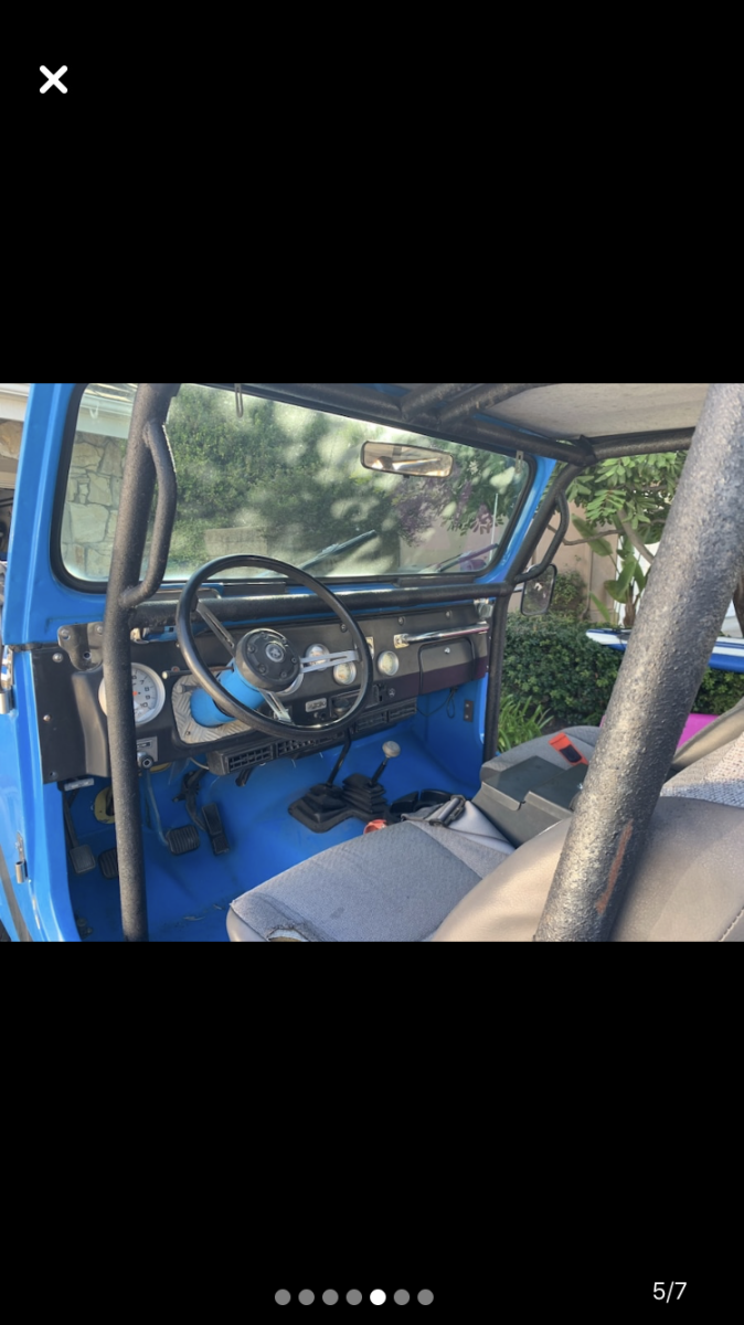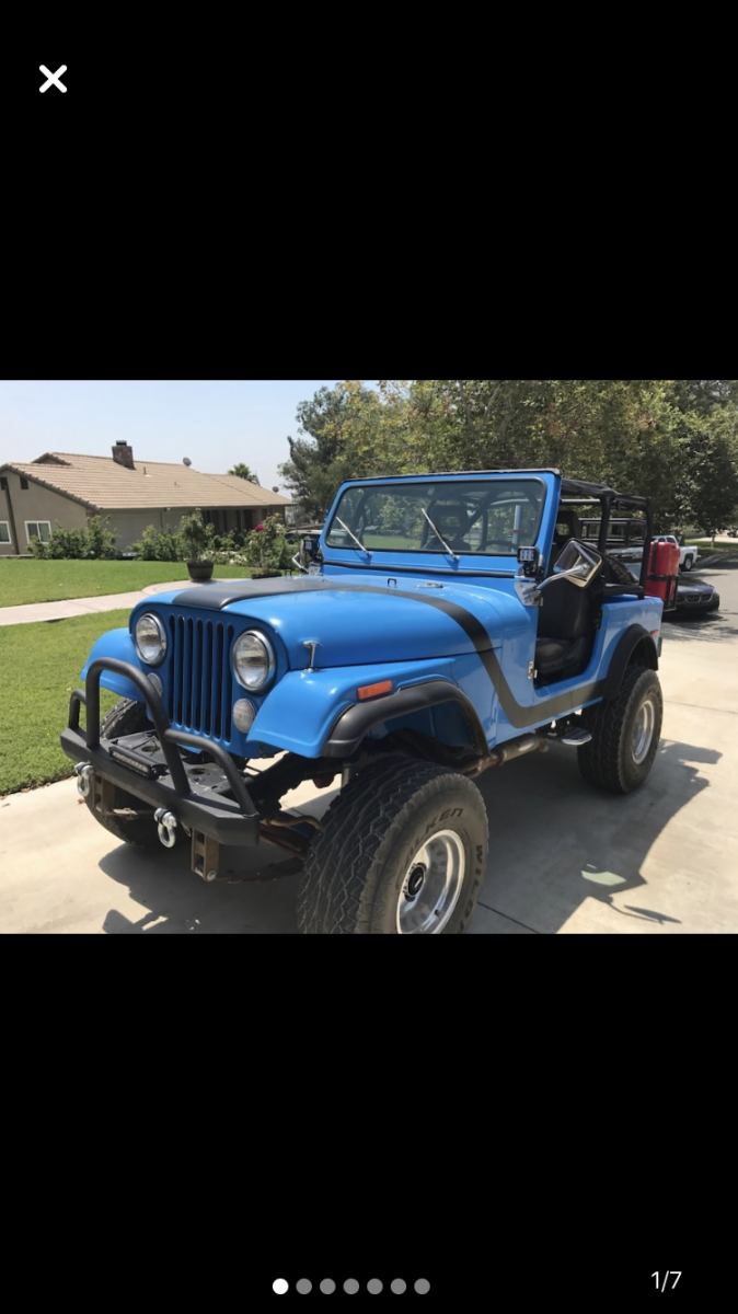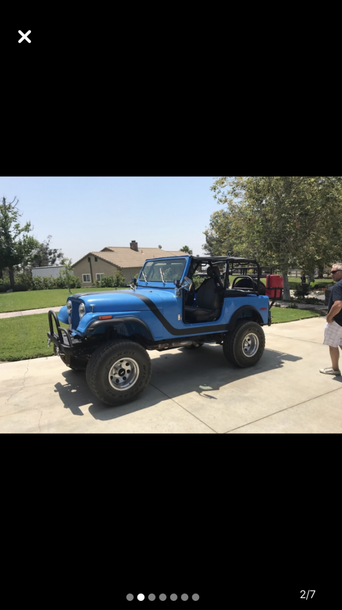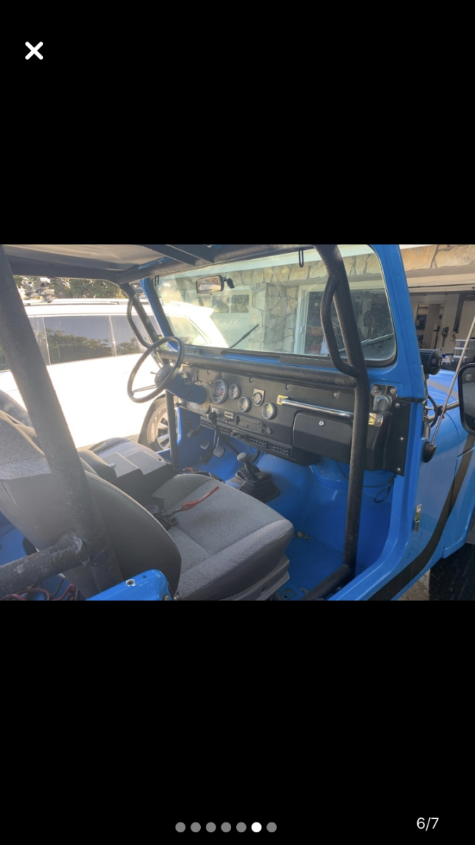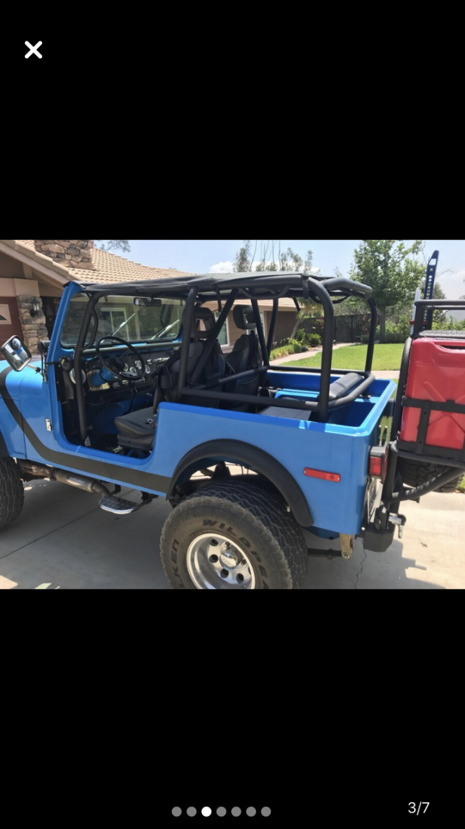 SELLING MY CLASSIC JEEP ... WAS CHRISTMAS GIFT TO MYSELF .. TOO MUCH POWER & LOUD .. GAS GUZZLER .. NOT A DAILY RIDE MY OPINION .. IT'S A MONSTER ! 1984 JEEP CJ-7AMC 360 (8 CYL.)5 SPEED MANUAL TRANSMISSION4" INCH LIFT35" TIRESPOWER STEERINGPOWER BRAKESAC (NOT WORKKING)CUSTOM GAUGESCUSTOM ROLL BARSCUSTOM BODY (FIBER GLASS / EXTRA $SPENT-WON'T RUST)CENTER LOCK BOXBESTTOP REAR SEATSPARE TIRE W. CUSTOM BRACKETHARD TOP (BROKEN GLASS ON REAR LEFT)HARD DOORS (FULL)FRONT PUMPER LED LIGHTS ETC... RUNS GOOD .. LOTS OF POWER !GOOD BRAKES /CLUTCH /TRANSMISSION /ACCELERATIONWAS SITTING FOR AWHILE .. NEW ALTERNATOR & OIL CHANGE .. BATTERY OK, ITS CHARGED FOR NOW .. I SUGGEST GETTING NEW ONE MILEAGE SHOWS 98000 .. FACTUAL I'M NOT SURE SINCE NOT 1ST OWNER ..REGISTRATION EXPIRED OCTOBER .. SMOG PROBABLY NOT PASS IN CALIFORNIA .. LEGAL IN AZ AND NV *RESPECTIVELY, CAN NOT SELL CALIFORNIA BUYERS AS WILL NOT PASS SMOG (CUSTOM 8CYL) ..*THIS CAR "SOLD-AS-IS" WITH NO WARRANTY IMPLIED OR EXPRESSED .. MY APOLOGY, NOT A DEALER TO SHARE RESPONSIBILITY ..*PLS INSPECT PRIOR TO BID FOR GREATER OBSERVATION-APPRECIATION .. NOTES ABOVE BASED ON MY KNOWLEDGE .. IT'S BUYER'S RESPONSIBILITY TO INSPECT AND OBSERVE ! |