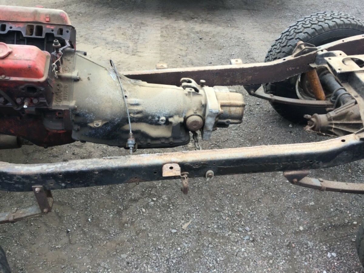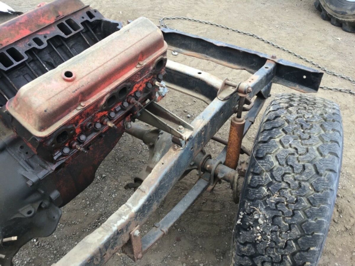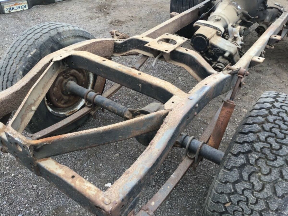 | nice military chassis axles transfer case with turbo 350 trans and adapter small block Chevy. Estate sale losing storage, condition of parts overall not known. Frame is straight and rust free. Easy pick up any size truck can forklift load |