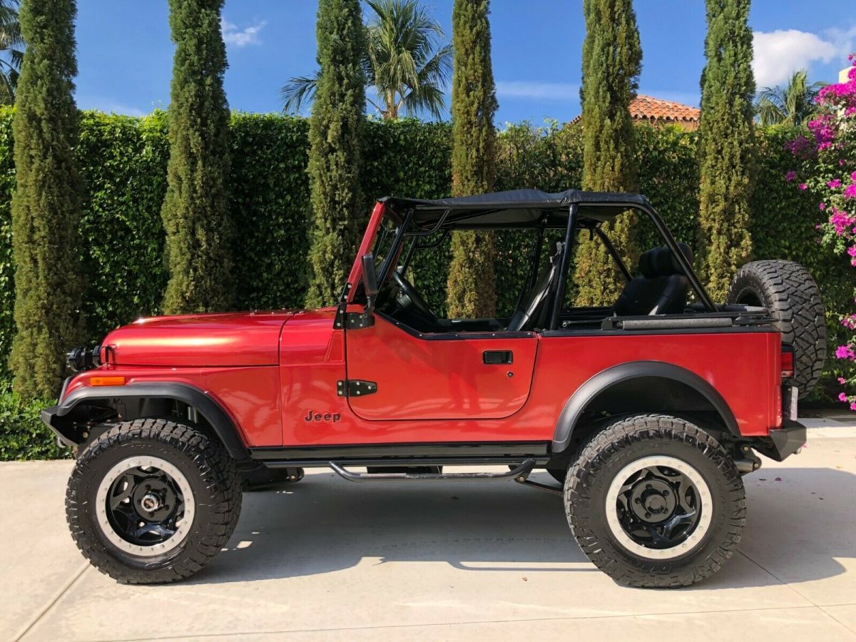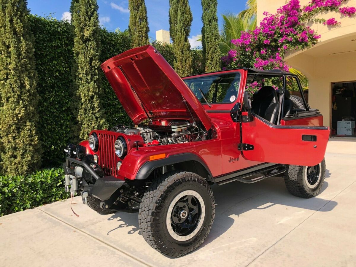 OVERRESTORED! A cost $65,000,custom restored 1985 Jeep CJ7.Only 3,253 miles since restoration. Unique and beautiful Walker and Evans custom Copper metalic,high end paint job. Custom Fit and powder coated roll bar in interior,custom carpet.Custom Beard front and rear seats with seatbelts. Bimini and Hard top included. Front high capacity Warn Winch,with front and real Tow loops, a 5.3 litre LS Crate engine,V 8 with 355 HP.Custom Engine harness with programmed computers,Custom Griffin oversized aluminum radiator.Custom audio system Pioneer DEH X6700BS head unit and custom rear speaker box's.Custom gages, cold Air conditioning,A unique add, Bestop full soft w/half door panels,custom half steel doors,added to give comfort and safety.Upgraded headlights, Smitty bumper rear tire carrier swing arm tire rack,Momo steering wheel,Lock box in armrest for radio,Larger custom mirrors,Piaa fog lights,17" wheels with 265/70/R 17 tires.Undercarriage coating,Dana 60 Rear axle,Disc Brembo brakes,Hydra boost brake system, much to remark about.Band M shifter. This is a perfect show car. Car is being sold locally and I have the right to end auction at any time. No dealers please. $1,000 deposit within 24 hours of end of auction, and balance in wire transfer within 3 days. CALL ONLY 561-301-1733 Christopher.No ebay messaging.