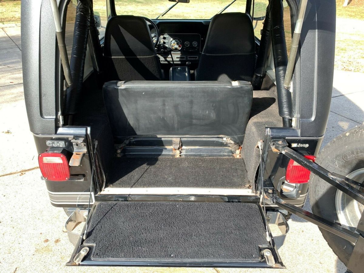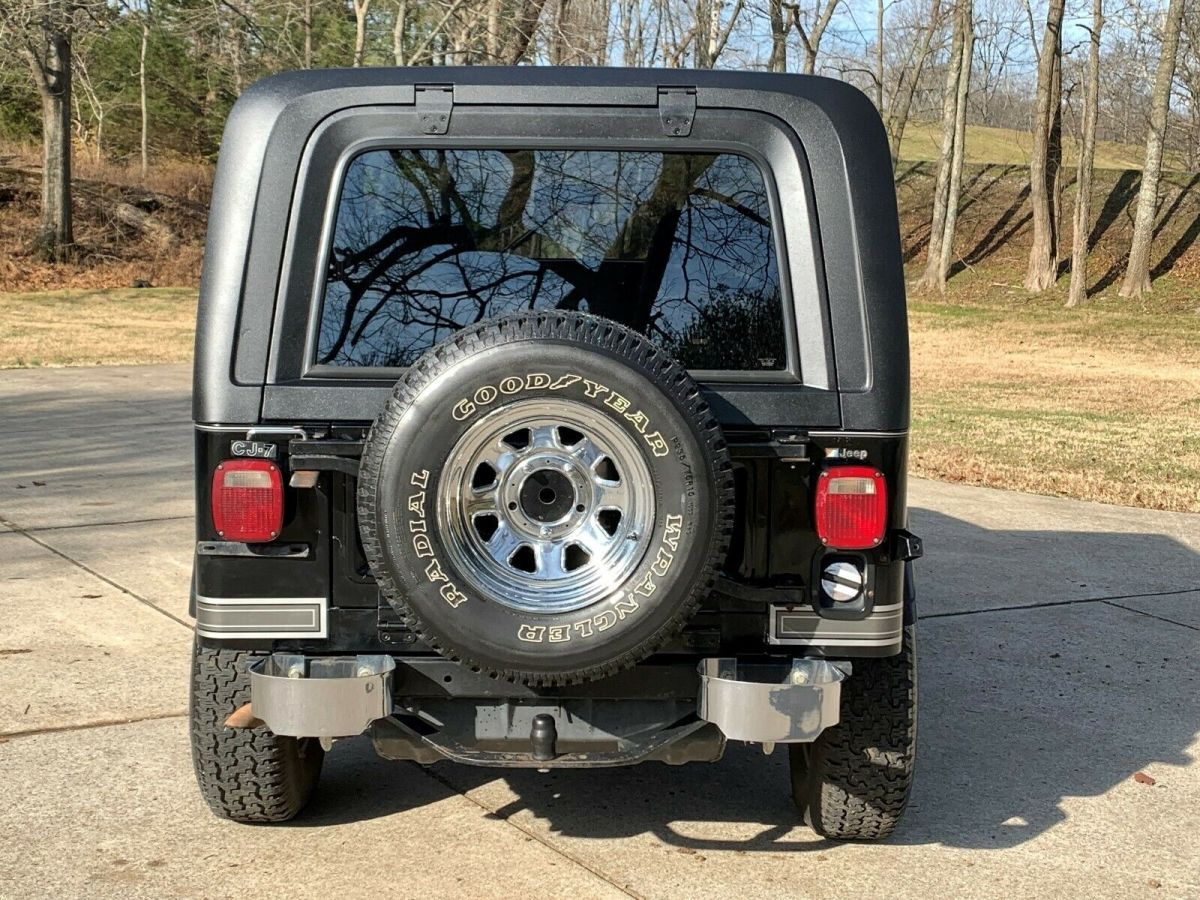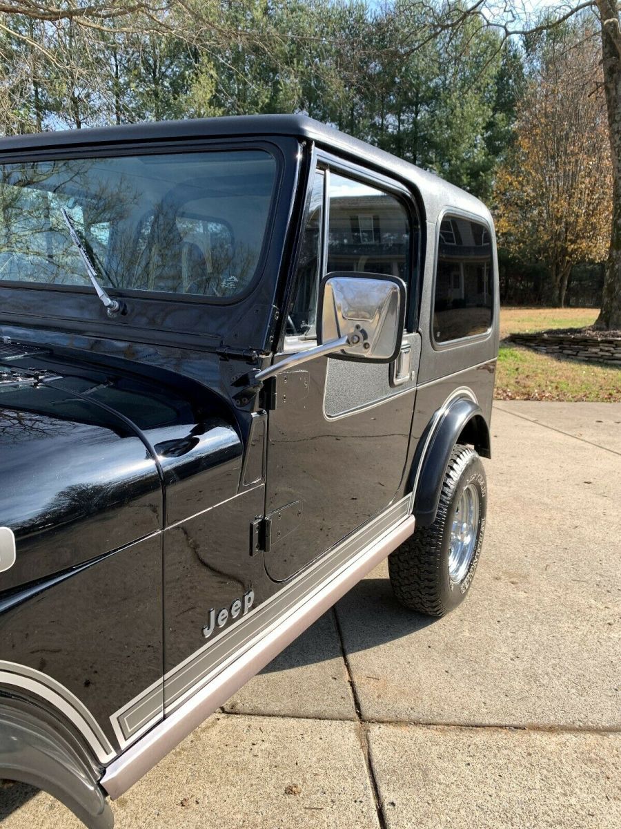 Highly optioned 1984 Jeep CJ7 Laredo in black on black. If you want a quality factory original that drives excellent here is your chance. I would drive this Jeep anywhere right now and feel good about it. It is as tight as a 20-30k mile jeep. More than likely that is all the driving it actually did as it was RV pulled early in life. They didn't leave many options off when ordering this Jeep CJ7 new. HD 6 leaf springs (leveled and higher stance than standard), quiet carpet kit, cassette radio, tilt, hardtop/hard doors, tow package, 3.31 gears, t5 trans, PS, P, HD cooling, A/C. Very few came with this amount of options. Cosmetically this Jeep is very nice. Original paint is still thick and shows well which in black is a rare find for sure. Being black paint it does show small imperfections but nothing distracting. I took pictures in different lighting so you have a better idea of condition. Having spent the majority of its life in California the body is excellent. You just cant beat Cali Jeeps. There is no rust not even surface rust on the bottom. Mechanically everything is ready to go. It runs, shifts, stops and even the AC works well. Probably the best driver I have had in a long time and with a factory exhaust and quiet carpet kit you hardly know its running when inside. It does have an aluminum valve cover and MC2100 carb which means it doesn't leak and runs very reliably. Those are the only modifications. Original keys match ignition, console, glove box, doors and hardtop gate. Any questions call or text Mike 419-343-4284