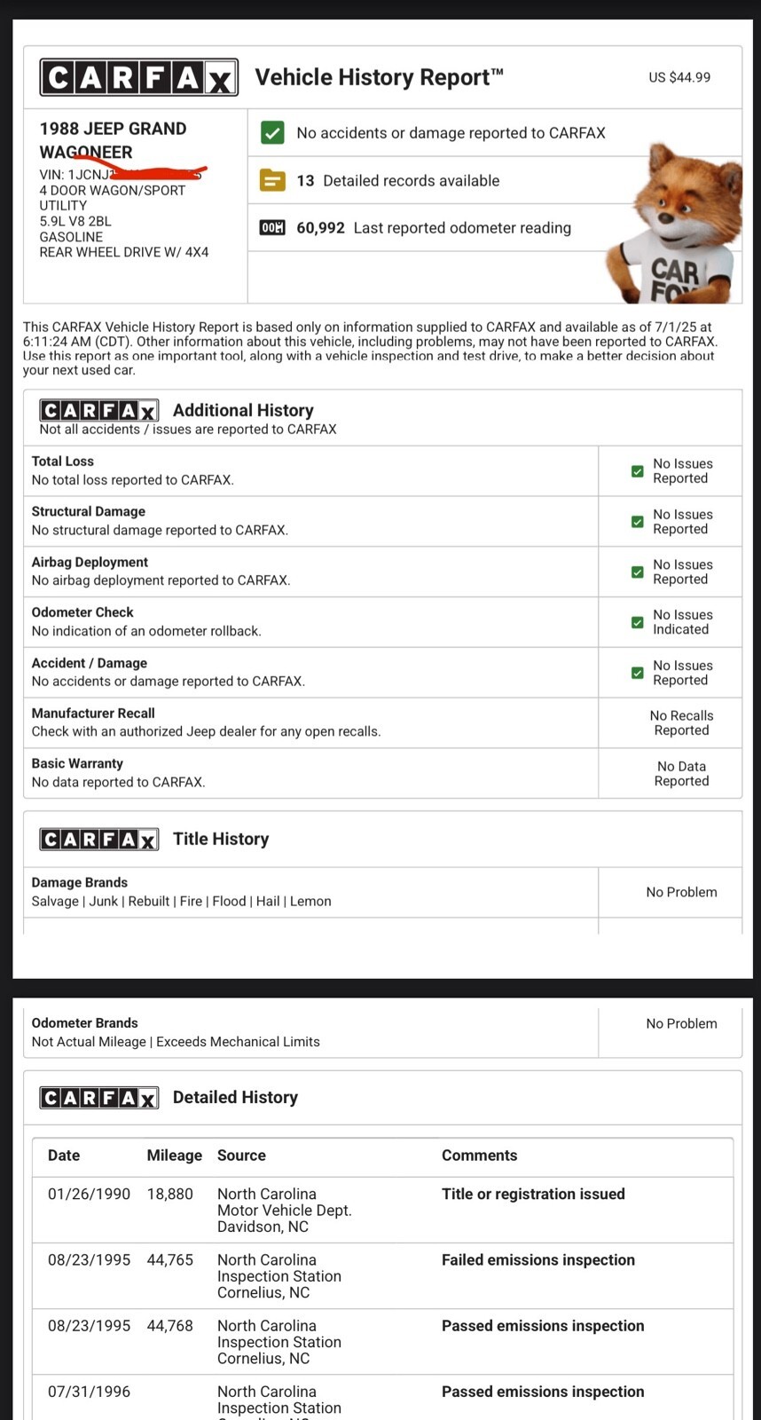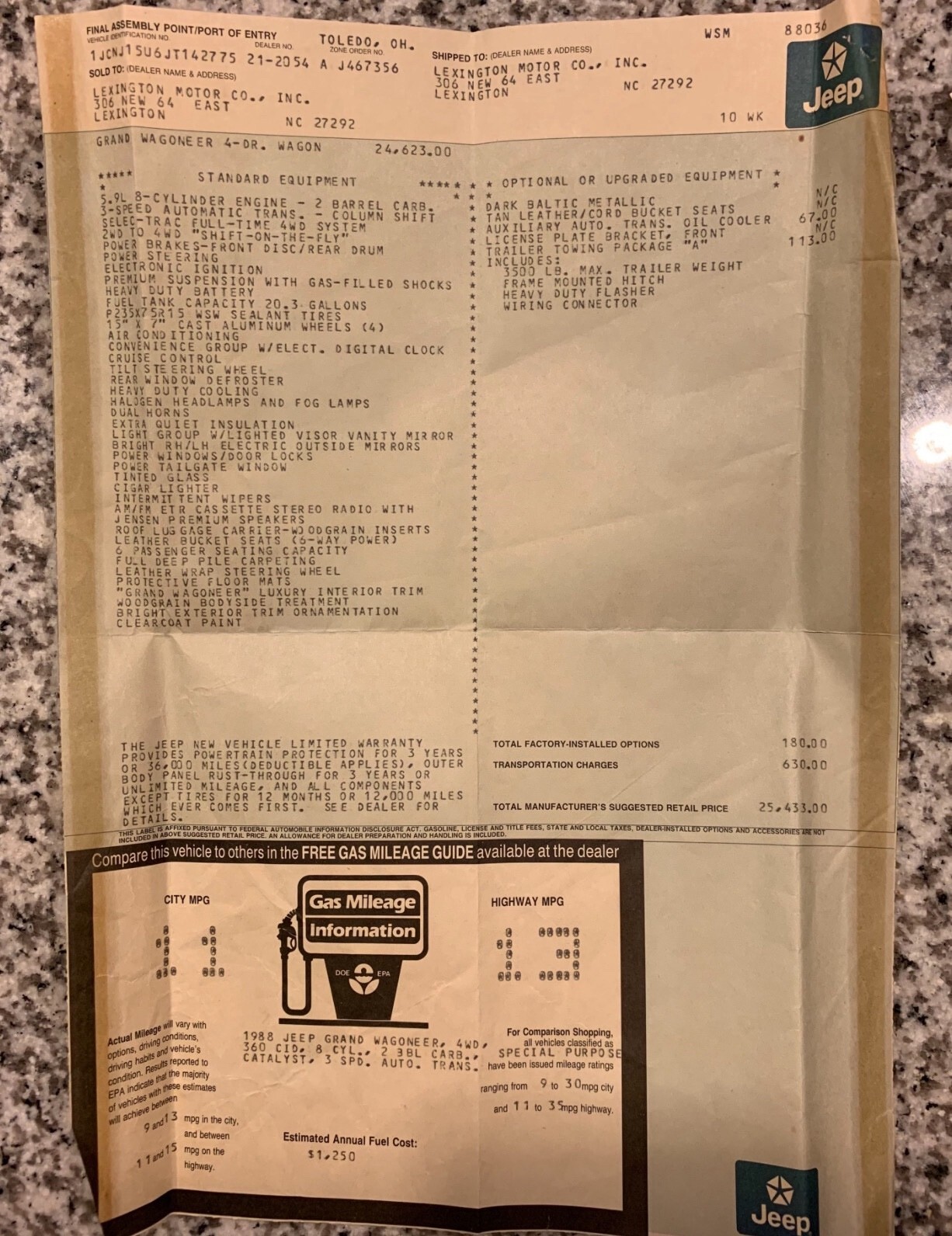 1 owner JEEP GRAND WAGONEER WITH 60k ORIGINAL miles. Bought new in NC at Lexington motor cars, window sticker still with truck. One dent in body. Zero rust. Runs and drives Vehicle Details 1 owner Jeep Grand Wagoneer. No rust, see frame photos. Original Skid plate is good too. Paint is burned as 88’ did (no clearcoat) it’s NOT rust. It’s burned up and faded paint. Body has one dent. See close up on quarter joint where they ALL rust and you’ll see there none here. Excellent chrome. Everything is there, nothing ever taken from this jeep. 60k carfax certified original miles and no accident history. You can see a shop added a one in front of the 05’ entry in auto check- carfax corrected this after documentation was provided (I have carfax if you want it, or you can buy it). Autocheck doesn’t have this feature that I’m aware of. Will not find a better restoration candidate or drive as patina. Restoring this one will actually yield results unlike restoring a higher mileage example due to the history. Runs and drives. Has had thousands in mechanical work done over the years. Tons of service records since new. Bought new in NC. Have tons of extra parts I can throw in. Thousands and thousands of $ worth. Let’s make a deal, if it doesn’t sell soon I’ll do the paint and decals and repost. Message me for more information |