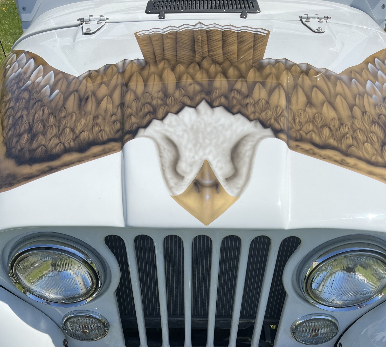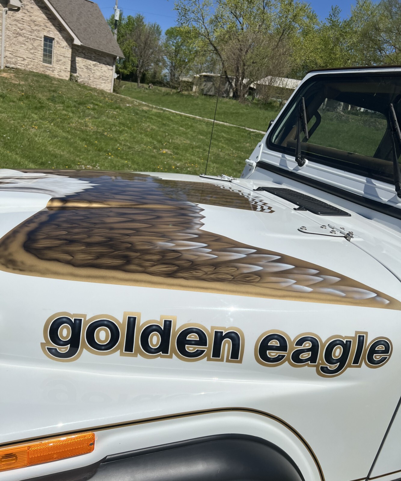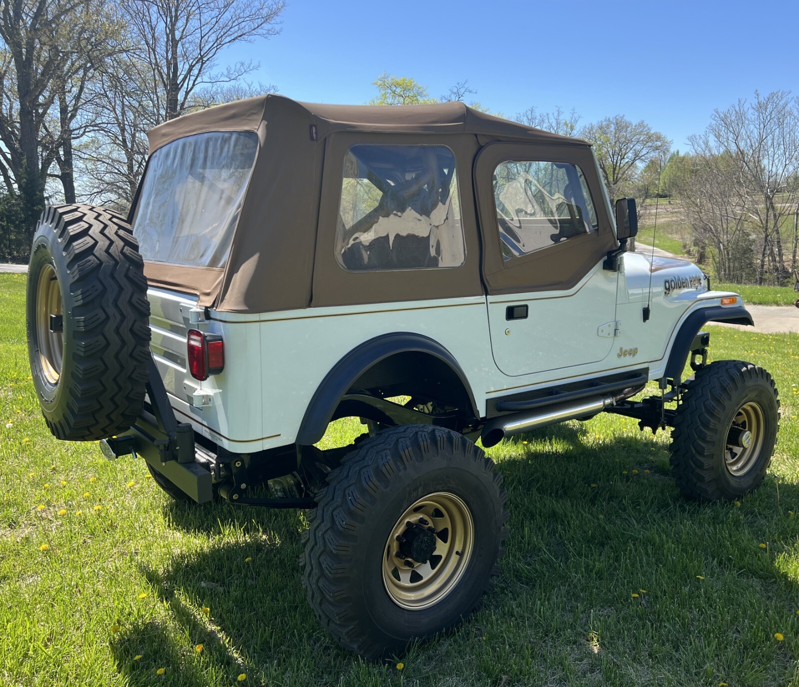 128 miles since completed full build frame up with over 6000 hours of time spent Rust free frame and body to start with. Frame has had all holes welded and smoothed out Blueprinted and balanced 408w all roller, aluminum strikeforce heads, custom cam, 10.5 compression, eagle rotating assembly, mahle pistons, Fast 2.0 fuel injection with Fast distributor (includes hand held programmer) This setup alone was 14K. Will run on E85 with tune. MSD digital 6 ignition with MSD coil Handmade cold air intake. OEM ford serpentine belt system with factory smog and AC delete Powermaster alternator Fenderwell headers and side exhaust. 1979 Ford Dana 60 front axle completely rebuilt with spartan locker 1997 Sterling 10.25 rear axle completely rebuilt with lockrite locker and disc brakes All rotors, calipers, and pads are Raybestos New fuel and brake lines. C6 transmission with stall NP205 transfer case 1410 driveshafts Custom golden eagle paint, no stickers, all airbrush Fiberglass front clip with oem CJ grill Besttop supertop All new lights and rubber New windshield in a rust free oem frame. Tilt oem column All factory sheet metal including doors Autometer gauges Monsterlined underneath the body and inside Rio grande seats 7 speaker stereo 9.00x16 powerking tires on 16x8 steel wheels, could easily run 40's Old Man emu springs with Bilstein shocks, rides great Cold case radiator with dual electric fans Does not have a horn but one could be added easily. Full build thread on wranglerforum with over 400K views