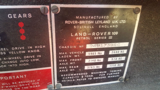 Land Rover 109 5-door Engine: in line 6 cylinder, 625 cc Fuel: Petrol Built: 01/05/1977 Chassis VIN: 94917396C Engine number: 9411629R Transmission: 4-speed, X4 High/low Current original odometer reading: 68000 km = 42300 miles Original factory color: Green Original owner: Fire Dept. of Oberwil -Lieli, Canton Aargau, H- Switzerland Current color: Repainted red per specifications of the Fire Dept. Original purpose: Command vehicle