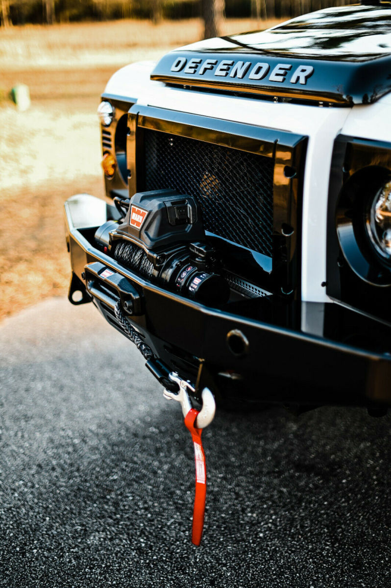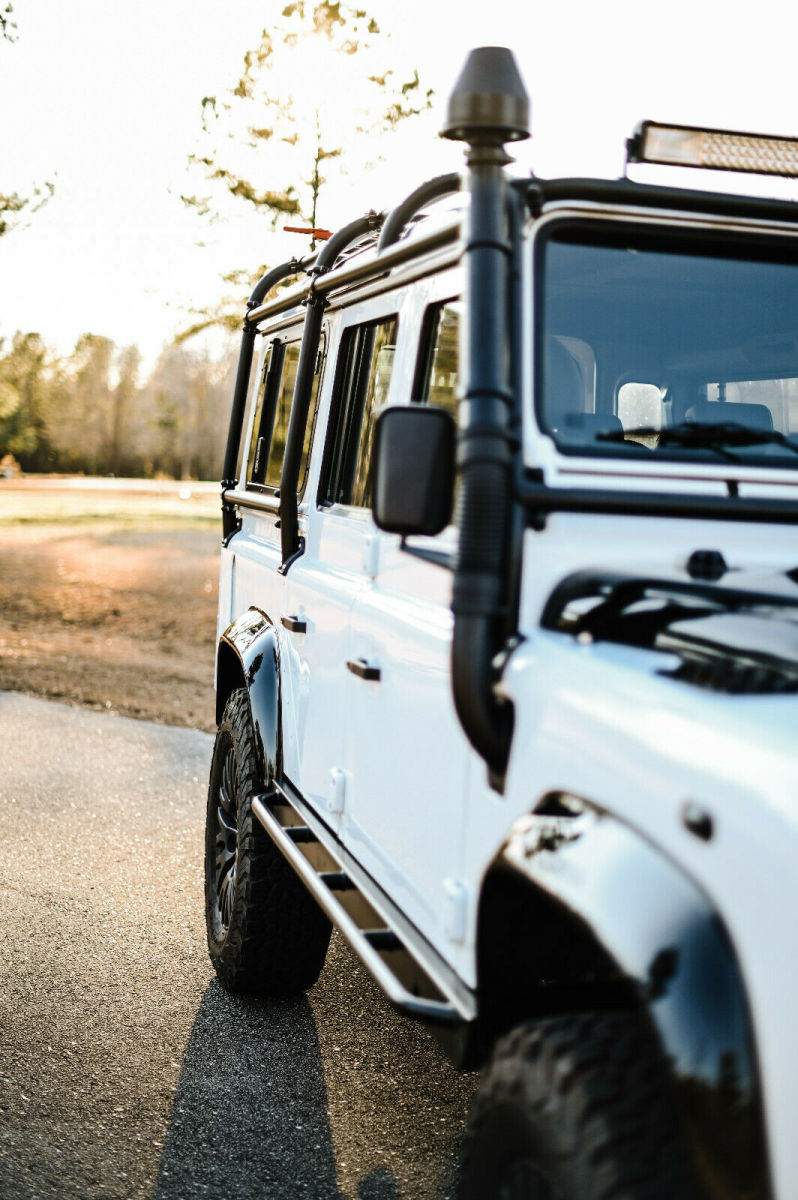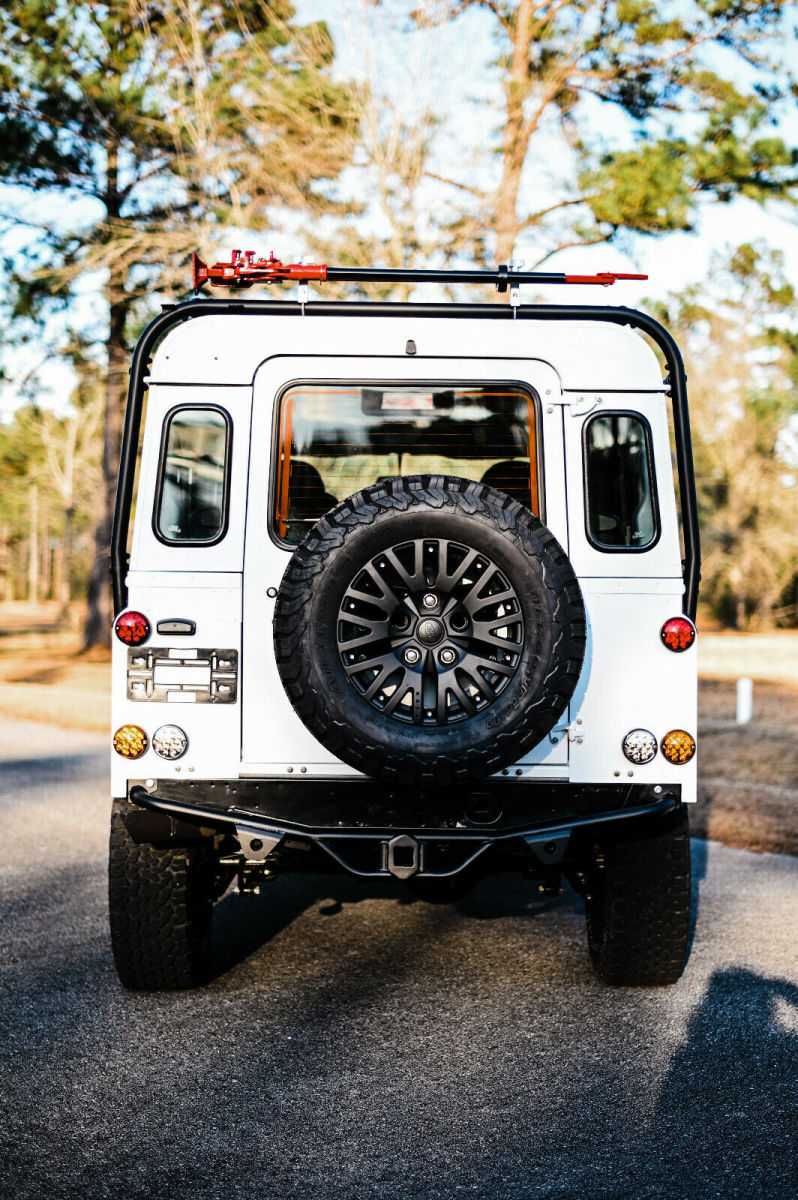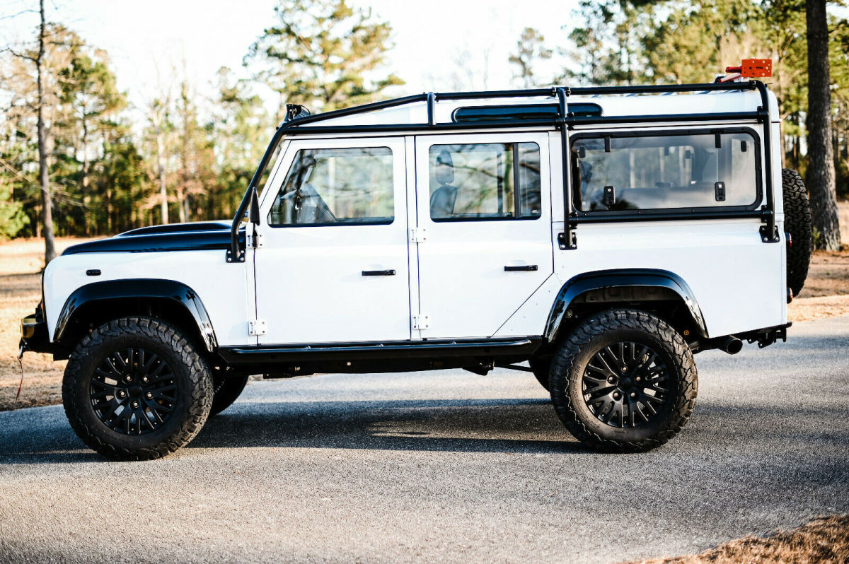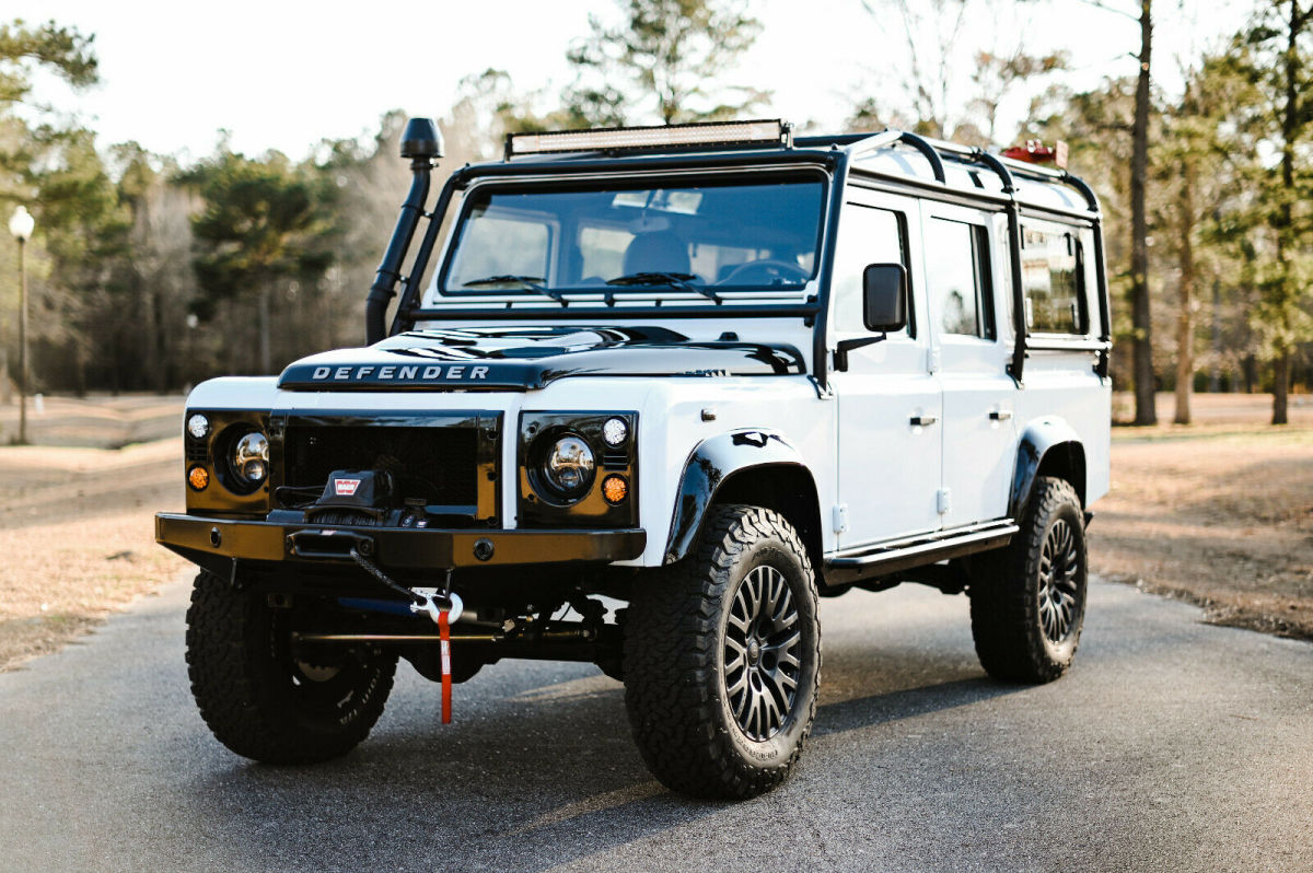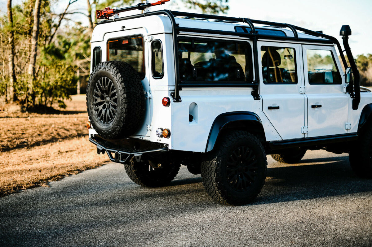 This is a custom built 1993 Land Rover Defender 110 Vin number is NCS101923 Frame is a new Truck has the modern PUMA style with excellent heat and air conditioning vents that help keep the inside a comfortable temp year round. The body is new take off and new body panels. All of the body was painted in Fuji white, in separate pieces, and then carefully re assembled on the chassis The interior is black leather seating with heated front seats, custom console, along with Alcantra headliner Front end was upgraded to an SVX style front lights and grill. Added full dark panel tinted glass to the rear of the truck. Added a rear NAS style bumper with 2 inch receiver. Full led light package from front to rear on the truck. Underneath we did a full revamp of the suspension, adding a slight lifted spring to the truck. We used new terra firma shocks and springs all around, with a terra firma steering stabilizer, along with new terra firma heavy duty track rod, and drag link. . The complete original drive train was scrapped and in its place is the heart of America muscle was installed. It now has an LS3 perfomance turning out 525hp, with a 6l80e transmission. Brand new transfer case with all new heavy duty drive shafts. All of the axles have been upgraded to heavy duty TDCI axles. To make sure it can stop it has all new brakes, along with vented rotors. Mounted to the 18 inch Kahn Rims and wrapped in brand new BFG KO AT tires. The inside was upgraded now featuring 7 leather seats, featuring heated frontseats, middle and rear are high back forward facing with integrated seat belts protecting those most precious to you. The Alcantra Suede headliner above, and the plush leather protected by the heavy duty factory rubber floor mats. It now has power windows in the front along with keyless entry, and more options never offered in a defender through the factory. Double din stereo with DVD, Bluetooth, navigation, apple car play, and back up camera etc. Several charging points have been added into the custom center console, along with a very nice 10 speaker JL audio system providing great musical sound in the truck.
