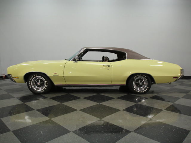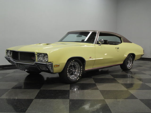 Buying a vintage car today is often about making up for when you weren't able to buy your childhood dream. That's why it's so important to find one of the rare few where someone has cherished it, ust like you would have done from day one. This rare and ultra powerful 1970 Buick GS 455 Stage 1 is exactly that kind of gem you've been searching for.In 1970, he GS 455's design perfectly blended Buick's upper class image with performance touches that reflected the serious muscle car power it was bringing to the road. It starts with the great looking Bamboo Cream paint. It looks so good we suspect a professional respray of its factory-correct color. This hue is the perfect complement to the saddle brown vinyl top. Plus, his was one of the final years before chrome bumpers had to sacrifice style for federal regulation. You see this, specially in the rear, here the one-piece bumper creates an entire panel that's crafted to integrate the angular rear fenders and trunk. While this was mature styling at its finest, he Grand Sport lived up to the latter part of its name, ith aggressive features like red striping on the rocker panels, he functional hood scoops with correct Stage 1 badging, nd the iconic Buick Rallye wheels.The interior carries this same upscale performance attitude. The original saddle interior look amazing, nd it's especially nice when you realize this car was ordered specifically so the exterior vinyl top would match the inside. The bucket seats have a cool vented pattern that you'd expect from a classic German car, ut of course, he design is more for sustained driving comfort. The same can be said about the center console, nd once again, he performance feeling immediately comes back once you lay your hands on the horseshoe shifter. This GS 455 came loaded, nd you can tell the moment you grab the optional X2 Rallye steering wheel. Beyond that you see the full factory gauge package that includes a tachometer. The original air conditioner is still in place and workint to cool down this large interior. This level of preservation should seem quite amazing, ut if you're still not convinced, ust take a look at the radio. The AM/FM unit still has the original 8-track stereo, nd you even get The Sounds of Buick cassette that came from the factory. So this car has plenty of documentation to back it up, ut rarely do you get the kind of meticulous care that even the incidental materials survive.With such an impressive preservation so far, ou won't be surprised to know that the 455 cubic-inch V8 is a numbers-matching powerplant. This is important for a Stage 1 car like this because it added performance goodies such as a special four-barrel carburetor, igher compression pistons, nd a high lift camshaft. Buick rated it at 360 hp, hich was a bit of an underrated fib for the insurance companies that were beginning to crack down on such muscle cars. It has lived a good life, veraging less than 1,200 miles per year, nd in fact, he only major component that is known to have been replaced is the radiator. So you know maintenance has been about keeping it original without sacrificing reliability. The big block is mated to the original Turbo Hydra-Matic 400 three-speed automatic transmission. The stout gearbox not only easily handles all the power, ut also it was only 1 of 1,785 coupes ordered from the factory that way in 1970. This Buick's comfortable nature is also seen in features like power steering too. Handling is also well in control with the GS 455's special finned aluminum brake drums, nd modern Goodyear Eagle tires at all four corners.The Buick GS 455 was true muscle car royalty. It outran just about any blue oval, r Mopar on the streets, nd it did it with style and grace. This example is the true king that can prove its bloodline with documents like the original dealer invoice, arranty card, indow sticker, ill of sale, nd owner's manual. And if you're quick enough to snap this up, ou can wear the crown. Call today!!