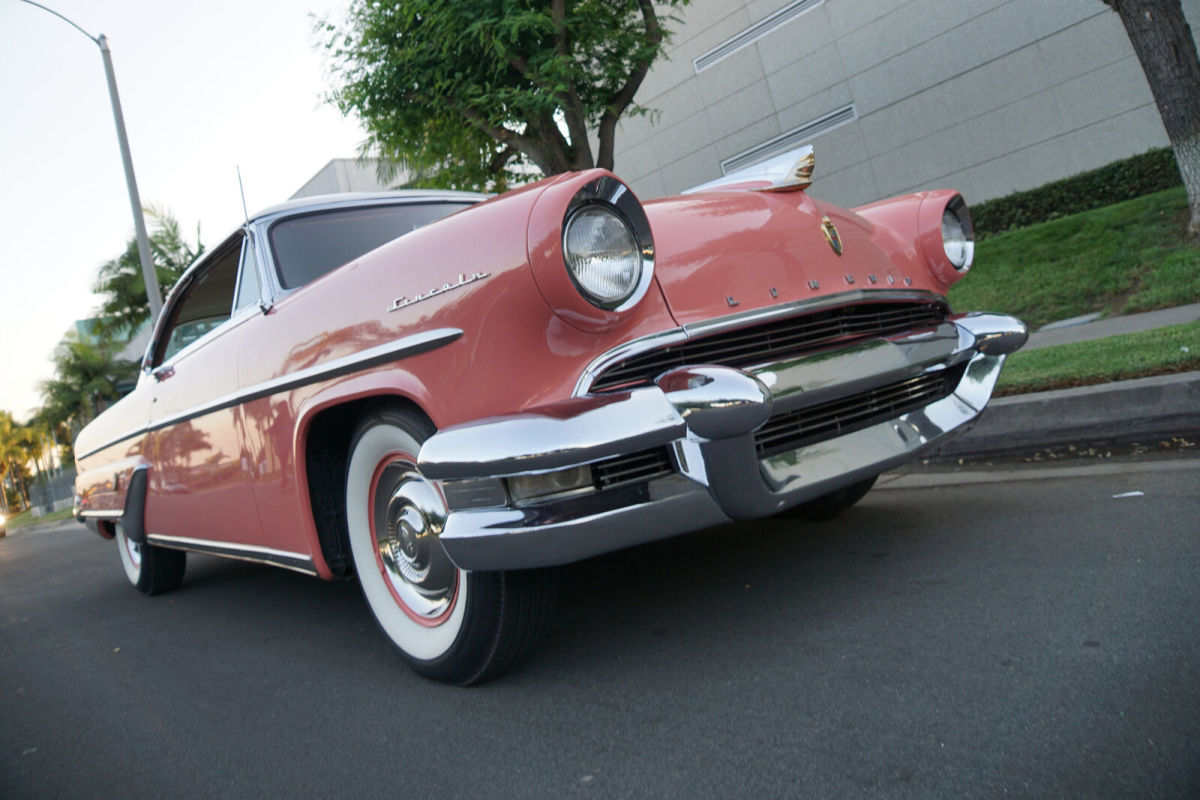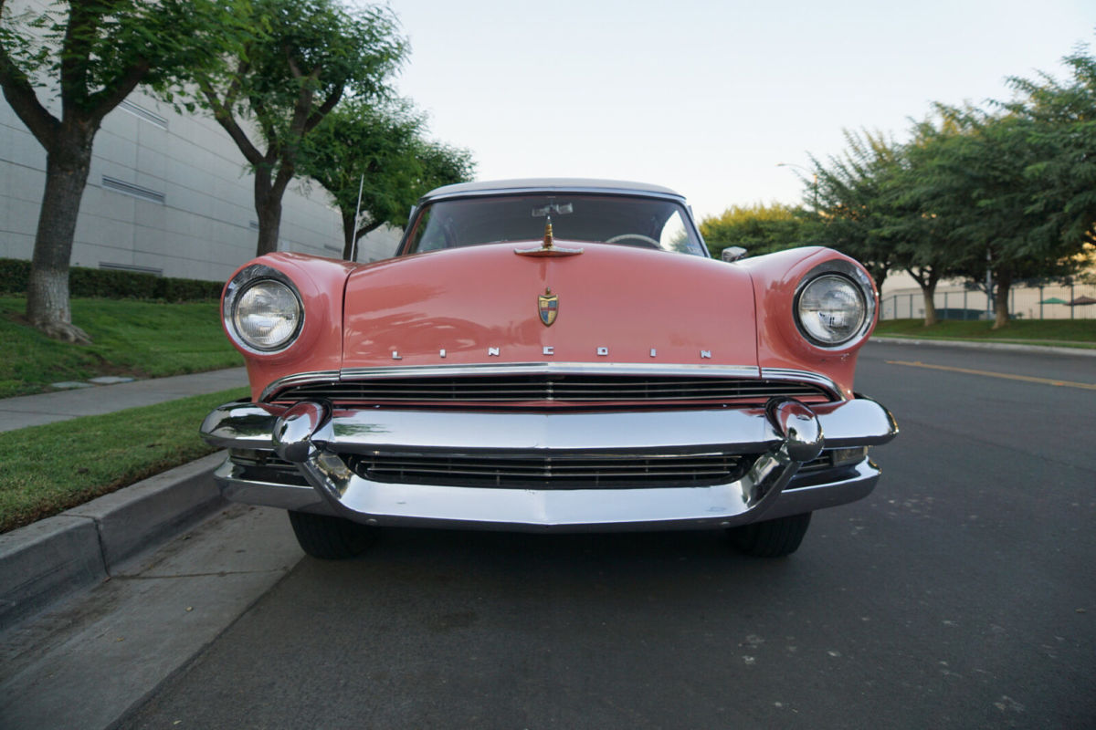 West Coast Classics are proud to present a very striking example of this 1955 Lincoln Capri 341/225HP V8 2 door Hardtop in it's very attractive original two-tone color combination of 'Ermine White over Cashmere Coral' (Paint Code 90) with believed to be its all original and superb condition matching 'Ermine White over Cashmere Coral' interior with original surface dyed leather and correct factory welting all in virtually as new condition, full floor carpeting, electric clock, chrome window surround moldings, bodyside beltline trim, full length bodyside stainless steel molding, rocker panel molding, rear fender skirts, and with factory options of AM Radio, Power Steering, Power Windows, 4-Way Power Seat, Power Brakes & Full Wheel Covers with Whitewall tires. The Lincoln Capri was to replace the Cosmopolitan in 1952 as the top-of-the-line series for the marque and was offered in three bodystyles. Both series road a new 123" wheelbase chassis with newly designed ball joint front suspension, recirculating ball power steering and under the hood was Ford Motor Company's first overhead valve V8 which would extend to both Ford & Mercury. For 1953 the Lincoln V8 produced more power per cubic inch than any of its competitors. Styling changed completely too with a more contemporary squared off look and extensive sound deadening enhanced refinements added to the improvements. These Lincoln's were highly regarded, both then and now, and are especially known for their superlative performance in the Carrera Panamericana (Mexican road races) in those years. By 1955 the Capri had proved to be a very attractive and popular model with ultra-clean front to end styling with the legendary massive tailights housed in elongated fenders. These models were built with only the very best materials available at the time with both excessive comforts as well as power. In 1955 Lincoln once again became a separate division of the Ford Motor Company and finally introduced an automatic transmission of its own, Ford built and dubbed the Turbodrive and was said to bring new flexibility and smoothness to the driving experience. To keep pace in the horsepower race, the OHV V8 was bored out to 341 cid with the 4BBL carburetor and 1955 was the first year for the dual exhausts with unique rear bumper outlets. This particular example is in very fine condition throughout with a very straight body and with the floor boards, trunk and all the typical rust-prone areas solid. The car has a very striking repaint which has been color sanded and buffed in it's original two-tone colors and remarkably the interior as previously stated is believed to be all original, apart from the carpet, also in the very striking and matching two-tone colors of the body which is very handsome and the car boasts power steering, power windows and power brakes. The original 341/225HP OHV V8 engine runs strong with the original 'Teapot' carburetor having been just rebuilt and the original Tri-Tone Color painted engine is color correct and sounds absolutely magnificent and this particular car drives really well - a truly remarkable daily driver that will give any modern day car a run for it's money! This is a rare opportunity to own a great daily driving example of a very striking 1955 Lincoln Capri 2 door Hardtop in very fine daily driving and looking condition throughout and a turn-key ready example for any classic American car enthusiast to enjoy or collect today! |