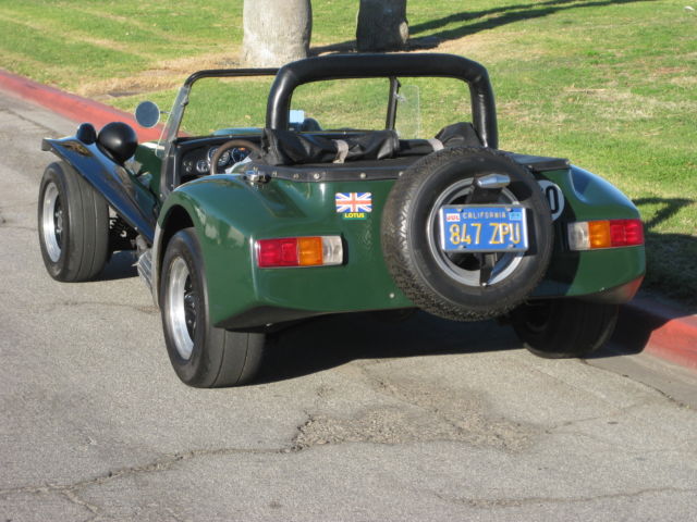 This auction is for a very rare authentic California Lotus Super Seven. What a blast this car is to drive. It was fully restored and expertly modified over 35 years ago and it is just as quick today, s it was then. The rear arches were professionally widened 2 inches to give such a great look. The engine was built by renowned Lotus engine builder Dave Vegher and it is a testament to his work as it still performs extremely well. It has had only two owners over the last 35 years and comes with a complete folder of history, nvoices and articles. The original owner was a true enthusiast and took great car of the car always garaged and pampered. Recently it has had new rear brakes, lave cylinder, nd is fully serviced ready to drive. Starting easily from cold it fires up with an awesome sound that just makes you smile, ostly because you know how much fun you are about to have! It settles down to a nice idle showing excellent oil pressure and it does not overheat. All the gauges, ights, orn work correctly. The indicators flash very quickly and probably need a new flasher unit but they do self cancel. The car stops very well with the twin boosters fitted and the parking brake will hold even on a steep incline. The car pulls left slightly and could probably use an alignment, ut the steering is quick and accurate as you would expect. The 4 speed ford box is a delight as always shifting smoothly up and down without issue. The bodywork is in very good condition showing a few blemishes typical of 35 year old paint. No significant cracking or crazing of the fibreglass is evident. The paint behind the gas filler has reacted from coming into contact with gas over the years, ut is not lifting or flaking off. The drivers' side entry area has been touched up and still has some wear from getting in and out. It also comes equipped with a very sharp looking full tonneau cover (one tennax snap missing) that matches the black interior which looks fantastic and compliments the car perfectly. There is also a half tonneau that covers the rear storage area. It sits on period Revolution Alloys and Hoosier rubber, 05/60's in the back, nd 185/60's on the front. This Lotus Super Seven turns heads with its vintage Lotus racing colors. As far as the rest of the car the pictures speak for themselves, truly spectacular example of a well sorted work of automotive art. If you have any more questions please feel free to ask. My descriptions are very detailed and generally a little over critical as I want you the buyer to be happy with your purchase. Bid to buy this car will not disappoint. As always I would recommend driving and viewing the car if at all possible. Please call (310) 833 1525 for an appointment. Bid to buy with confidence, have sold many British classics on e-bay with only excellent feedback. |