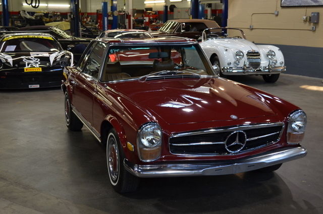 1969 MERCEDES BENZ 280 SL ROADSTER --Dark Red with Palomino leather interior and Tan carpeting, 3,000 Original miles, speed manual transmission, actory hard top. VIN: 11304410009534The Mercedes W113 type, ick-named “Pagoda” due to a distinctive and patented concave hardtop roofline has been labeled by many as one of the most beautiful cars ever built.All 280 SL models were equipped with an inline six cylinder engine with multi-port mechanical fuel injection. The bonnet, runk lid, oor skins and tonneau cover were made of aluminum to reduce weight. The comparatively short and wide chassis, ombined with an excellent suspension, owerful brakes and radial tires gave the W113 superb handling for its time. The styling of the front with its characteristic upright "fishbowl" headlights and simple chrome grille, ominated by the large three-pointed star in the nose panel, aid homage to the then already legendary 300 SL roadster.Factory options include: 4-speed manual transmission, umper guards, eadrests and Factory hard top.This 280 SL Pagoda is a collector owned example. It is excellent “driver” quality and has been well cared for from new. It has benefited from personal upgrades including a Nardi wood steering wheel and upgraded stereo. This original color example Pagoda has averaged slightly more than 1,000 miles per year since new and makes for a great, eliable driver for immediate use and enjoyment.