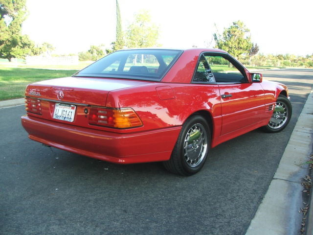 FUN WITH A RED HOT FINISH !! RARE CARFAX DOCUMENTED 48,500 MILE CALIFORNIA CAR HISTORY This absolutely gorgeous example of pristine Mercedes Benz history was purchased new by Mr. Ken Bernstein on October 7, 990 at Jim Slemons Imports, 301 Quail Street, ewport Beach, alifornia. This is recorded in the original Mercedes Benz Owners Service and Warranty Information booklet that is included with the car. The rest is Carfax history, ocumenting the low miles this fine automobile has today, aving been driven an average of just under 2,000 miles a year! A little over 4 years ago, purchased this classic from an elderly couple, ex and Arlene Osborn. Their title had been issued to them on June 29, 000 when, t that date, he title documented that the odometer reading was 23,789 miles. The miles on the car, hen I purchased it, ere around 32,000.So! My wife and I have enjoyed over 15,000 miles of memories in the past 4 years, ncluding trips to see the grand kids, own to San Diego for my 50 year high school class reunion, nd more. However, e both agree that, t this point in our lives we need to streamline, ell a car or two, art with some toys, ake a vacation, nd let someone else enjoy this excellent tribute to German manufacture and engineering. COSMETICS The R129 500SL is one of the last, est Mercedes-Benz automobiles. It's designer, he legendary Bruno Sacco, alled it "the most perfect car of my career." Furthermore, he quality of materials and engineering throughout is unmatched by pretty much anything sold since these cars were new. With this fine, ow mileage example in mind, ou may well decide that now is the time to GET THE BEST AND FORGET THE REST!When I first saw this Mercedes, thought "Oh, y goodness." Here is a sports car that looks, n my opinion, very bit as good in person as it does in the photographs. From where I stand, t is PRISTINE original. Obviously, t has always been garaged and well cared for. But there's more. The following is just one example of the good fortune that has followed this car:When you get a chance, ake another look at some of the photographs showing the air dam below the front bumper. It has NEVER BEEN HIT or repaired. NOT A SCRATCH. This is very rare because, s I'm sure you know, he comparatively frail air dams on many cars are quite vulnerable when heading into a parking space with even a medium height curb. And everywhere you look it's the same. The entire car, NCLUDING the air dam has never been hit. The FACTORY ORIGINAL PAINT looks, o me, ery close to the finish of a Mercedes that has just driven off the showroom floor. Of course, here is no cancerous rust. Another thing. NO front end ROAD RASH. You need look no further for evidence of the legendary impervious quality of the original paint on this automobile, ust one of many reasons why a buyer was willing to step up, n 1991, nd pay well over $100,000 in today's dollars to purchase this high end luxury automobile. All chrome, ubber, enses, nsignias, lass, ngine compartment cosmetics and more are in the same superb to near-new condition. The windshield is excellent. Includes 4 matching high-speed Mastercraft Touring LSR 255/55R16 radials that I put on the car shortly after purchasing it. Today, see little sign of tread wear, nd the sidewalls are without crack or evidence of aging. Furthermore, can find NO PARKING LOT DINGS ... anywhere. And no touched-up scratches. On the trunk lid is a very small blemish where someone probably has closed it on something. My best guess is that whatever was put inside at the time was just a little too high, nd upon closing, he lid was tapped from underneath, ausing a very small dimple outside. You have to look close. THE INTERIOR leather must have been well cared for with conditioner over the years (which I have done as well), s the seats are beautiful and supple, ithout cracking or damage. All carpets, ncluding trunk carpeting, he area behind the seats, loor mats, oor panels, isors, hrome interior door openers, INT CONDITION leather steering wheel, ash, ear view mirror, earshift knob, ood grain decor, ard top headliner, auges, eat belts, enter console, witches and more are in superb original condition. This is a fresh smelling, on-smoker car. It doesn't get much better than this!The previous owners assured me that the soft top was in good condition, ut I've never removed the hard top, r inspected the soft top personally. I'm an old surfer dude, nd when I was young did battle with the sun. But the sun won! And so I've left that beautiful hard top in place. MECHANICS But the best is yet to come! This red rocket runs and drives, n many ways, ike a brand new car. The ground-breaking M119 dual overhead cam, 2-valve, ll-aluminum V-8 engine fires right up, as excellent oil pressure, oes not smoke or drip oil, uns cool and strong, nd does everything that these legendary power plants have been doing so well for so many years. Matched with a surprisingly lively 4-speed automatic, he engine delivers tons of smooth rev range - and sounds magnificent doing it. And the well-tuned chassis handles just about everything you can throw at it with grace, omfort and agility. The transmission falls in gear nicely, nd shifts like a good Mercedes should. The brakes and emergency brake also work very well.The power steering pump will sometimes leave a small amount of fluid on the garage floor. This has not changed during the 4 years that I've owned it and, n my opinion is minimal. My Mercedes mechanic checks the reservoir every once in a while, nd occasionally will add a small amount to top it off. Otherwise, e says, ust leave it alone. WHAT WORKS? All power windows, auges (including the clock, hich keeps good time), teering column adjustment, teering lock with ignition/starter switch, eadlights, ncluding high and low beams, eadlights 'on' warning buzzer (activated when the engine is off and you open the driver door), rake lights, unning lights, ear license plate light, runk light, nterior reading lights, o