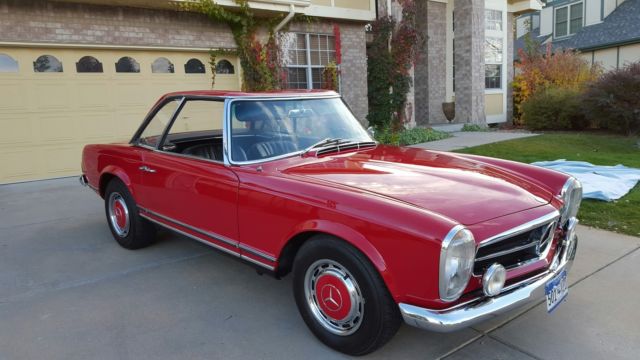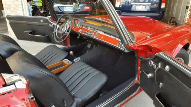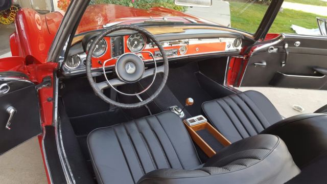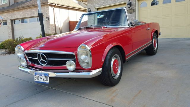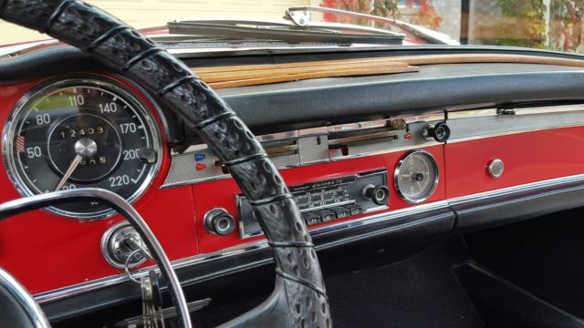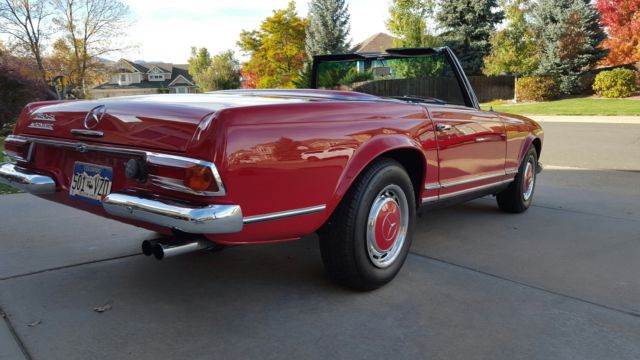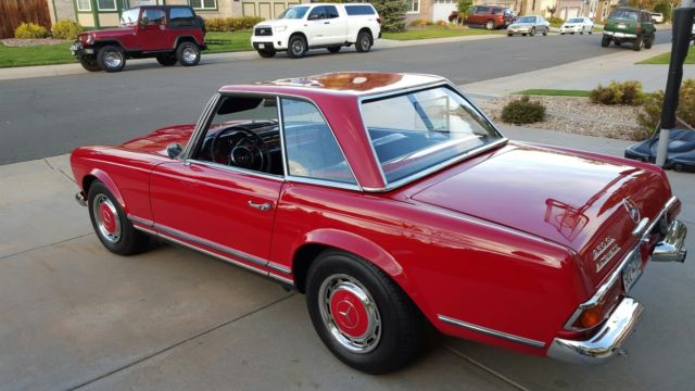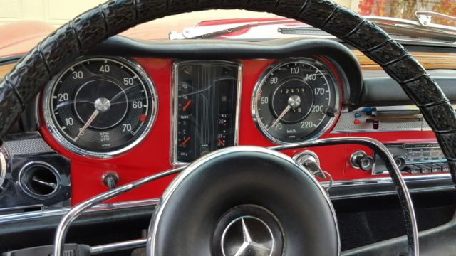 The 250 SL is the most rare of the 113 Pagoda Mercedes with only 5200 examples produced. This car is a European specification car with the front mounted fog lights, he single lense headlights, nd the absence of marker lenses on the four corners of the car. The car includes the removable hard top which is in good condition, ith power steering and power brakes. The brake power booster system has been recently rebuilt, nd all engine hoses have just been replaced with correct OEM Mercedes hoses. The transmission is a 4 speed shiftable automatic and shifts smoothly through all gears. The engine has recently been serviced and tuned and runs very well. The interior is very nice with no notable issues at all, nd the interior wood trim pieces are all original and in very good condition. All gauges work, nd the original 3 band Becker radio works like new. The paint is a repaint in red (Originally white) and shows well with only minor flaws visible upon close inspection. All of the glass is in excellent condition and appears to be original to the car. The tires are near new and the brake pads have substantial pad remaining. There is no rust visible, he floor pans are solid and original to the car and the undercarriage is nicely detailed. With only 112,400 km (69,700 miles) this is a very low mileage survivor. This is a high quality driver and can be acquired at a fraction of it's potential value. Please bid with the knowledge that there is no reserve and your bid could be the winner. Please don't bid unless you can pay for the car by wire transfer or a certified bank check.