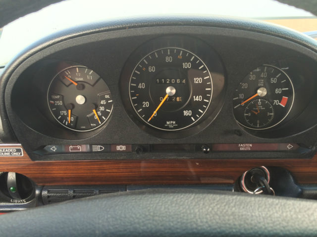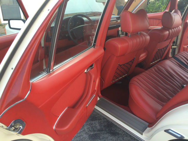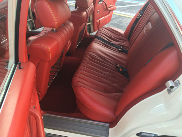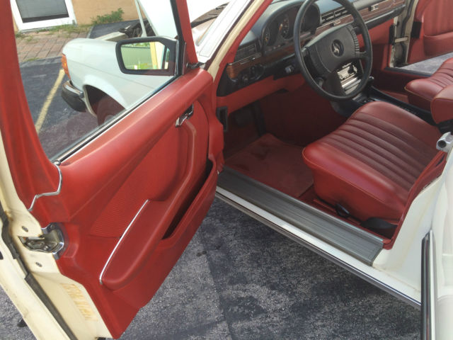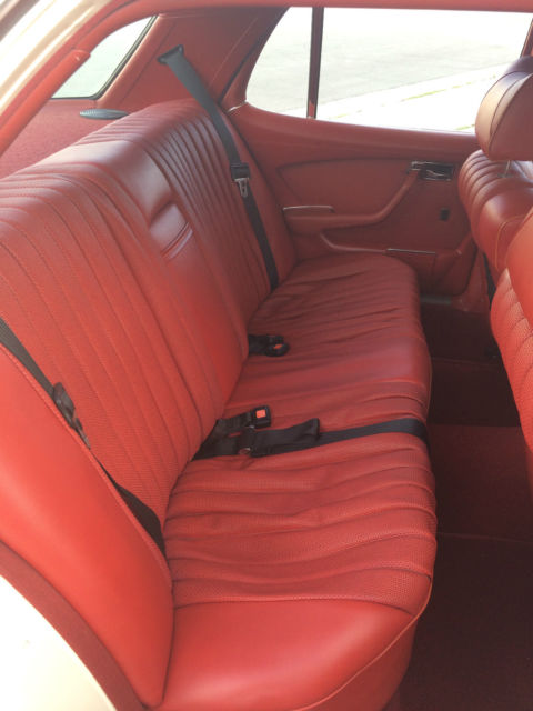 | 1975 Mercedes Benz 280 S 6 Cylinder that runs excellent.Power windows all function ColonialWhite exterior in very good condition NO Rust 3 minor stone chips in paint on hood above headlights ( shown in pictures )with Red interior in excellent condition NO Rips in seats Dash has No cracks OriginalCarpet is cleanand showslittle wear Has the original R-12 A/C System in need of charging The Original M/B Windshield has a small stone chip as shown in pictures If you have any further question feel free to email and I will respond promptly. |