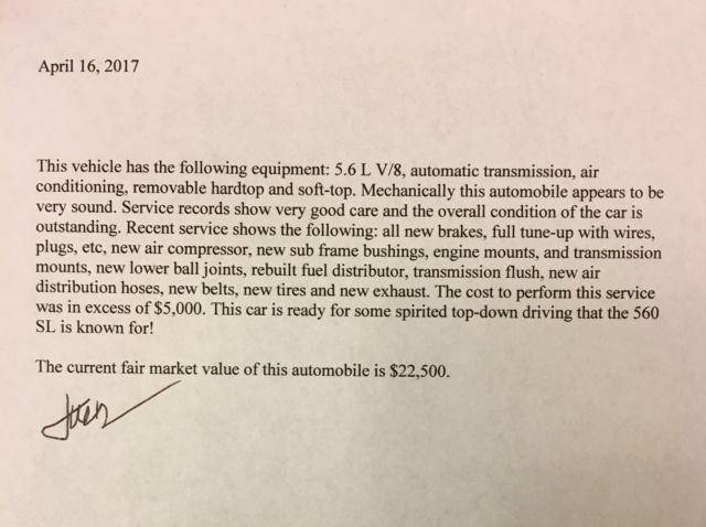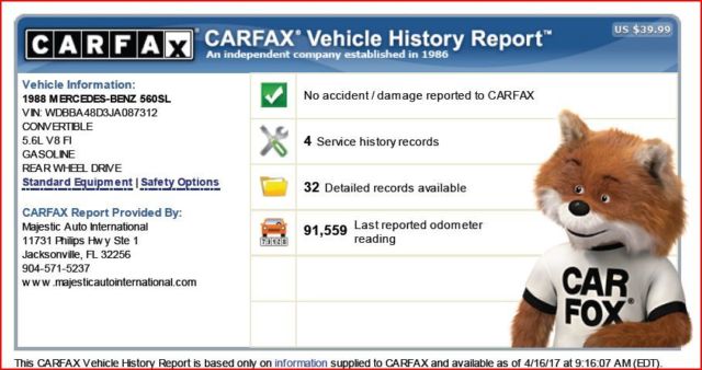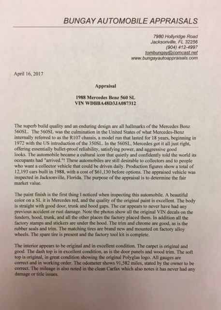 | 1988 Mercedes-Benz 560SL R107 Roadster Here is the chance to own THE NEXT COLLECTABLE SL ROADSTER - 1988 Mercedes-Benz 560SL. Its desirable and extremely elegant Signal Red Paint shines like the day it left the showroom floor and Powerful V8 engine with only 91,000 documented miles purrs and runs strong as ever. This beauty was just inspected and appraised at $22,500!!! In the 560SL, Mercedes got it all just right, offering essentially bullet-proof reliability, satisfying power, and aggressive good looks. The 560SL combined all that Mercedes learned about the V-8 W107 chassis cars into a cultural icon that quietly and confidently told the world its occupants had "arrived." Simplicity, superb build quality, and an enduring design are all hallmarks of the Mercedes 560SL. The 560SL was the culmination in the United States of what Mercedes-Benz internally referred to as the R107 chassis, a model run that lasted for 18 years, beginning in 1972 with the US introduction of the 350SL. The R107 chassis was one of the longest running production bodies in the Diamler-Benz AG's line, and R107s are extremely well built and collectable. It is also the first V8 powered two-seater to be built at the Stuttgart, Germany factory. Now over 20 years old, 560SL’s are attracting new buyers due to its iconic good looks, simplicity, and vault-like build quality. Exterior: It’s ORIGINAL and highly desirable Signal Red paint (color code #568 signalrot) looks and shines like the day it left the showroom floor, and combined with Parchment leather interior this particular 560SL just looks stunning!!! Chrome is in excellent condition, it is complete and new looking, and this beautiful roadster is a head turner and conversation piece everywhere it goes. This Mercedes is super solid and rust free (please see pictures!!!). Body is in wonderful condition and it is straight as an arrow! All doors, hood, and trunk are operating with ease and everything lines up properly! ALL body panels including front and rear bumpers feature original VIN number stickers (please see pictures!!). This SL was never in an accident, and it has been always garaged, pampered and kept away from rain and bad weather, and it truly shows!! Factory VIN # stamping on the front radiator support is another sign of originality of this car. There is not a lot of 560SL’s out there in this solid and amazingly kept and preserved condition!! Like they say “Originality is king when it comes to classic cars”!! Not only does finding a 30ish year old car that has not been altered by numerous past owners add to your enjoyment of the car; the more original features that you can substantiate the better when it comes time to sell your treasure!!! Experienced car collectors and investors have learned that a solid, sound, original body is the most important aspect of any vintage car! Mechanical rebuilds are straight forward and not costly compared to trying to correct a previously crashed or rusted car. One cannot throw enough money at a car with a bad body to make it right or equal to a car with a great original structure like on this beauty!! This beauty comes equipped with both soft top, and the hard top! ORIGINAL black soft top is in great condition!! Plastic windows are nice and clear, and it is very easy to operate, with great fit! Original Hard top is also in excellent condition, including all the glass, and the headliner which is clean, and rips and tears free!! Another sign of originality of this beautiful car is stamping mark on the Hard Top (87312) which reflects the last 5 digits of the vehicles VIN number!!! All 4 tires are BRAND NEW and they make this Roadster float on the road!! -Interior Original Parchment Leather interior is in excellent condition, and it looks like the day it left the showroom floor! Carpet is clean and in excellent shape! Leather seats are in excellent condition as well, and are very supportive and comfortable. This Mercedes also comes with power windows, and they are working as they should! Everything on this car is working, from power windows, to the power antenna. Just take a look at the pictures, and you will get an idea about the condition of this car, how nicely it is kept, and how beautiful it is. -Engine & Transmission Powerful 5.6 Liter V8 Engine starts with ease, and it is strong and powerful as ever with only 91,500 miles on the odometer (only about 3,100 miles per year!!). It has no problems reaching 80MPH+ and its real blast to drive!!! This Mercedes received OVER $5,000 in recent maintenance and it is ready for its new owner! Recent service shows the following: all new brakes, including all new calipers, brake rotors, brake pads, brake hoses, full tune-up with wires, plugs, etc, new sub frame bushings, engine and transmission mounts, new lower ball joints, rebuilt fuel distributor, transmission flush, new exhaust, etc!!! Automatic Transmission shifts effortlessly through every gear, and it makes this SL absolute joy to drive and cruise in! This German Roadster handles great at the high speeds, and it is very comfortable. Air Condition works as it should, and this car is ready for some topless fun!!!! Spring is here, and there is nothing better than driving down the road with the top down, and the wind in your hair!!! Cruise into a sunset and down the memory lane in this beautiful German Roadster!!! This beautiful Mercedes comes with its original Tool Set! This is a very nicely kept and complete Mercedes SL, that has been loved its whole life, it was never abused, and it truly shows!! Every used SL has been created equal, but there are some that have been loved just a little bit more!!!! This car is one of those SL’s!! With its rare and very desirable color combination, and beautifully preserved original condition, this SL represents a great investment with an amazing return! Don’t let it get away!!!!!! Title is clear and is ready to be transferred immediately ANYWHERE IN THE WORLD and we will be glad to 