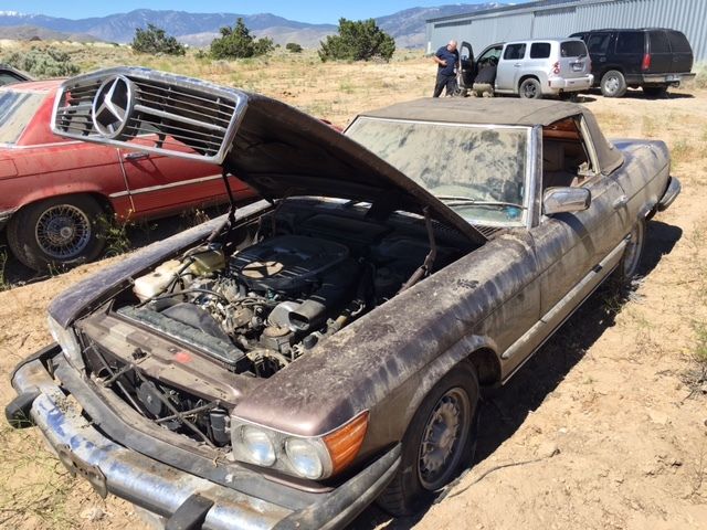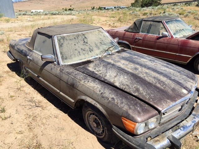 Two Mercedes SL convertibles. One is a 380, the other is a 450. Both are convertibles. They have been INSIDE a hangar in Carson City Nevada for 20 years. The are very dirty but the paint and panels are excellent. They were pulled out last week because the hangar is sold. They both need extensive interior work. If they were washed and waxed, the paint would be excellent. The missing lights and grilles and bumpers are in the hangar. These cars could be used for parts or they could be restored. There is no rust, but they are very very dirty. I do not know if anyone is interested but included is a 1989 Lincoln MK 7 LSC which is actually in very good condition. It needs a battery and gas and a good detail but it is very complete and again, under the dirt, the paint is excellent. The tires are holding air and it will roll onto a trailer. The LSC has the dial dash, not the digital one and it has the Rousche Racing 5.0 liter engine in it. Anyway, I have to move them. Two Mercedes and the Lincoln all for the price of $2,000.