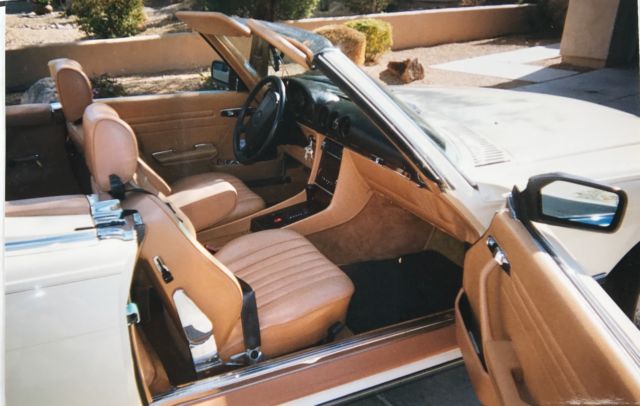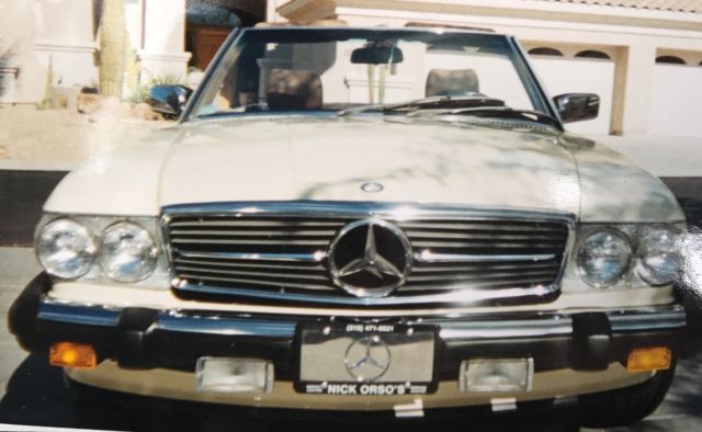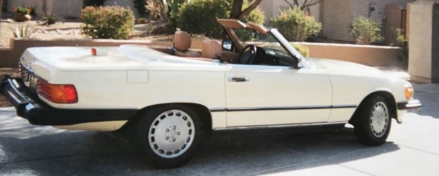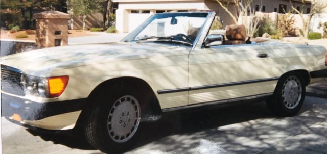 1987 Ivory Mercedes Benz 560SL Roadster with Palomino interior! This vehicle is in almost flawless condition. No findings of any damage to paint or body trim. This vehicle comes equipped with:Four Speed AutomaticSupplemental Restraint System - Drivers Air BagAnti-Theft Alarm SystemCruise ControlCentral LockingPower WindowsPower SteeringSoft TopAnti-Lock BrakesLimited Slip DifferentialAlloy WheelsLeather Seats and TrimLeather Wrapped Steering WheelCenter Arm RestHalogen HeadlampsTachometer/Quartz ChronometerSigle Din In-Dash DVD Deck100W RMS AB Amplifier300W PP Speakers |