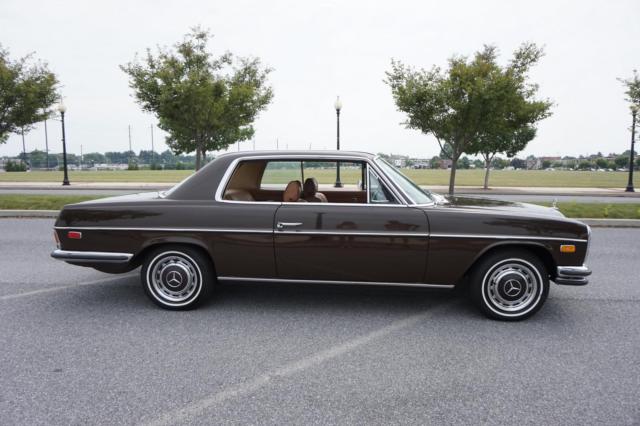 Michael’s Motor Cars is pleased to offer on e-bay an interesting 1971 Mercedes Benz 250 C coupe in a no reserve auction. Classic color combination with older repaint in the original dark brown exterior with tobacco color MB Tex interior. The car is showing 103,425 original miles which is verified by the Pa title. This quickly appreciating classic Mercedes coupe is an excellent candidate for restoration. It has some rust issues that will need to be addressed. Driver’s side rocker panel has significant rust and needs replaced. Driver side floor will also need metal work performed. Left rear trunk floor section behind wheel is rusty. Left front fender has rust around headlight chrome and on lower section by rocker panel. Right front fender has rust bubbles by headlight chrome bezel. Center main floor section is very solid as is the right rocker and floor sections. Front and rear bumper support braces and attachment points are solid. Doors and all wheel arches are very solid. Paint is in nice overall condition for the age. All exterior chrome and stainless is in very nice condition, including the center grill. Front bumper has slight dent on right side as seen in pictures. Rear bumper is unmarked and excellent. Glass, lenses and all exterior rubber is excellent. The original Mercedes hubcaps are in excellent condition. Original front fog lights are also in in excellent condition. Original interior and wood are in very nice, clean condition. Seats have normal wear creases with no tears or rips. All gauges and instruments are correct and in great condition. Non-smoker interior. Door panels, carpeting, headliner and dash are all in very nice original condition. This Mercedes runs and drives well, the engine starts easily and runs however it is smoking. The coupe has four fairly new gas shocks, and four matched Hancook tires with high tread. Transmission shifts smoothly, brakes and suspension are all working correctly. This is a great opportunity to own a classic coupe Mercedes Benz in restorable condition. The car may be seen and test driven at our Lancaster, Pa showroom. 717-484-8062. Third party inspections are welcome. Thank you for considering this Mercedes. Michael