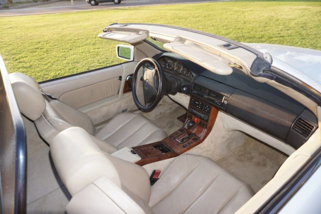 1993 Mercedes-Benz SL600 with 122k miles. Finished in white over a tan leather interior, it benefits from approximately $7k over the last 2 years including the installation of a replacement canvas top, rebuilt convertible lift hydraulics, engine and transmission fluid change, new power steering pump and a tune-up. Power comes from a 6.0L DOHC V12 mated to a four-speed automatic gearbox, and modifications include a Renntech exhaust. Hard top is included. Original seats were replaced with another SL (does not have heating element or adjustable lumbar). Other noted issues inside include a broken top center console, broken driver side sun visor, and some delamination of some of the wood trim. Otherwise in immaculate condition!