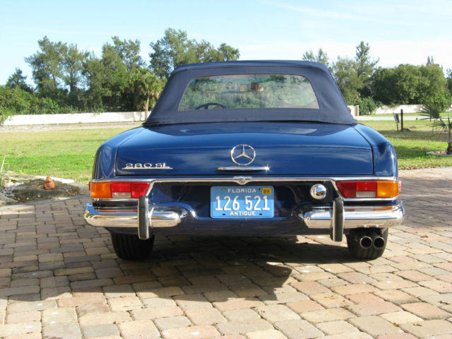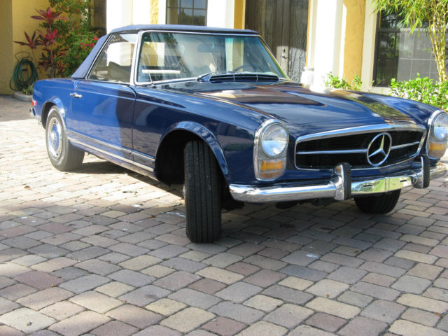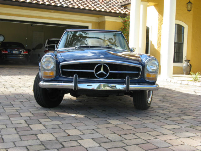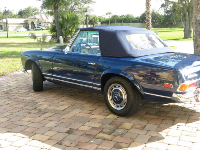 | Up for sale is a beautiful 1969 Mercedes Benz 280 SL roadster. USA version. Rare and desirable 4- speed manual transmission with dealer installed Frigiking A/C (functional) and power steering. This car is a superb high-level vehicle that is a delight to drive. Extensive restoration of an excellent base vehicle (no hit/accidents). The list includes: extensive interior restoration including seat covers/padding/carpets/chrome/glass/ gaskets/radio (original Becker Europa II stereo restored by Becker USA) and clock (original restored by Palo Alto Speedometer in California)/door sills/sunvisors. All service performed by local expert MB service facility. Over $25. 00 invested since my purchase 4 years ago. New tires(Michelin) on original MB wheels/covers (no ugly/incorrect alloy rims) with fresh spare on original rim. New Bilstein shocks. exhaust tip (system itself original/excellent). New brake pads. Original sheetmetal. Paint is original factory color Dark Blue repainted approximately 5 years ago. Very good quality but not show- excellent driver level. Engine is original. Runs beautifully and had recently received valve guide service. Compression excellent. Detailing of engine compartment includes powder coating of cylinder heads and exhaust headers/expansion tank painting. New battery. Just had brand new (not rebuilt) A/C compressor/bushing service that provides for functional and effective air conditioning. Shifting/clutch action is excellent. New brake/gas/clutch pedal covers. New trunk floor (area of notorious rust problem) with factory piece. Has factory jack but not tool roll. New top (matching blue Haartz). Softtop frame excellent. Has factory hardtop in good condition (does have several nicks in chrome trim). Never on car as long as I have owned it. Not sure why somebody would want to put it on as this car is meant to be enjoyed as a convertible. I am probably forgetting a few other items. This is a superb vehicle that is meant to be enjoyed. No trailer/show queen but in need of nothing except a new owner. I have put approximately 1500 miles on the car since I bought it. I am moving on to another project (Porsche 911 SC) and need the space in my garage to pursue this- thus the sale. There are not many out there like this one. It can be used regularly without worry and likely will continue to appreciate in value. Last of the handbuilt MB vehicles and the best iteration of the Pagoda series. PLEASE- serious inquiries only. No trades. PayPal accepted for deposit only. Wire transfer or suitable alternative of balance required; verification of funds will be made before vehicle is shipped. I will assist in shipping; all shipping fees to be paid by buyer. Car can be personally inspected if in the Central Florida region with prior arrangement. Questions? Please ask. Thank you. |
