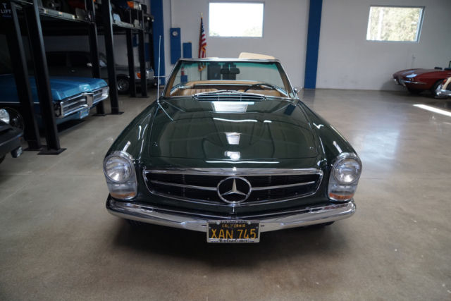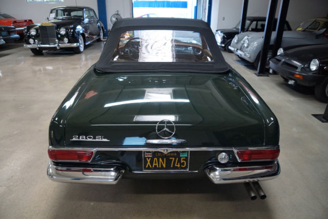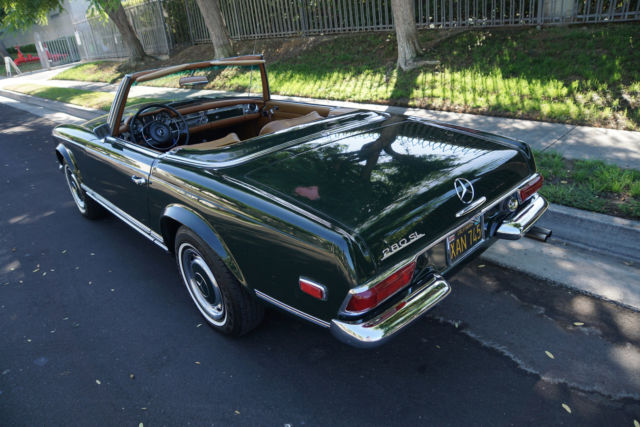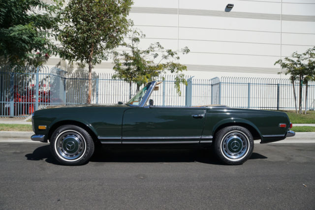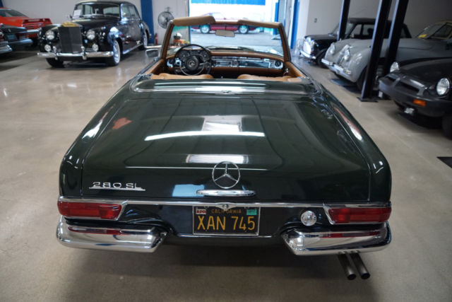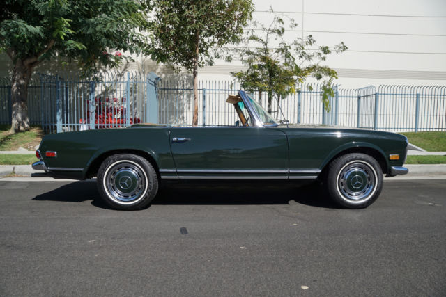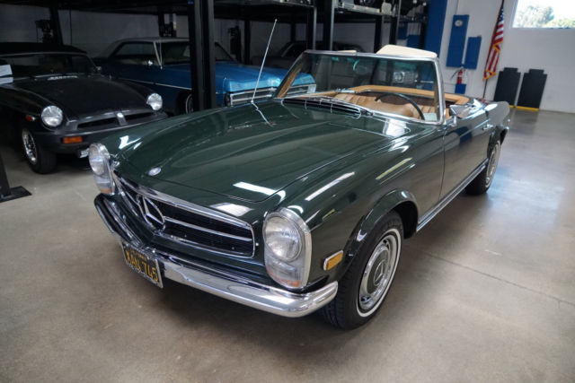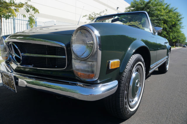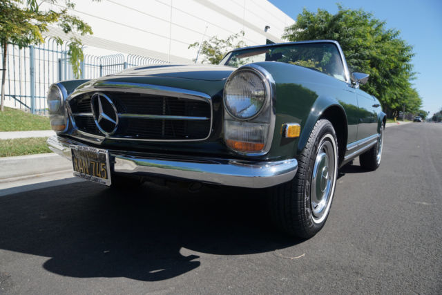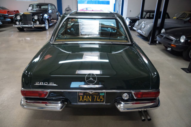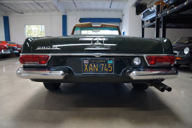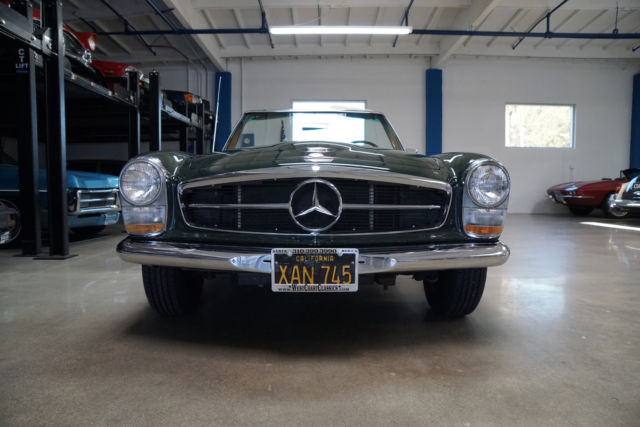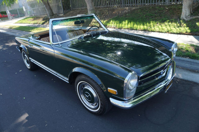 West Coast Classics are proud to present an extremely rare example of this all original California 'Black License Plates' 1968 Mercedes 280SL 'Pagoda' roadster with very desirable original factory options of the 4 speed manual transmission, power steering, power brakes, chrome roof bars, canvas soft top and original factory hard top with all original owners manuals from the original selling dealership of 'Robert Schmitz' of San Francisco, CA and still boasting its all original 'Dark Olive Green' (code 291) factory... color paint and an all original interior with the original hood, original spot welds both on the front fenders and trunk and with obviously therefore no history of any accidents or damage and no rust whatsoever and with believed to be an original 41K miles!This particular example simply must be seen and driven to be fully appreciated - it is a beautiful all original car with its original engine and correct original factory 'Dark Olive Green' (Code 291) color paint which is now obviously beginning to show thin in some areas, especially around the trunk fenders, with it's correct factory and original optional hardtop and matching hubcaps and most importantly a car that has never been hit with all it's original body panels, with original factory spot welds and headlamp notches and it's original factory hood and trunk lid and absolutely no rust ever!The car had a new timing chain and a complete valve job at around 30K miles and it had a recent full service with all new drive belts and oil service, new front & rear brakes and shifter bushings, tie rod assemblys and front and rear shocks. The car therefore drives incredibly well, a super tight driver with the transmission shifting ever so smoothly through all the gears and with the engine extremely powerful yet quiet and smooth.The chrome work is all excellent and the interior is quite stunning with the dashboard perfect and with only the front drivers seat bolster showing any real signs of wear or patina (see photos below)! The correct German canvas black soft top is still in virtually new condition and the correct factory matching 'Dark Olive Green' hard top is also in great shape. The car has a completely rust free history with its original floors and inner and outer sills and original matching number hood.The car is well equipped with factory clock, power steering, power brakes and two tops. The rebuilt engine cranks easily and drives beautifully. It runs cool, has great oil pressure and does not smoke or leak oil. The transmission shifts smoothly through all the gears and the brakes and suspension are superb. The exhaust system sounds great and the car handles beautifully. All the electrics, the lights and the gauges work properly. The trunk has its original spare wheel with correct cover and jack but please note no factory tools.By 1963 the 190SL (Super Light) and the 300SL Roadster were neither Super or Light and the 190SL was simply too heavy to compete with the likes of even the British MG or Triumph and completely underpowered compared to the Austin-Healeys or Jaguars. Mercedes had two choices, either return to the premise of the original 300SL and build another pure sports car or create a new grand touring sports car that would continue the reputation of the SL's as touring cars rather than super racing cars. Mercedes chose the latter with a compromise between the 190 and 300 with the introduction of the W113 platform 230SL which was a two-seat roadster/coupe, introduced at the 1963 Geneva Motor Show and the series was continued through 1971.Like the Gullwing before it, the 230SL had a distinguishing feature which was its removable hardtop with a distinctive dip in its center to offer tall windows to create a better balanced side view and more headroom for passengers getting in and out while still maintaining a low sporty roofline from the front and rear and which earned the car the nickname 'Pagoda' roof. It also proved an efficient way to remove rainwater and channel it away from the car. Top speed was about 115mph which was better than the 190SL but not in the same class as the 300SL.All models were equipped with an inline-six cylinder engine with multi-port fuel injection, power disc brakes on all four corners, adjustable bucket seats, radial tires and an electric clock! The hood, trunk lid, door skins and tonneau cover were all made of aluminum to reduce weight. The comparatively short and wide chassis, combined with an excellent suspension, powerful brakes and radial tires gave the W113 superb handling for its time. The styling of the front, with its characteristic upright Bosch 'fishbowl' headlights and simple chrome grille, dominated by the large three-pointed star in the nose panel, paid tribute to the then already legendary 300 SL roadster.The 280 SL was introduced in December 1967 and continued in production through 23 February 1971, when the W113 was replaced by its successor, the entirely new and substantially heavier R107 350 SL. Over the years, the W113 evolved from a sports car into a comfortable grand tourer and US models were by then usually equipped with the 4-speed automatic transmission and air conditioning. Manual transmission models were much rarer and came with the standard 4-speed or the optional ZF 5-speed, which was ordered only 882 times and thus is a highly sought-after original option today. In Europe, manual transmissions without air conditioning were still the predominant choice.The main change for the 280SL model in 1967 was an upgrade from the 2,496 cc 250SL engine, which itself had been upgraded from the 2,306cc 230SL, to the 2,778 cc (2.8 L) M130 engine with 180HP which finally gave the W 113 adequate power. The wide track and low body of the 280SL offered exceptional handling noted at the time by numerous car magazines and publications.In 1968 some 6,930 models were built with 3,290 of these being exported to the U.S. In 1969 8,047 models were built with 4,102 exported to the U.S. an