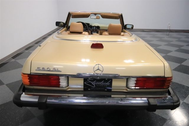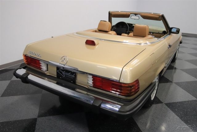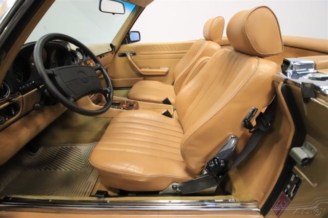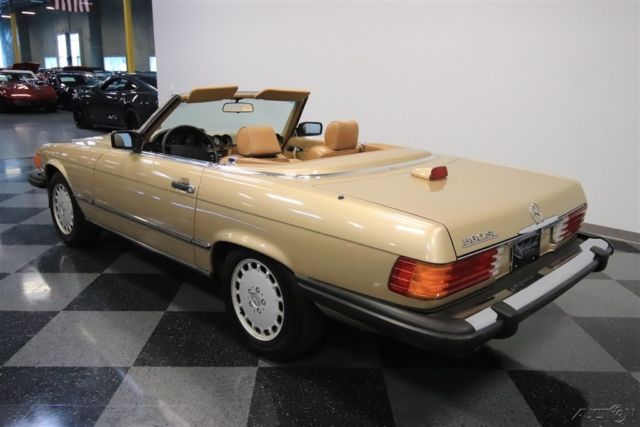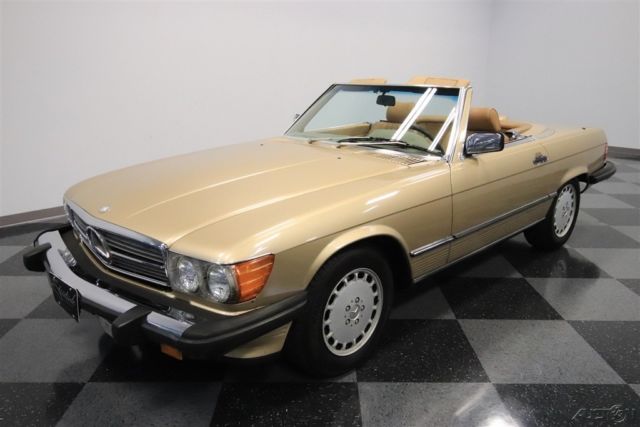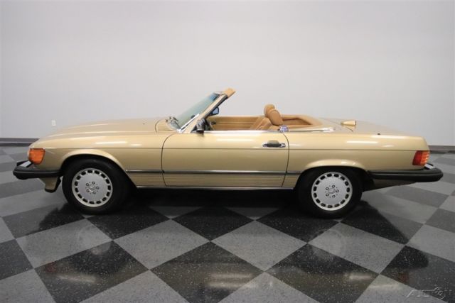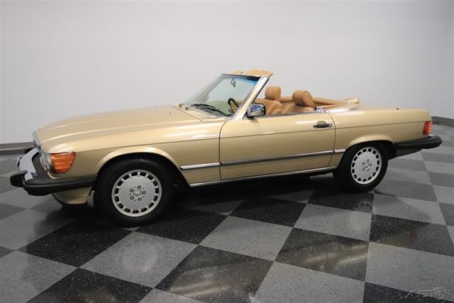Timeless elegance is having a 1986 Mercedes-Benz 560SL in its correct colors and original motor, while also having all the right recent major servicing to keep this a rolling symbol of elegance. That's what makes you fall in love with this car. This is one of the best vehicles for someone who appreciates timeless sophistication with just a hint of flash. The factory-correct Champagne Metallic is understated in its elegance, but it has a shine that nicely complements the mirror-like factory chrome bumpers. It also helps that the body retains its crisp and creased appearance, so all of the bodylines flow uninterrupted over smooth and even panels. Today this quality is also about representing one of the best cars of its era. Very few companies could build a convertible without worrying about safety regulations. Mercedes built their cars so robustly that the R107 exceeded these standards, and they did it elegantly without an unsightly roll bar. It was the go-to driver for celebrities, dignitaries, and the wealthy because the sleek lines hid a full-size interior and usable trunk that was perfect for any road trip. The tan interior has a nice coordinating hue against the champagne exterior, so it's the exact kind of tone you want to set for a premium convertible like this. Plus, there's plenty of real leather and wood to enrich the atmosphere. This has all the right grand touring driving features like power windows, power locks, power steering, an anti-theft system, cruise control, and provisions for automatic climate control. And people who know the R107 SLs will be thrilled to see the original Becker Grand Prix AM/FM/cassette stereo still in place. As we mentioned before, Mercedes was at the forefront of safety, and so this classic has modern features like a driver airbag, high-mounted third brake light, and anti-lock brakes. And while the R107 is the perfect vehicle to keep open to the world, if you feel like buttoning it all up, this example has two nice options. You can use the soft top any time the weather catches you in a pinch, and the color-matched hard top gives this a coupe-like profile. Under the hood is the original numbers-matching 5.6-liter V8 motor that produced about the same power as the contemporary Rolls-Royces. On the road, the R107 has a similar level of elegance as the chassis feels like a comfortable grand touring machine. Plus, we have the receipts to show you that the motor mounts and four-speed automatic transmission were replaced earlier this year to help ensure a smooth driving experience. And because this 560SL also has performance car features like the four-wheel disc brakes and a fully-independent suspension, it has always been in a class all its own. After all, few cars can match its perfect balance of elastic comfort in a tight-handling package. Premium motoring is always in style, and this SL is that ideal way to make elegance affordable. Don't miss this deal, call today!