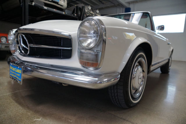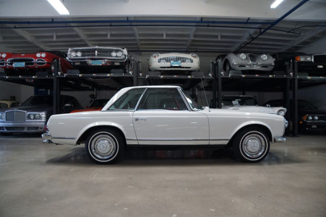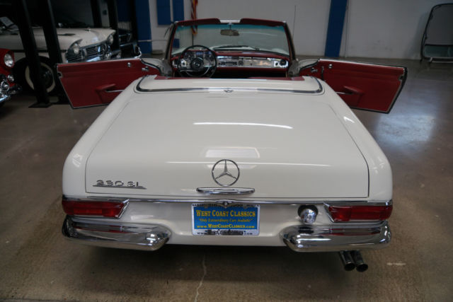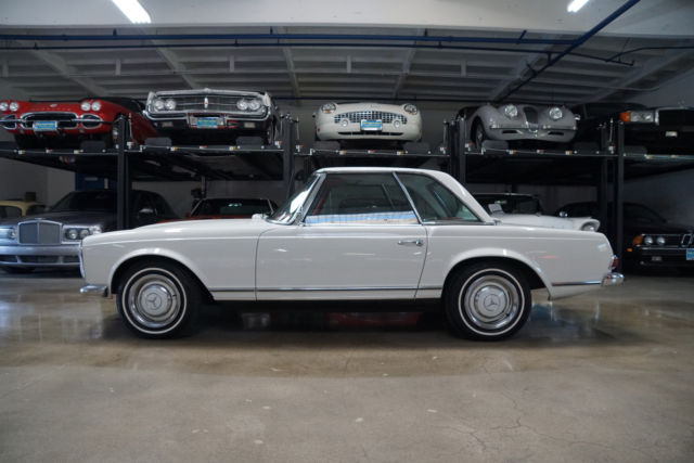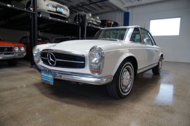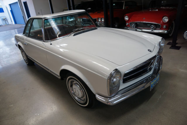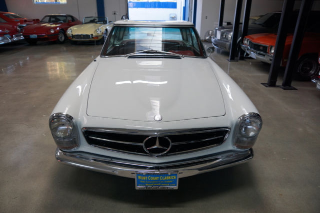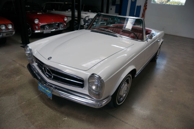 West Coast Classics are proud to present an extremely rare barn find (garage really!) of this all stock and mostly all original 1966 Mercedes 230SL 'Pagoda' roadster in its original 'Papyrus White' (Color code 717G) color paint with a 'Burgundy' leather interior with very desirable original factory options of an automatic transmission with floor shifter, power steering, original 'Becker Europa AM/FM' radio, factory clock, a new German 'Black' canvas soft top and original factory 'Papyrus White' hard top! Recently purchased... from its most recent southern California owners, the car runs very well with no known issues and is an absolute pleasure to drive. There are no signs of any accident damage and no rust. This particular example presents a wonderful opportunity for the Mercedes enthusiast to either collect and enjoy today as a superb example of a very original and stock Pagoda.The original factory 'Papyrus White' (Code 717-G) color paint has been beautifully and professionally repainted in the same color at some point in the recent past and the car still sports its matching hubcaps, the chrome work is all excellent and the original interior is in exceptional shape for its age with all the gauges and switches and levers all in very good shape, the original dashboard and wood is all very good and the car boasts beautiful reupholstered leather seats. The car also boasts its original 'Becker Europa' radio and clock and a brand new 'Black' German canvas factory soft top.By 1963 the 190SL (Super Light) and the 300SL Roadster were neither Super or Light and the 190SL was simply too heavy to compete with the likes of even the British MG or Triumph and completely underpowered compared to the Austin-Healeys or Jaguars. Mercedes had two choices, either return to the premise of the original 300SL and build another pure sports car or create a new grand touring sports car that would continue the reputation of the SL's as touring cars rather than super racing cars. Mercedes chose the latter with a compromise between the 190 and 300 with the introduction of the W113 platform 230SL which was a two-seat roadster/coupe, introduced at the 1963 Geneva Motor Show and the series was continued through 1971.Like the Gullwing before it, the 230SL had a distinguishing feature which was its removable hardtop with a distinctive dip in its center to offer tall windows to create a better balanced side view and more headroom for passengers getting in and out while still maintaining a low sporty roofline from the front and rear and which earned the car the nickname 'Pagoda' roof. It also proved an efficient way to remove rainwater and channel it away from the car. Top speed was about 115mph which was better than the 190SL but obviously not in the same class as the 300SL.All models were equipped with an inline-six cylinder engine with multi-port fuel injection. The hood, trunk lid, door skins and tonneau cover were all made of aluminum to reduce weight. The comparatively short and wide chassis, combined with an excellent suspension, powerful brakes and radial tires gave the W113 superb handling for its time. The styling of the front, with its characteristic upright Bosch 'fishbowl' headlights and simple chrome grille, dominated by the large three-pointed star in the nose panel, paid tribute to the then already legendary 300 SL roadster.The 280 SL was introduced in December 1967 and continued in production through 23 February 1971, when the W113 was replaced by its successor, the entirely new and substantially heavier R107 350 SL. Over the years, the W113 evolved from a sports car into a comfortable grand tourer and US models were by then usually equipped with the 4-speed automatic transmission and air conditioning. In Europe, manual transmissions without air conditioning were still the predominant choice.This car must be truly be seen and driven to be fully appreciated - the engine is extremely strong and responsive with excellent oil pressure and which sounds absolutely magnificent, the automatic transmission shifts smoothly through the gears and the engine temperature always remains cool.This is a very fine example of this highly collectible 1966 Mercedes 230SL roadster in turn-key ready shape for daily appreciating and daily head-turning driving today!
