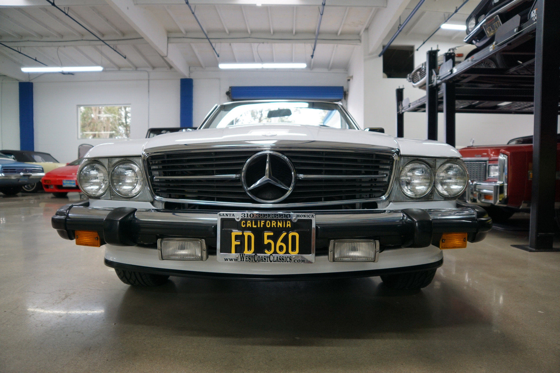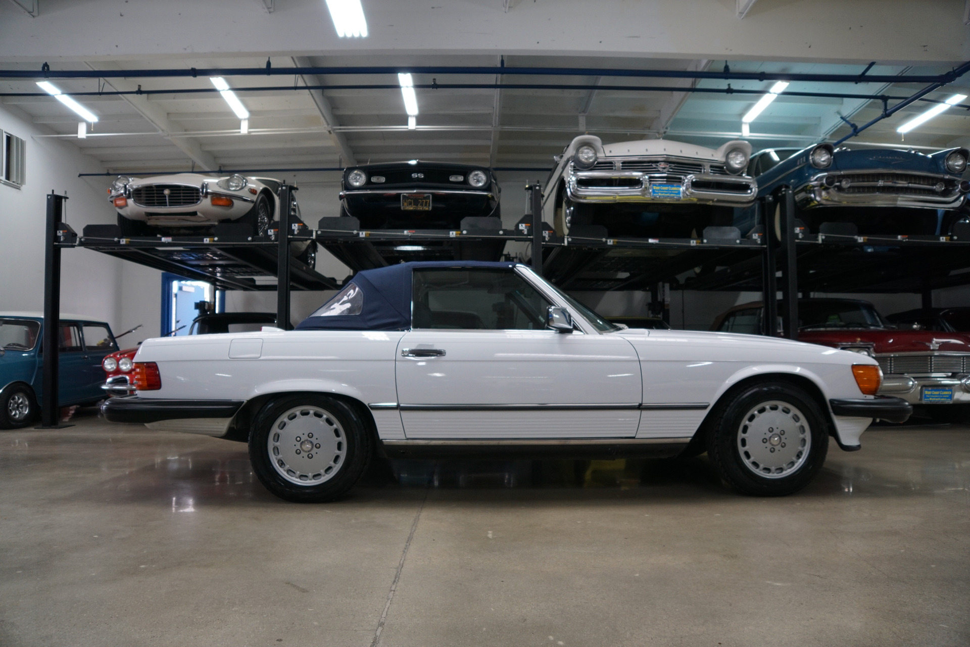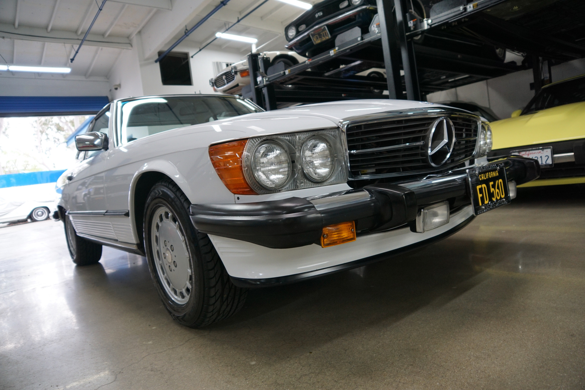 West Coast Classics are proud to present an absolutely exceptional and beautiful example of this original California 1986 Mercedes-Benz 560SL roadster in its original factory 'Arctic White' (Code 147) color paint with a gorgeous 'Dark Blue' leather interior (Trim code 272), it's original German canvas factory matching Dark Blue soft top, factory alloy wheels, matching factory hard top and 71K original miles! The car's factory options include: 5.6 liter OHC V8 engine, automatic transmission with torque converter, supplemental restraint system,... anti-theft alarm system with radio theft deterrent, power assisted steering, cruise control, tinted glass, electric window lifts, electrically heated rear window on hard top, fully independent suspension, power assisted four wheel disc brakes, anti-lock braking system, light alloy wheels, limited slip differential, leather upholstery, adjustable bucket seats and head restraints, front center folding arm rest, leather covered steering wheel and gear selector, automatic antenna, Aerodynamic Halogen Head & Fog lamps, first aid kit and air conditioning with automatic climate control, original 'Becker Grand Prix' radio/cassette and central locking.Obviously always garaged with a clean CARFAX report with the original factory 'Arctic White' color paint in virtually flawless condition and with an also beautiful condition 'Dark Blue' leather interior. The car has it's original 'German canvas' factory Dark Blue soft top which is still in as new condition.The car drives exactly like such a well maintained and serviced Mercedes with only 71K original miles should and must be seen and driven to be truly appreciated! Without a doubt, this must be one of the very finest example's available anywhere of this classically beautiful roadster design, probably the last classically beautiful convertible series Mercedes will ever build and now becoming more desirable and collectible than ever before - certainly you will look long and hard to find a finer head-turning example with available anywhere else.