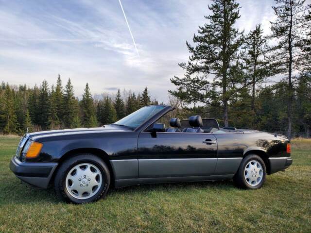 This 1995 Mercedes-Benz E300 cabriolet was purchased new atVancouverand stayed in BritishColumbiauntil the third owner brought to Alberta. Finished in black over black leather, this soft-top convertible ispowered by a 3.2-liter inline-six mated to a four-speed automatic transmission. The wiring harness was reportedly replaced four years ago, and the battery was renewed two years ago. The brake work has been done recently.Now showing 154000km original miles. This W124 is offered for sale in Edmonton Alberta, by the the owner with two keys, the window sticker, a tool kit, factory books, service records, and a clean title.The car is in really good condition runs verysmoothly . The car waswell taken care over the years. Was used only as a summer car and stored in winter. The body is very clean no dent orscratches or any rust. Convertible top open and closes properly the way should be. The only concern is drivers seat belt does not retract.Bid with confidence you want be regret for thisGermanbeauty.