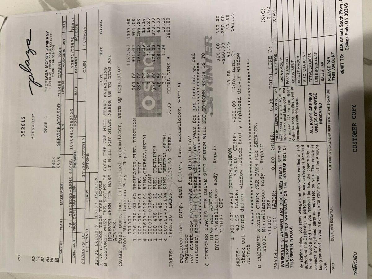 | 1979 Pale yellow exterior in great shape, No rust. newer Michelin tires. Convertible top in good shape. Hard top included. Mercedes dealer tune up 2/2019 included new fuel pump, fuel accumulator, and warm up regulator. Receipt attached. Newer stereo and speakers. Under 74k miles. |