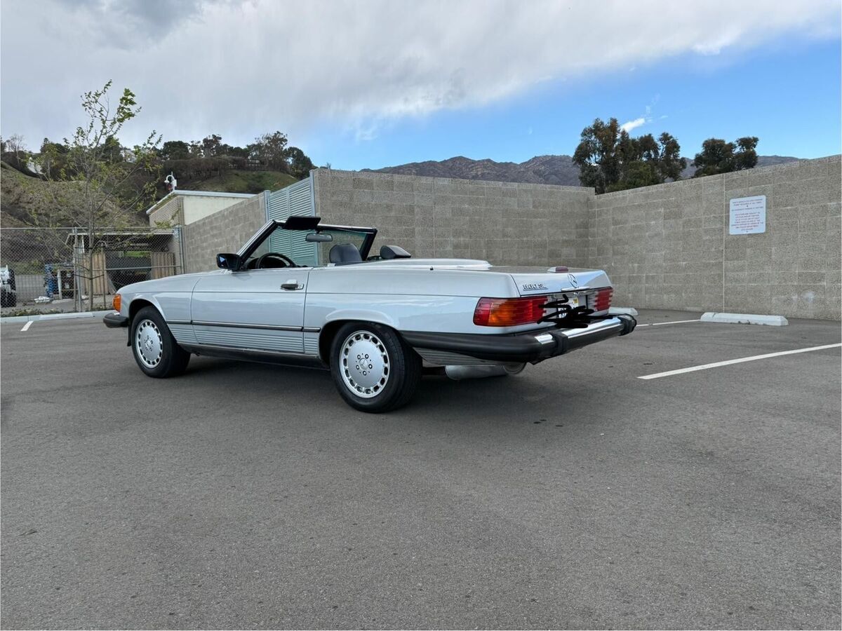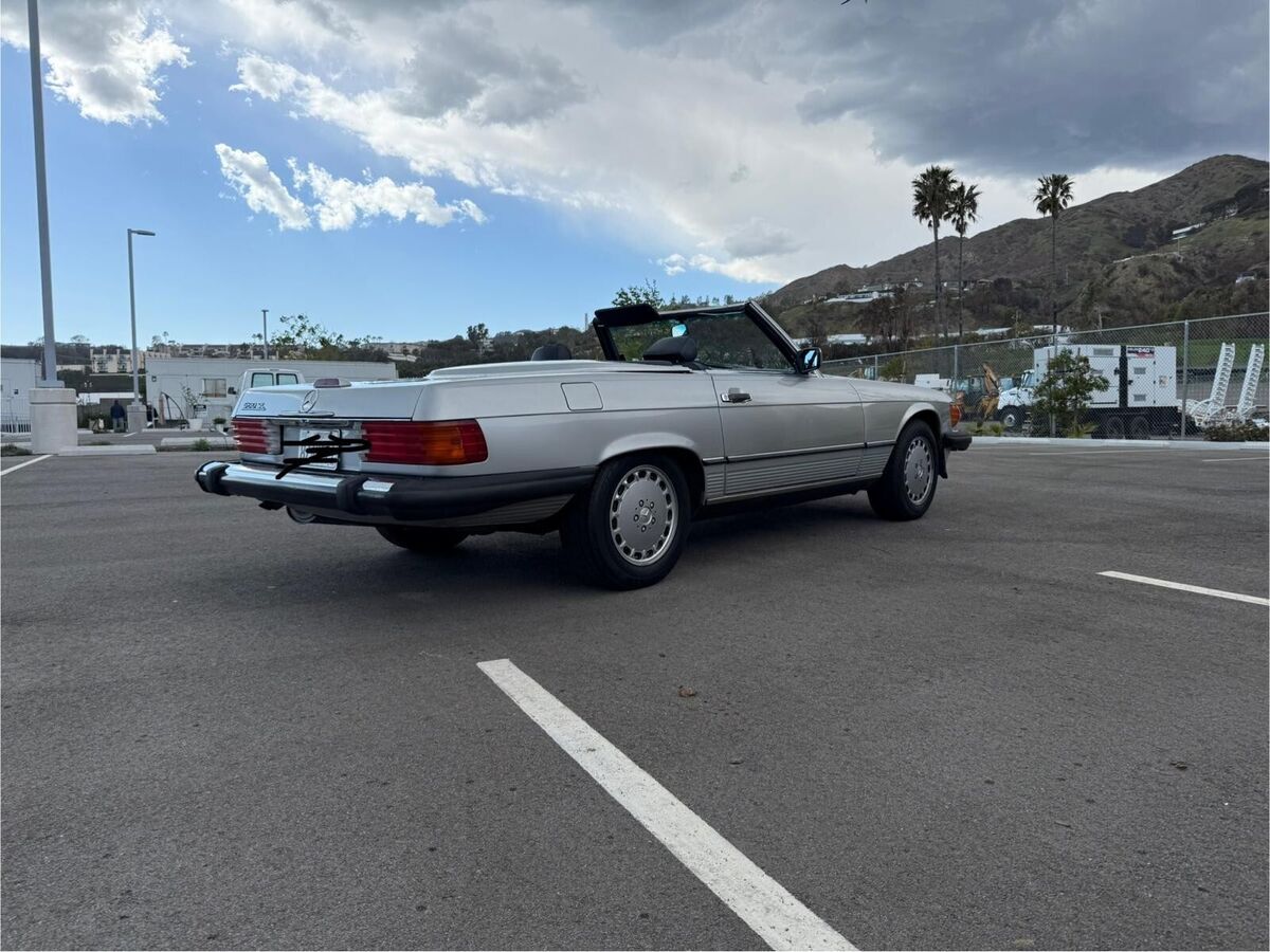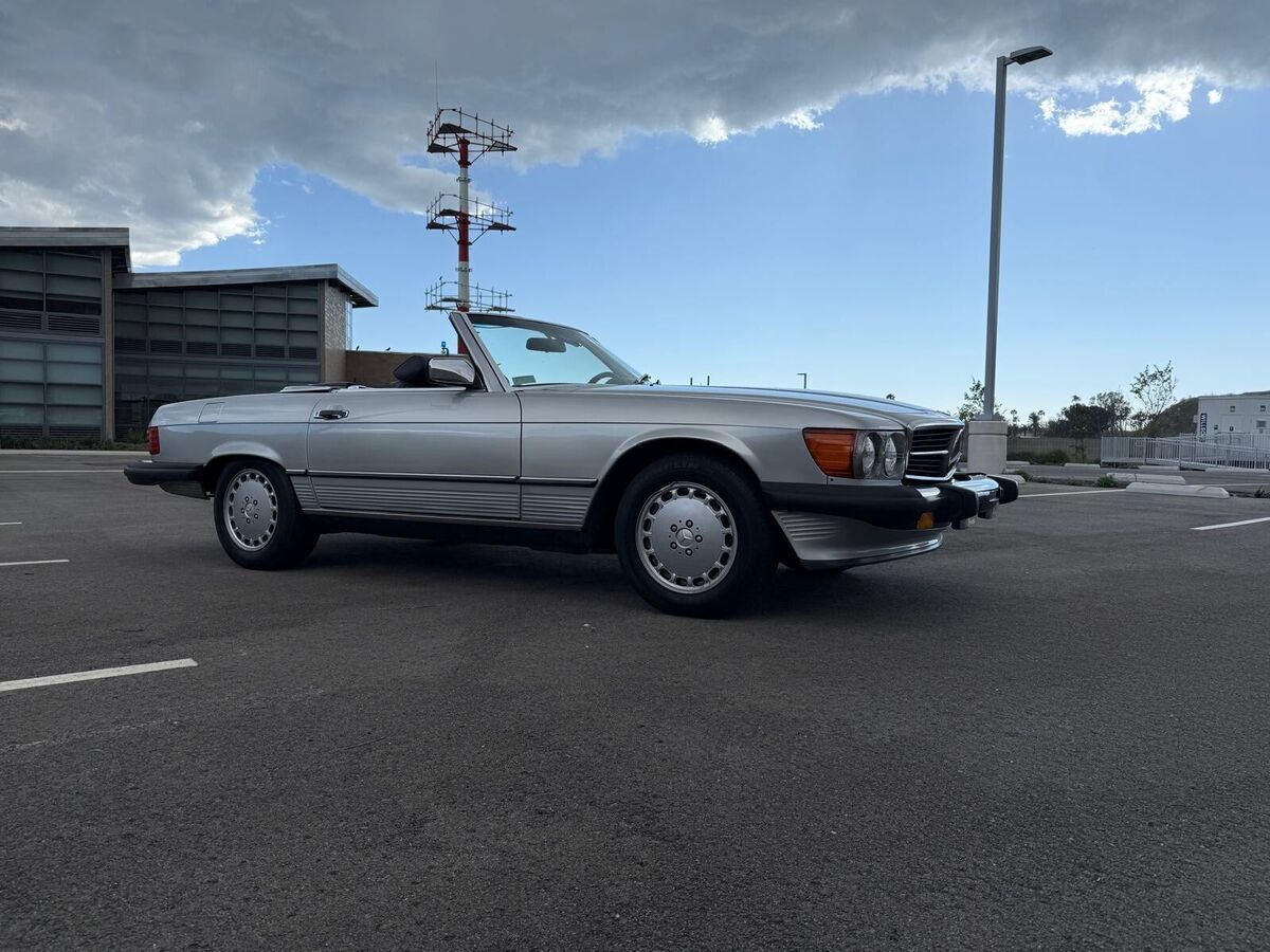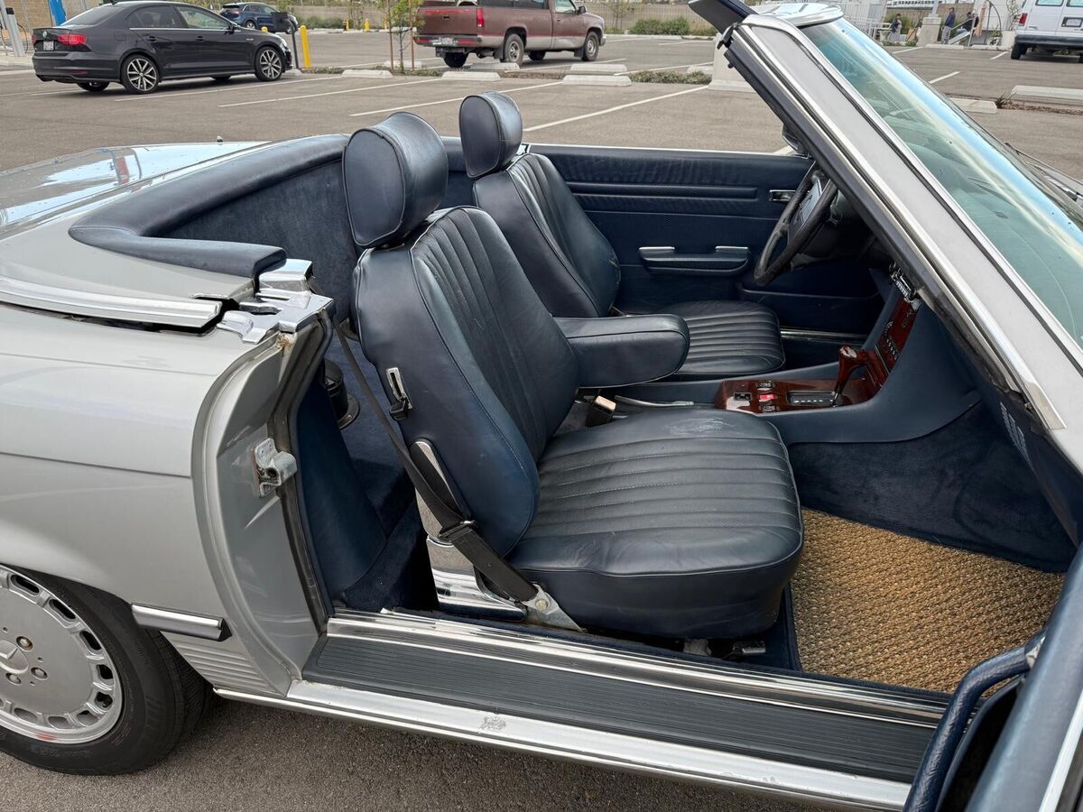 Stunning 1988 Mercedes-Benz 560 SL with a silver exterior and navy blue interior. |