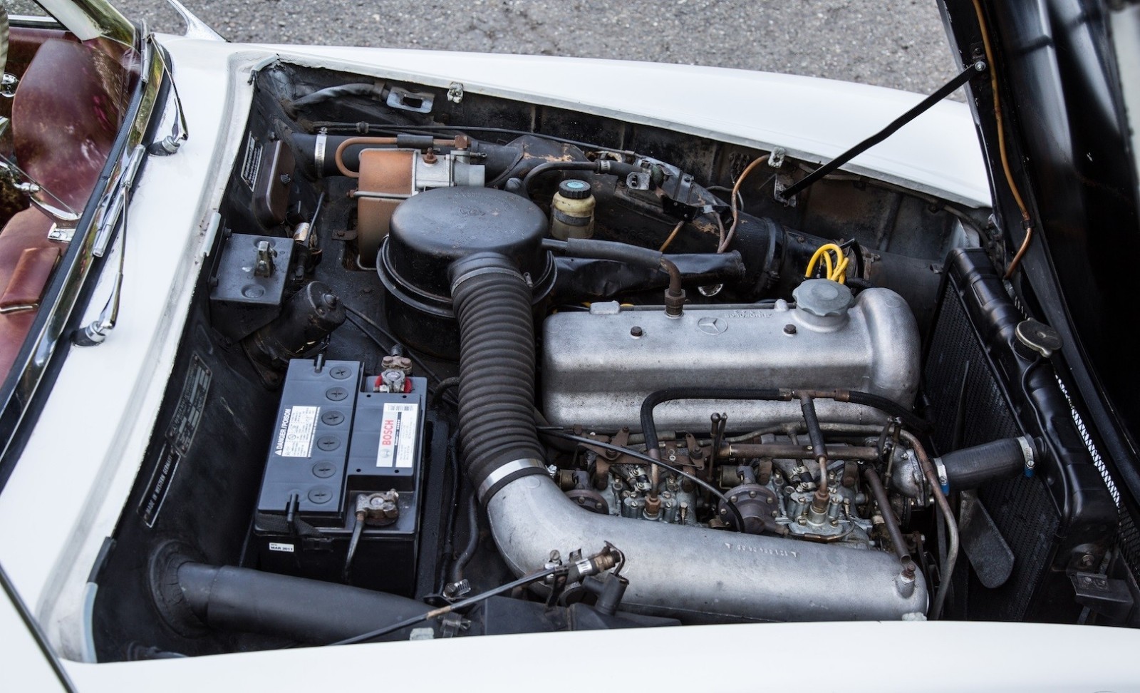 good Vehicle Details This 1959 Mercedes-Benz 190SL, in excellent condition, has been driven occasionally and has been garage-maintained. Power is provided by a 1.9-liter inline four-cylinder engine mated to a 4-speed manual transmission. Maintenance performed has included a new shifter assembly and battery, a brake service, and regular oil and lube service. It has been previously repainted and includes a black hardtop with a checkered headliner. A compression test showed 155 to 165 psi on all four cylinders. This car is in excellent shape, the engine has strong traction, and the transmission shifts well. |