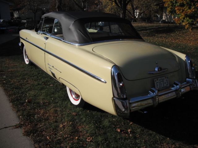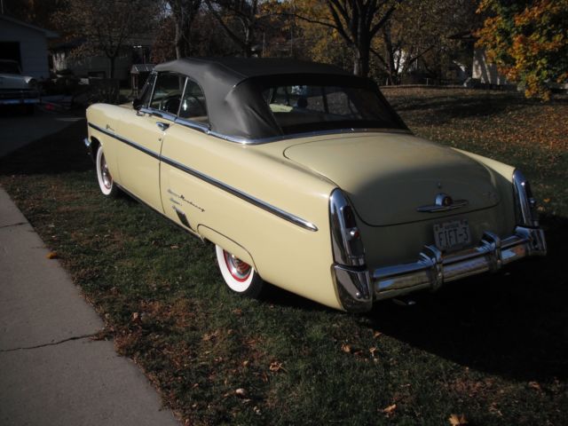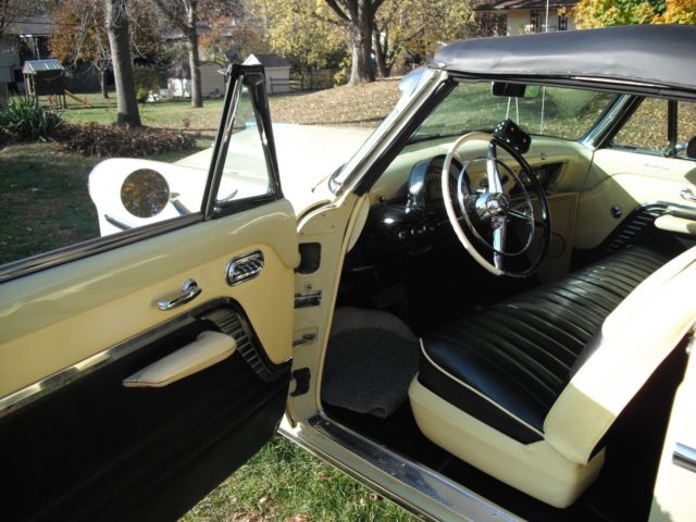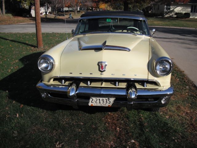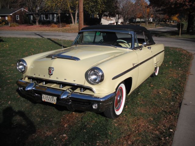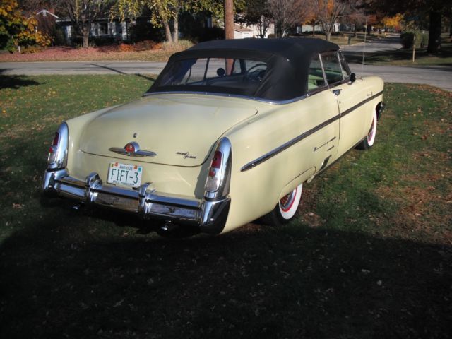 black top, ery solid body, 1,000 miles, riginal 255 cu in flathead engine, erco-matic transmission, onverted to 12 volt, ompletely rewired, ffenhauser aluminum heads and intake manifolds, odern holley 4 brl carb, enton exhaust headers, ual exhaust, lass pack mufflers, reat sound, lectronic ignition, ew radiator, p-dated cooling system, ransmission cooler, ll mechanics are excellent, rive anywhere with confidence, ood radial wide whitewall tires, restored full wheel covers, ll new yellow and black vinyl interior, ice dash and gauges, estored and painted top bows, ood clear vinyl rear window, ower windows, adio and cd player in glove compartment, tereo speakers in kick panels, ll glass and window frames good, utside door handle stainless fingernail guards, ocker panel moldings, xcellent chrome bumpers and stainless, are accessories: 1 deluxe steering wheel, chrome headlight rings 3 stainless outside windshield visor 4 mercury tissue dispenser. solid frame, loor pans and rocker panels. 8 or 10 year old frame off restoration. you will not be disappointed you will be impressed. the car looks fantastic and runs perfect. the latch on the vent window on the drivers door is broken it needs a new part, the taillight lens on the passenger side is warped new ones can be purchased and are not very expensive. on the very bottom of the rocker panel on both sides located just behind the rear edge of the door where any moisture drains from the rear quarter panel the drain hole is enlarged to approximately 1 and 1/2 inch long and 1 inch wide from draining moisture. It is not visible unless you lay on your back and look up. It is well below the rocker panel trim. there is no other rust spots anywhere on the rocker panels. the top motor is not working and the top is put up and down by hand. where the top attaches to the rear quarter panel the top went down too fast one time and then very front corner of the top slightly pulled away from the qtr panel. The piece on the inside that fastens the top down can be loosened and the corner pulled back into place.