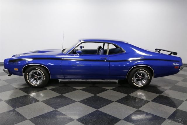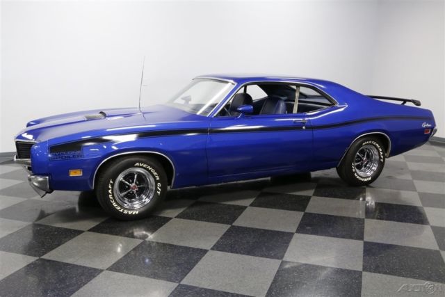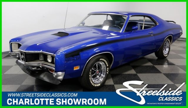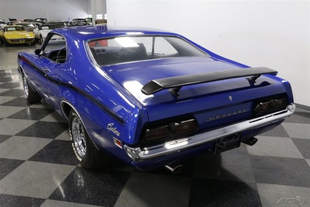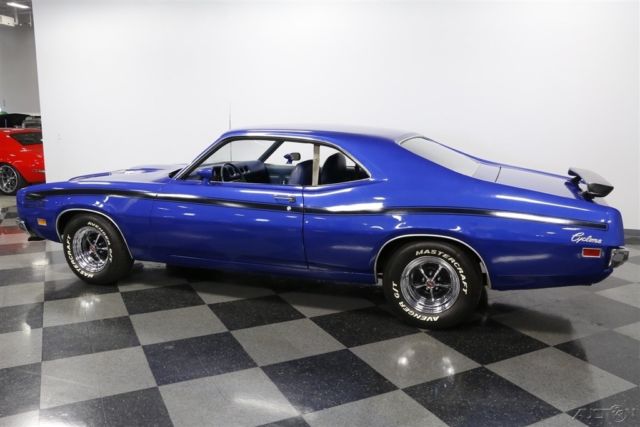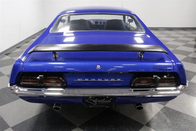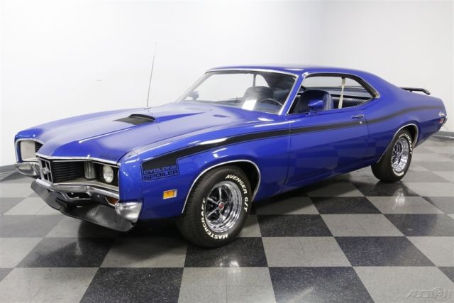 How about some American muscle that's big, bold, and rare? This 1971 Mercury Cyclone Spoiler tribute car has all the right features to grab attention on the outside and plenty of V8 power under the hood. The Cyclone was Mercury's version of the Torino GT. That meant it shared some seriously large power, while having its own unique styling and Mercury's lower production numbers. Competing with the likes of the Buick GS and Plymouth GTX, the Cyclone had to look the part, and this is one mean muscle car. From the aggressive hood scoop and gunsight grille, to the semi-fastback profile with subtle fender flairs, it was built to intimidate. The slick blue paint lets the bright work really shine in places like the large chrome bumpers and Mag wheels. Plus, true to the "Spoiler" name, this tribute has aggressive spoilers in the front and rear. It even has the upgraded to the package-correct striping and exposed headlights. So you're sure to turn some heads in this correct and total package. Inside, it's all about Mercury's blend of luxury and performance. The sea of blue continues with the factory-correct interior that can comfortably seat up to four more along with you. The bucket seats have insignia textured inserts that give it a much more upscale look and feel. The driver gets a Ford's dual-spoke steering wheel that gives an unobstructed view of the extra wide speedometer. Plus, this upscale performance car is driver-dominant with all the essential gauges at eye-level across the dash. This includes a large tach that goes especially well with the Hurst shifter. Under the hood is exactly what you want to see in a muscle machine like this. Not only is it Ford's hardy 351 cubic-inch V8, but also it has been upgraded with a Holley double pumper four-barrel carburetor, Edelbrock intake, MSD ignition, and a growling H-pipe dual exhaust. Best of all, you have complete control over this V8 and its thunderous soundtrack with the four-speed manual transmission. Plus, with power steering and wide raised white-letter tires, this is a Cyclone that says firmly in control. Rare, beautiful, and impressive, this Mercury Cyclone Spoiler tribute packs an upscale punch that will make Ford fans smile everywhere it goes. These are always popular, so don't miss you chance. Call now!