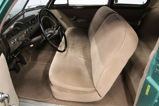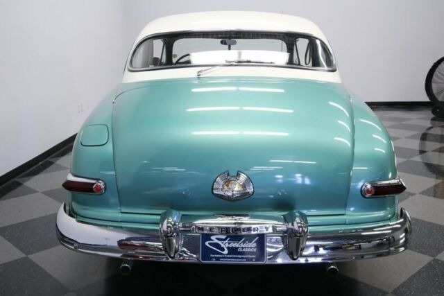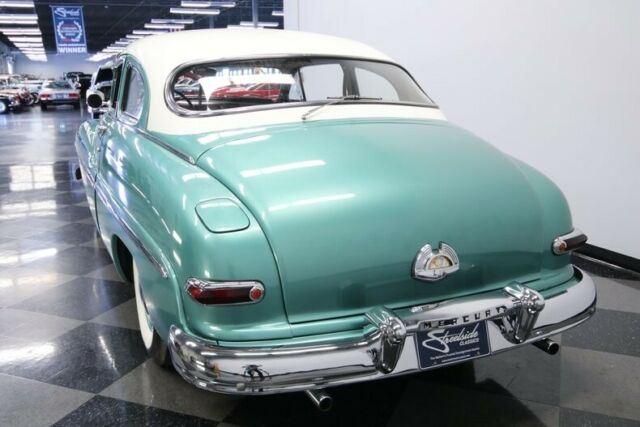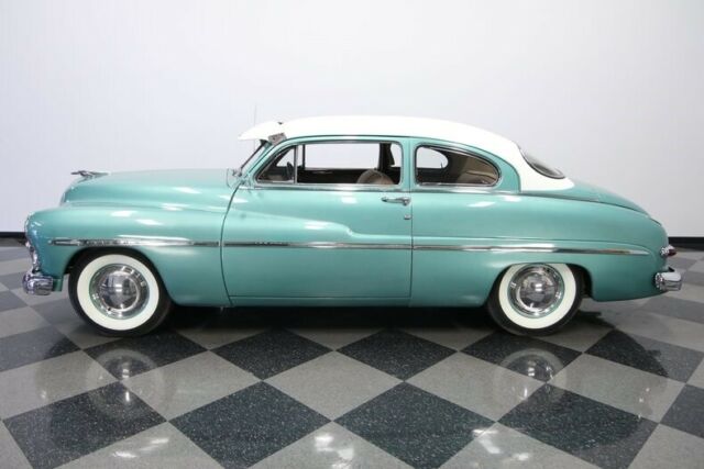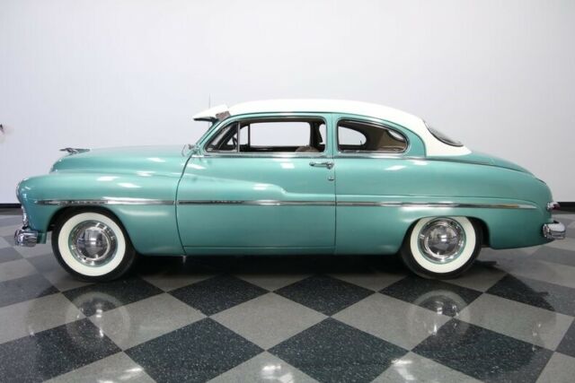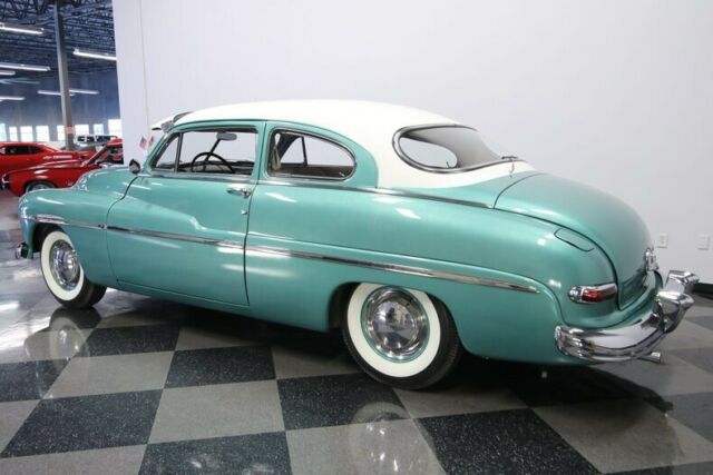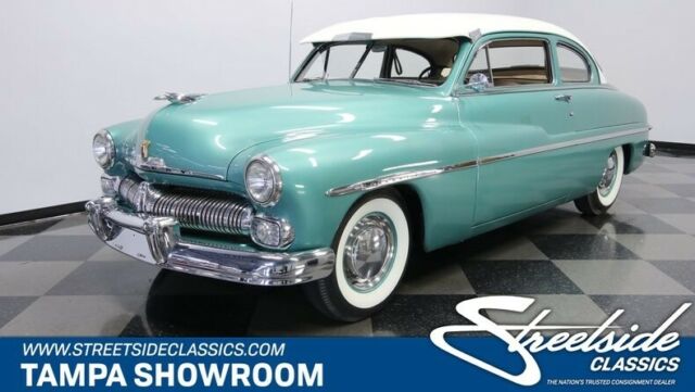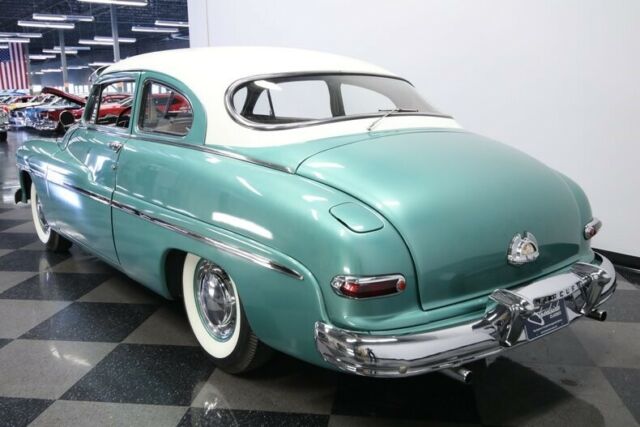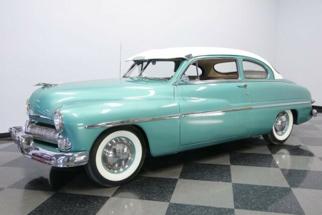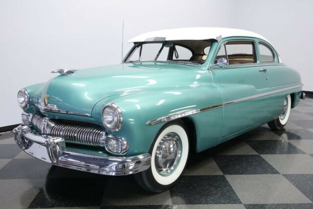 Here's a minty green 1950 Mercury coupe with serious personality, V8 power, and loaded with cool/rare options. It's such an interesting car it spent nearly a quarter-century as a museum piece! This is the legendary series that everyone loves to make into hot rods, so it's even more impressive to find a well-preserved/restored example that loves to shine like nostalgia. It follows close to the factory-correct Maywood Green, but now it has a nice metallic element that loves... the light. In fact, this one is all about looking good. This coupe was in a Texas museum from 1995 until this year, and so it loves being a showpiece. Spending time in the spotlight also means the brightwork looks great. The bumpers are mirror-like, the grille has an intricate electric shaver look, and the full-length side trim almost looks unbroken across the straight body panels. Plus, the white roof and wide whitewalls make for a subtle two-tone. And while you're looking at the white parts, don't forget to spot the coordinating sunshade. While that's a cool and rare 1950s option, an even rarer one is the rear window wiper that's on display! The two-tone tan interior is more of that pure 1950s cool. And you'll love details like the striped inserts in the cloth seats. Even the trunk looks period-correct, right down to the mat and whitewall full-size spare. Like any good American cruiser, there's plenty of room to share the experience with family and friends. It has a terrific time capsule like presentation with the bright dash that even has the original AM radio is still on display. But in these Mercurys the driver really was the king. That's why you not only got the artful steering wheel and speedometer, but also all the essential controls â€" including lights and heater â€" were just a finger's length away. Under the hood is exactly what you want to see â€" Flathead V8 power. Mercuries were popular, because these 255 cubic-inch motors had extra displacement and extra torque over what was available at Ford during the time. And this legendary powerhouse looks authentic, right down to the oil bath air cleaner and bright blue block that almost matches the exterior paint. And while this was a museum piece, the fresh look of the belts, wires, and hoses tell you this has been treated correctly. And the way it fires up eagerly affirms it. This V8 makes a nice sound out of the glasspack dual exhaust, and you have the added control of the classic column-shifted three-speed manual transmission. Plus, there's Touch-O-Matic overdrive â€" another rare option. Complete with owner's manual, this is the coupe you want if you're looking to turn your garage into your own museum. So if you love a classic stunner, call today!