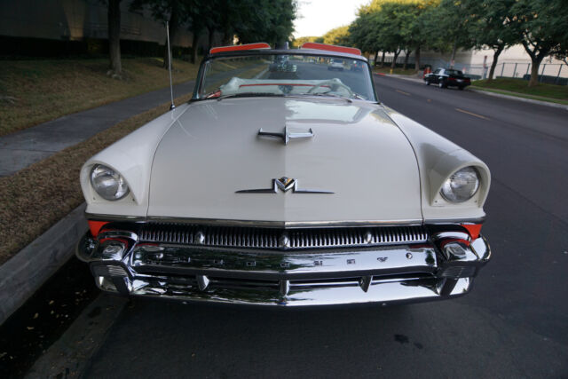 West Coast Classics are proud to present an absolutely exceptional comprehensive frame off restoration and completely rust free and restored with great attention to detail example of this 1956 Mercury Montclair Convertible with its 312 CI V8 engine in beautiful and striking 'Flo-Tone' two-tone color combination with a gorgeous matching interior. The car had factory options including the 312 V8 engine, a Merc-O-Matic automatic transmission, vinyl upholstery, power top, electric clock, horn ring, chrome window surround moldings, full length body side stainless trim, rear fender skirts, rocker panel moldings, heater & defroster, signal seeking AM radio, power steering, tinted glass, 4-way power front seat, padded instrument panel & seat belts, power windows, road lamps, hubcaps and whitewall tires! The legendary Mercury Monterey coupe was forever immortalized in 1949 by James Dean in 'Rebel without a Cause' and then the following year was chosen as the official Pace Car for the Indianapolis 500, and with good reason - big, imposing and expensive and a standout amongst 1950's American cars for both exceptional and unique styling and sound engineering and performance, coupled with solid construction and a high quality fit and finish, the Mercury Monterey was a top-of-the-line sub-series in 1952 before becoming a line of its own for 1953-54. Ford's flathead V8 continued until 1954 with the company's introduction of the all new 292 'Y' block overhead valve V8 with a five-main-bearing crankshaft and a standard 4 barrel carburetor, also to be used in the Ford Thunderbird. The Monterey was available as a convertible, sedan, a pillar-less coupe and station wagon. The Mercury Montclair was to supersede the Monterey as the top-of-the-line Mercury model and was first introduced in 1954 and would continue being a stand out amongst early '50's cars for their exceptional styling and sound engineering. They offered a lot of new features and upgrades which were introduced to distinguish the new '56 models such as a 12 volt electrical system and an array of new options that could now be supported by the the higher voltage. New styling features included Mercury's best trim and a revised bumper and grille with the vertical bars of the lower section appearing to show above the center bar, as well as a newly designed front bumper with a blunt end, as opposed to the bullet style point on the '55 Mercury. The Mercury name in block letters was moved from the hood to the center bumper bar and on the hood a large 'M' emblem was used as part of the 'Big M' marketing theme most notably with the introduction of the larger V8's with more power. Hooded headlights and and a jet style hood ornament continued. Body side trim was changed to a full length lightning bolt style piece on all but the wagons. Introduced by Lincoln some years earlier was the striking image of a visible rear spare wheel resting on the trunk lid and extended bumpers, otherwise known as the optional "Continental kit". This option was welcome since it refined the look of the Mercury without overbearing its classic lines which until 1956 deliberately ignored the fifties fashion for fins, making it a very unique looking car for its era. This particular example is exceptionally rare and unusual, firstly as an obviously stunningly frame off rotisserie restored example with no expense spared with beautifully razor straight sheet metal with no signs or history of any accidents or rust ever and with the undercarriage looking as new as the body. The car has a beautiful and obviously very professional repaint in a striking two-tone color paint scheme and has a beautiful matching two tone vinyl correctly restored with correct original material interior including piping etc and with all its original factory instrumentation intact including the original 'AM' signal seeking radio, all of which are is in quite exceptional and original specification condition throughout. All the chrome has been re-chromed and the car's original 312 V8 engine and the transmission was reportedly rebuilt at the time of the restoration. As you would expect from such a comprehensive frame off restored example all the options are working as they should and the 312 V8 engine is extremely strong and powerful and sounds absolutely magnificent with this particular car also driving absolutely magnificently - must be driven to be believed - does not miss a beat and purrs like a kitten - drives straight as an arrow with no strange road wobbles, shakes or rattles - a truly remarkable daily driver that will give any modern day car a run for it's money! The transmission shifts smoothly through the gears and the car is an absolute pleasure to drive! This is an extraordinarily rare opportunity to own a superb frame off restored with no expense spared example of this true American classic - a top-of-the-line 1956 Mercury Montclair Convertible in a very striking two-tone color combination and beautiful matching interior! A true all American classic car, an essential addition for the Ford/Mercury collector or simply any classic car enthusiast to enjoy today with burly good looks and just the right amount of tasteful period flash matched to a modern powerful V8, long underappreciated, with convertible models in particular being of low production to begin with and now obviously very scarce and thin on the ground, collector values are rising fast, with not too many having been saved over the years, and very few, if any, in this kind of show ready quality condition! |
