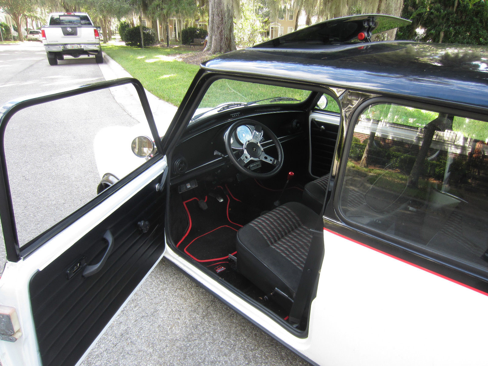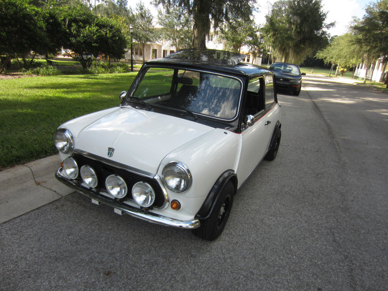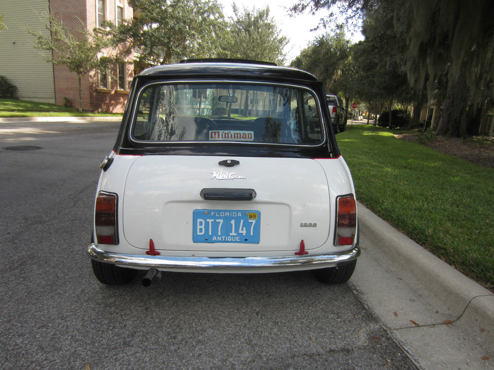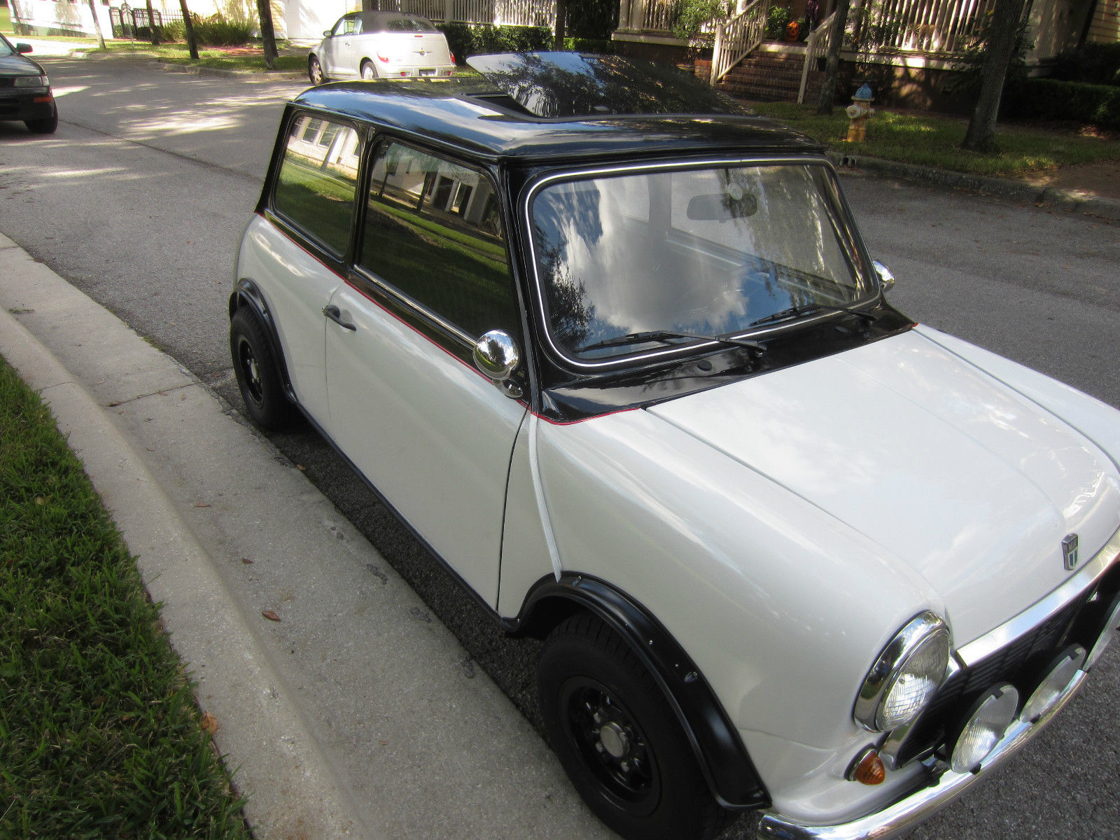 | When I bought this beauty I thought it was for life but things change. It was rebuilt by Dion Jardone of DJ's Minis in Wesley Chapel. Florida. If you go to the website I think there are still pics of this car under construction. It was finished in April 2014. I followed the construction from shell to the finish. The paint job is black on white separated by a thin red stripe. The top color comes down to below the windows which was a style available in the 60's. Stage 1 exhaust system. Rod change gearbox 3. 44 diff. Drum Brakes. It drives. brakes. shifts and steers perfectly. Body and interior are perfect. 1000 cc A+ engine with scoots around. Easily a daily driver. Central speedo with two gauges. Seats are used but you cannot tell it. Alloys with new tires. Suspension sealed and painted. New brake lines. master cylinders and shoes. Wonderfully sound when you hit the gas. Stunning car with sunroof. Please ignore mileage above as it is just what is on the odometer. I cannot say it is accurate. |