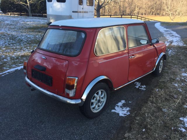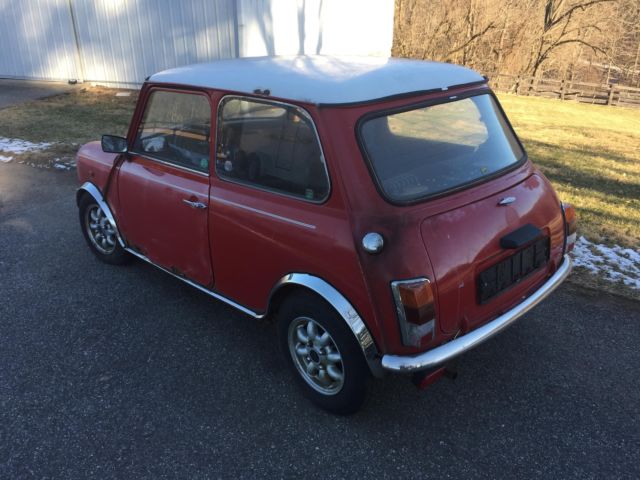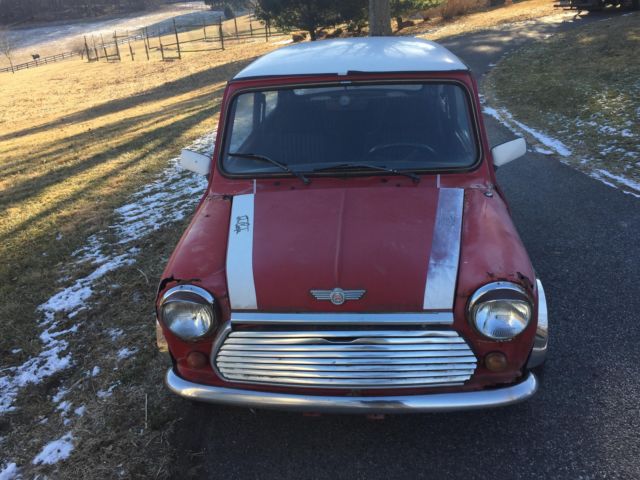 We believe this to be an early edition 1991 Mini Cooper. You are buying it as is, where is for parts or as arestoration project. It will come with bill of sale only! You can apply for a title...cost is $550........ IT NEEDS..... 1)Radiator support 5) front fenders 2)front floors 6) Muffler 3)D/S door 4)front facia, All these parts cost $1200, the door is $800, all the rest is only $400. If you can get a used door great! The engine turns over with a good battery, we decided not to put gas in it without checking for tank contamination first. The interior looks almost new, all seats are recovered and in good shape, carpet is all there, most of the wood trim is good, some of it on the dash is bad. Glass is all good, so are tires, wheels (5 of them), etc. This is close to being parts only, but we hate to not give it one more chance at LIFE! Not many of these real ones around, especially ones from the 90's. We can help with shipping, NO RESERVE....HIGH BID WINS........!!!